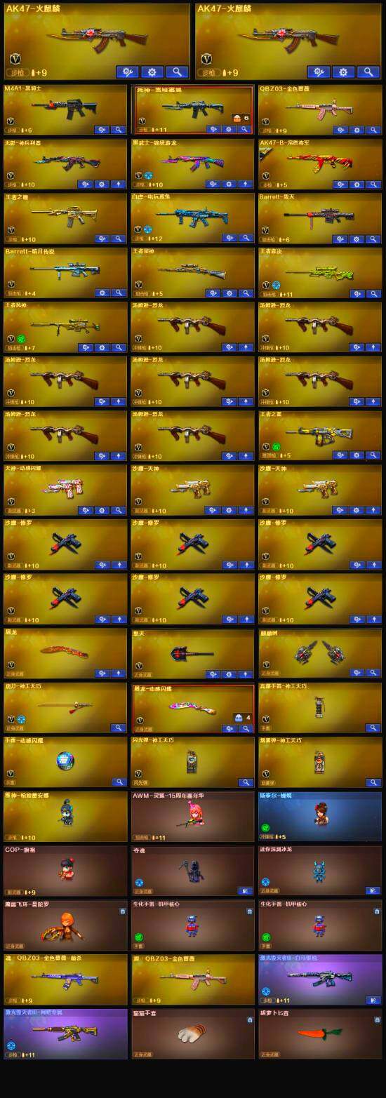 【英雄级武器】:唐刀-神工天巧,天神-动感闪耀,屠龙-动感闪耀,手雷-动感闪耀,QBZ03-金色蔷薇,白虎-电玩蓝兔,无影-神兵利器,M4A1-黑骑士,汤姆逊-烈龙*7,AK47-火麒麟*2,Barrett-毁灭,黑武士-锦绣游龙,死神-雪域霜狐,AK47-B-常胜将军,M4A1-赤狱骑士,沙鹰-天神*2,沙鹰-修罗*6,麒麟刺,擎天,屠龙