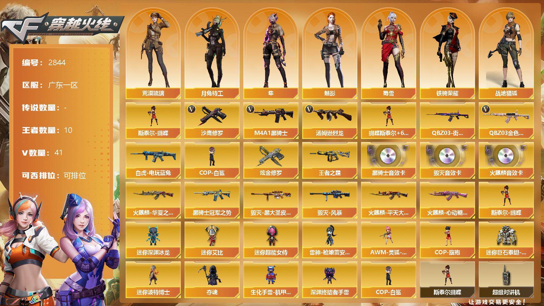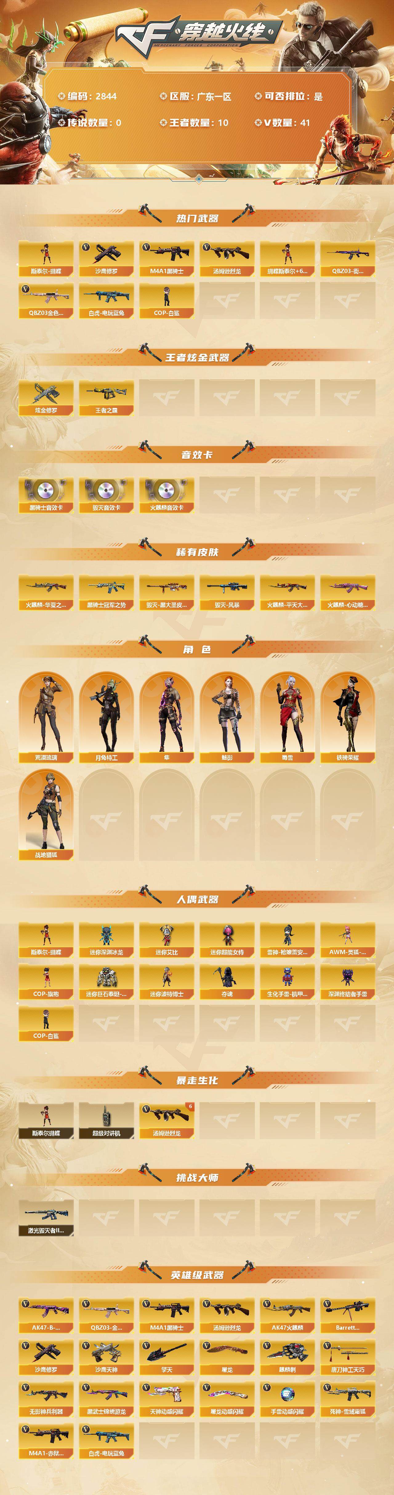 [12865142]广东一区-41V-10王者-1炫金 【热门武器】:QBZ03-金色蔷薇,白虎-电玩蓝兔,QBZ03-街机,M4A1-黑骑士,汤姆逊-烈龙*7,斯泰尔-蝴蝶,COP-白鲨,沙鹰-修罗*6 【王者炫金武器】:炫金修罗,王者之霆 【音效卡】:AK47-火麒麟音效卡,M4A1-黑骑士音效卡,Barrett-毁灭音效卡 【稀有皮肤】:火麒麟-华夏之心,火麒麟-平天大圣*3,火麒麟-心动糖果,黑骑士-冠军之势,毁灭-黑大圣皮肤,毁灭-风暴 【角色】:魅影,月兔特工,荒漠琉璃,隼,战地猎狐,蜀雪,铁骑荣耀 【人偶武器】:COP-白鲨,斯泰尔-蝴蝶,雷神-枪娘蕾安娜,AWM-灵狐-15周年嘉年华,COP-旗袍,迷你深渊冰龙,迷你艾比,迷你超能女侍,迷你巨石泰坦-魔花研究所,迷你波特博士*2,夺魂,生化手雷-机甲核心*2,深渊终结者手雷 【暴走生化】:斯泰尔-蝴蝶,超级对讲机 【挑战大师】:激光毁灭者III-白马银枪 【英雄级武器】:唐刀-神工天巧,天神-动感闪耀,屠龙-动感闪耀,手雷-动感闪耀,QBZ03-金色蔷薇,白虎-电玩蓝兔,无影-神兵利器,M4A1-黑骑士,汤姆逊-烈龙*7,AK47-火麒麟*2,Barrett-毁灭,黑武士-锦绣游龙,死神-雪域霜狐,AK47-B-常胜将军,M4A1-赤狱骑士,沙鹰-天神*2,沙鹰-修罗*6,麒麟刺,擎天,屠龙 【特殊枪械】:蝴蝶斯泰尔+6烈龙,1黑骑士,6烈龙,1蝴蝶斯泰尔
