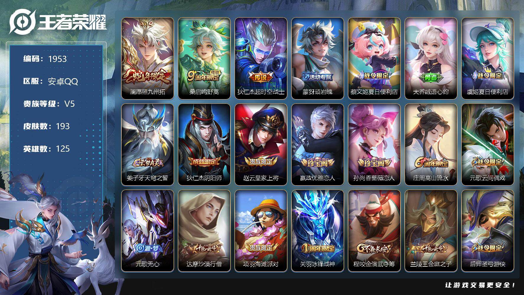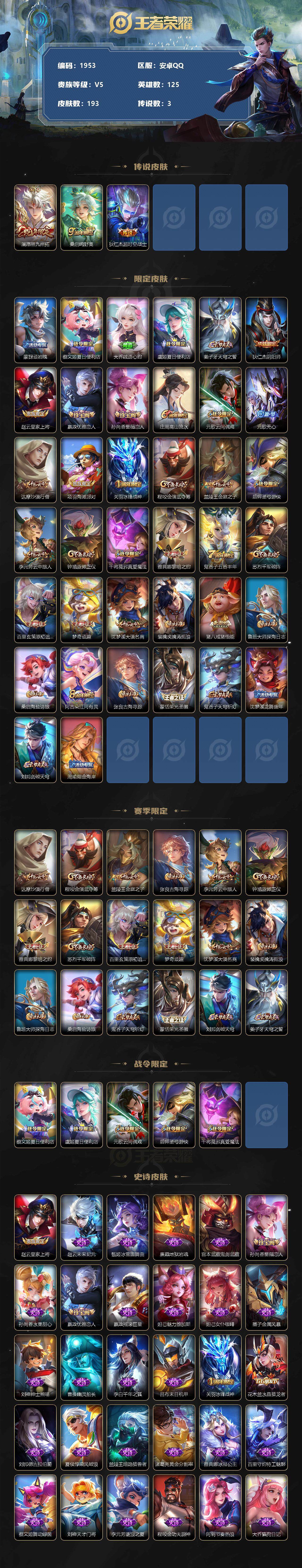 [12865208]安卓Q-V5-至尊星耀I段位-125英雄-193皮肤-0典藏-0珍品无双-0无双-0珍品传说-3传说-57史诗