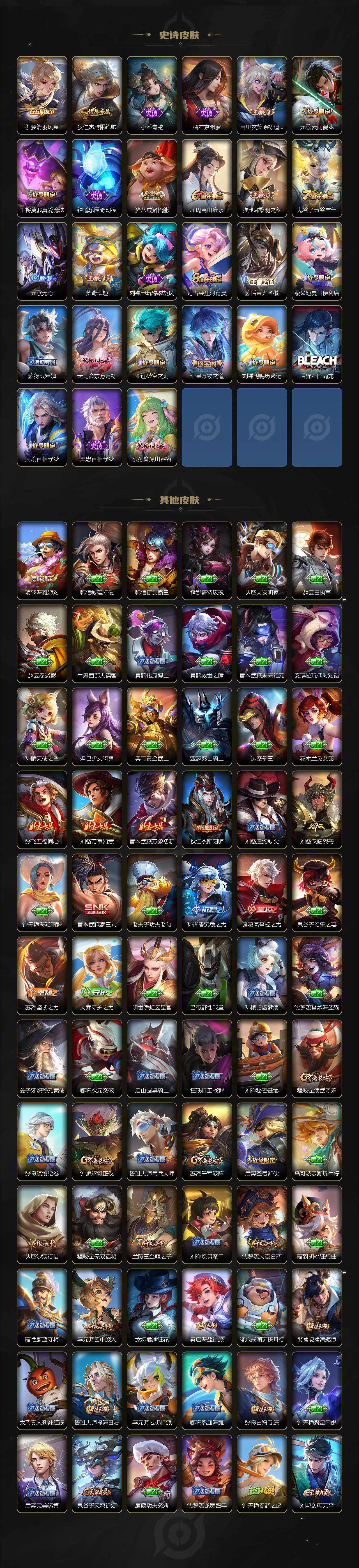 【史诗皮肤】:赵云皇家上将,赵云未来纪元,甄姬冰雪圆舞曲,廉颇地狱岩魂,宫本武藏鬼剑武藏,孙尚香蔷薇恋人,孙尚香水果甜心,嬴政优雅恋人,嬴政摇滚巨星,妲己魅力维加斯,妲己女仆咖啡,墨子金属风暴,刘禅绅士熊喵,曹操幽灵船长,李白千年之狐,吕布末日机甲,关羽冰锋战神,花木兰水晶猎龙者,刘邦德古拉伯爵,夏侯惇乘风破浪,兰陵王暗隐猎兽者,诸葛亮黄金分割率,雅典娜冰冠公主,百里守约特工魅影,蔡文姬舞动绿茵,刘禅天才门将,李元芳逐浪之夏,程咬金功夫厨神,阿轲节奏热浪,大乔猫狗日记,伽罗箭羽风息,狄仁杰鹰眼统帅,小乔青蛇,橘右京修罗,百里玄策原初追逐者,元歌云间偶戏,干将莫邪真爱魔法,钟馗乐园奇幻夜,猪八戒猪悟能,庄周高山流水,雅典娜黎明之约,鬼谷子五谷丰年,元歌无心,梦奇顽趣,刘禅电玩爆裂旋风,阿古朵江河有灵,蒙恬荣光圣徽,蔡文姬夏日便利店,蒙犽顽岩魄,大司命东方月初,亚连破空之剑,弈星万物之道,刘禅鸭鸭历险记,后羿石田雨龙,周瑜百相守梦,黄