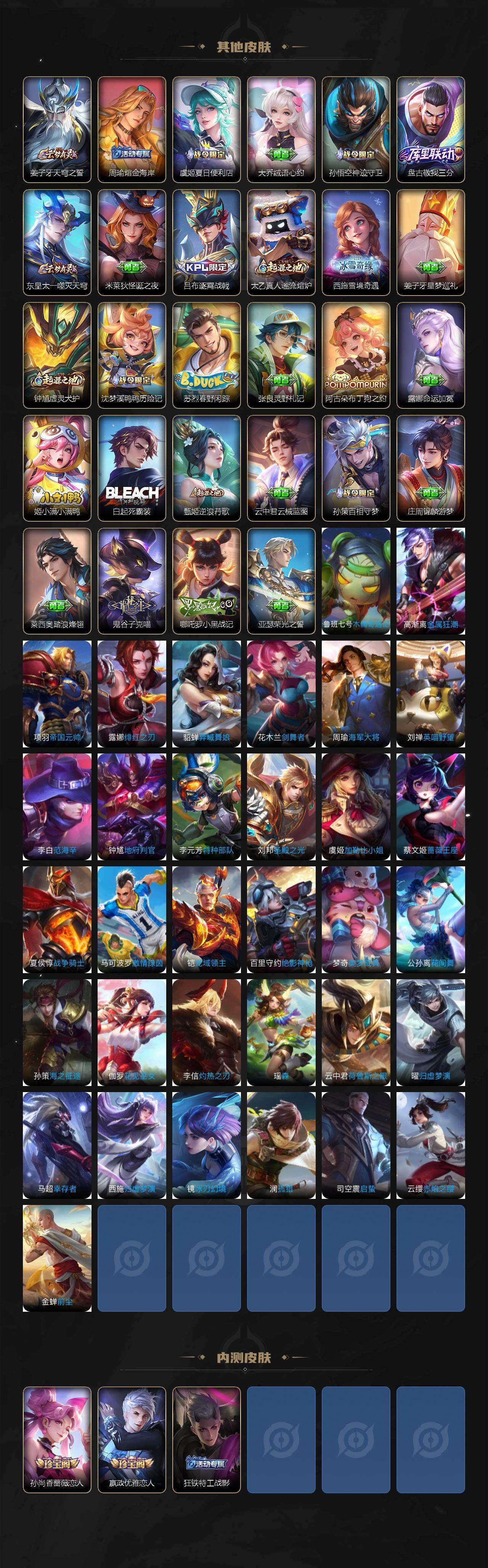 【限定皮肤】:蒙犽顽岩魄,蔡文姬夏日便利店,大乔绒语心约,虞姬夏日便利店,姜子牙天穹之誓,狄仁杰阴阳师,赵云皇家上将,嬴政优雅恋人,孙尚香蔷薇恋人,庄周高山流水,元歌云间偶戏,元歌无心,达摩沙漠行僧,项羽海滩派对,关羽冰锋战神,程咬金演武夺筹,兰陵王金庭之子,后羿圣弓游侠,李元芳云中旅人,钟馗驱傩正仪,干将莫邪真爱魔法,雅典娜黎明之约,鬼谷子五谷丰年,苏烈千军破阵,百里玄策原初追逐者,梦奇顽趣,沈梦溪大漠名商,裴擒虎擒涛扼浪,猪八戒猪悟能,鲁班大师探海日志,桑启海盐诗旅,阿古朵江河有灵,张良古海寻踪,蒙恬荣光圣徽,鬼谷子天穹祈灯,沈梦溪龙舞盛年,刘邦剑破天穹,周瑜熔金海岸
