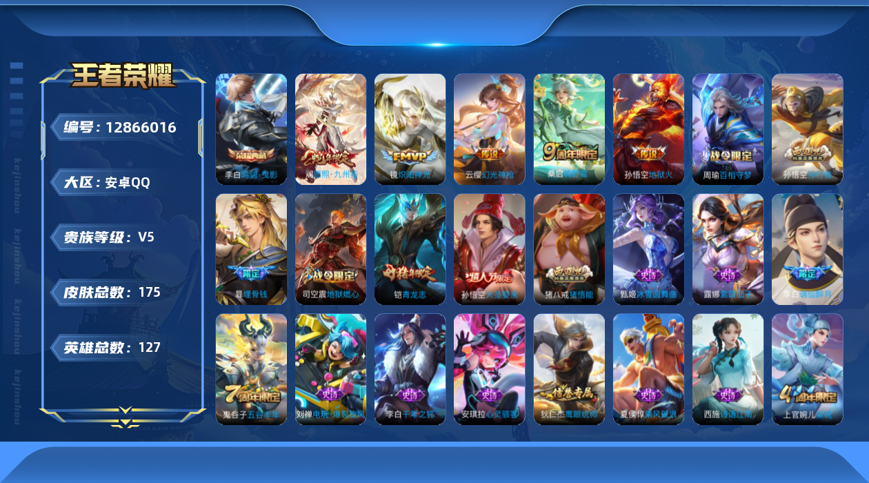 [12866016]安卓Q-V4-永恒钻石III段位-127英雄-175皮肤-1典藏-0珍品无双-0无双-0珍品传说-5传说-36史诗