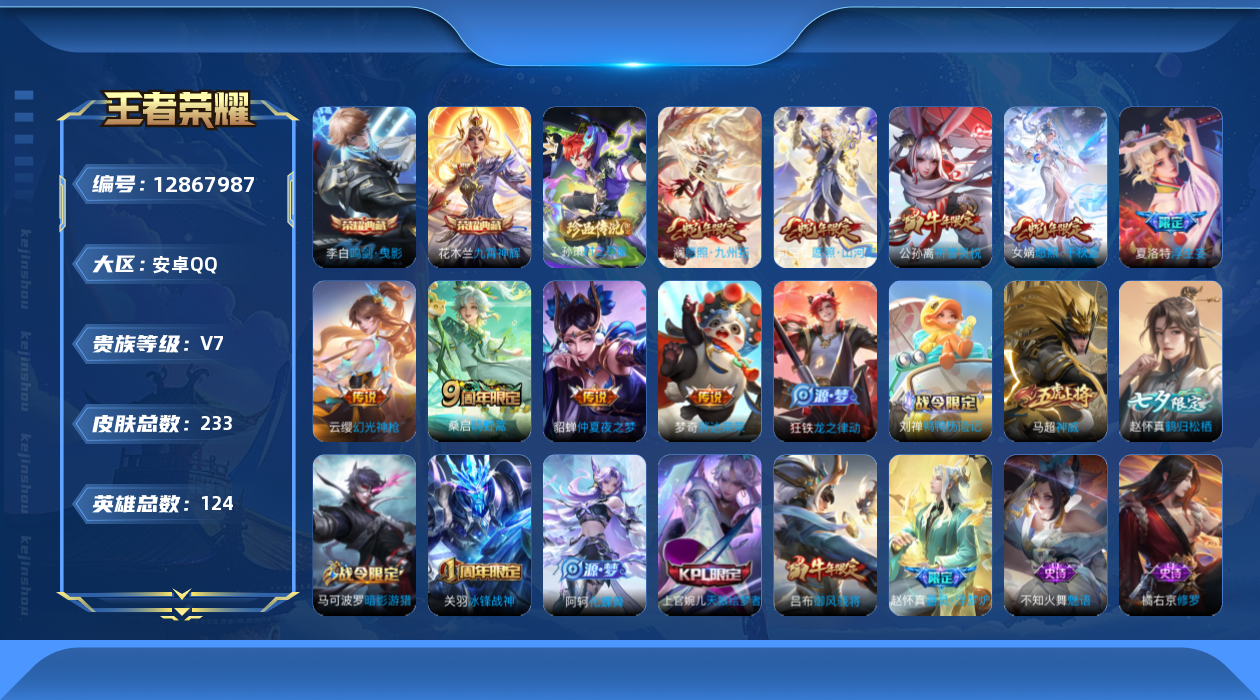 [12867987]安卓Q-V7-至尊星耀II段位-124英雄-233皮肤-2典藏-0珍品无双-0无双-1珍品传说-9传说-77史诗