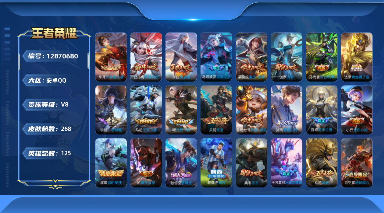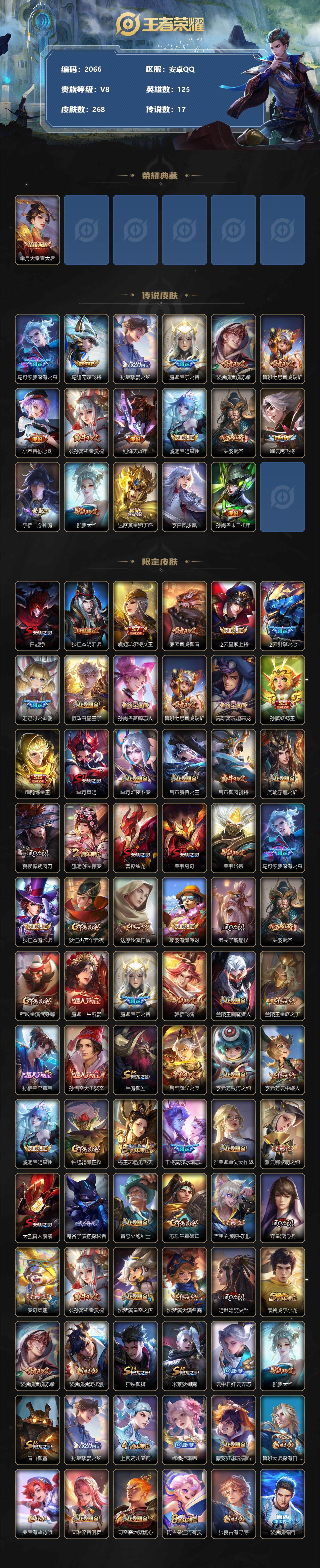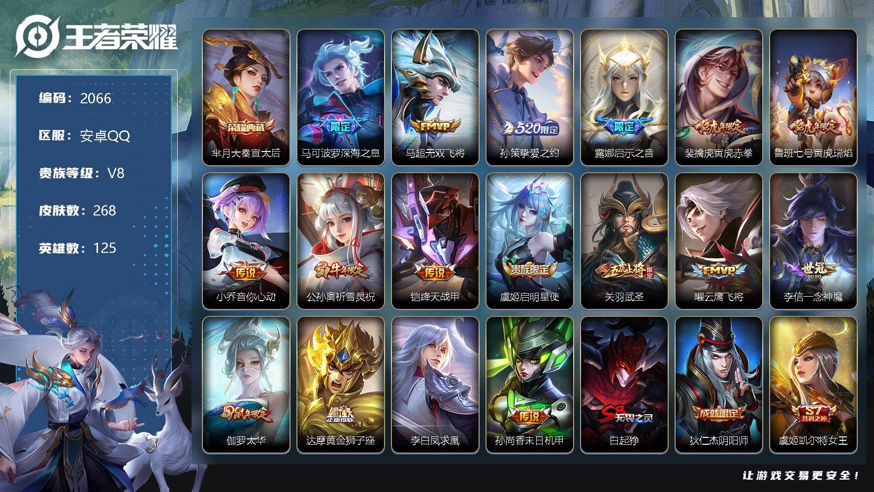 [12870680]安卓Q-V8-至尊星耀III段位-125英雄-268皮肤-1典藏-0珍品无双-0无双-0珍品传说-17传说-69史诗