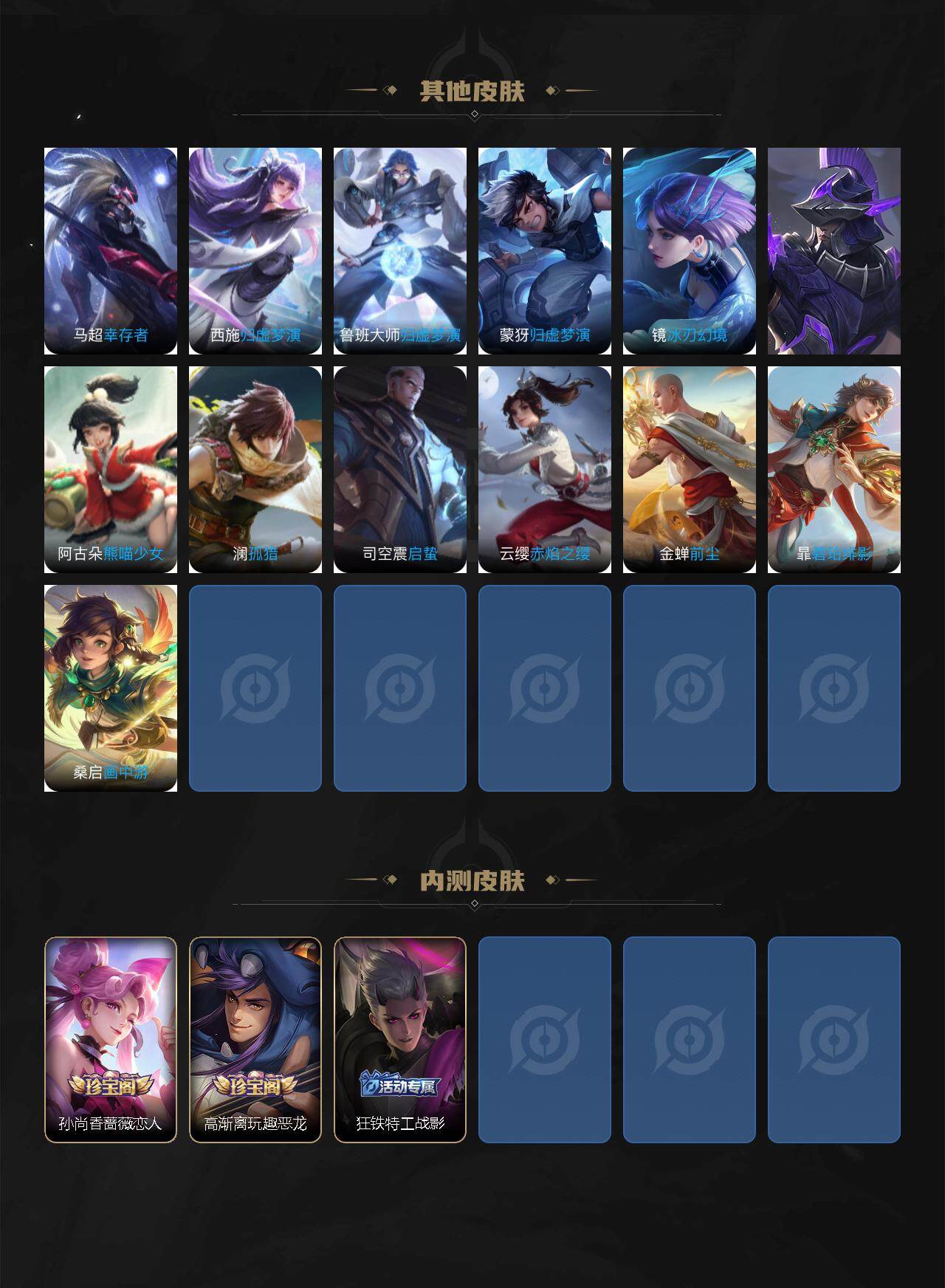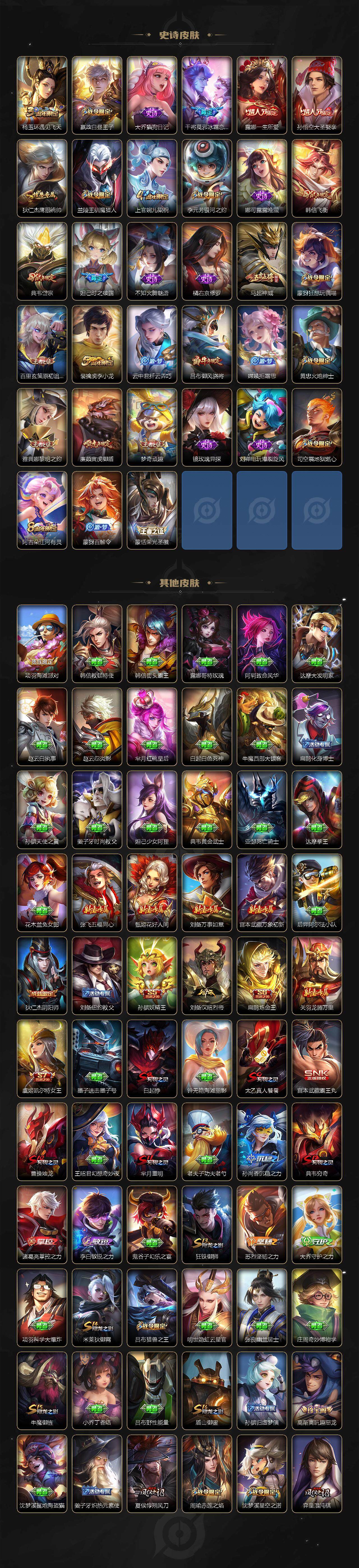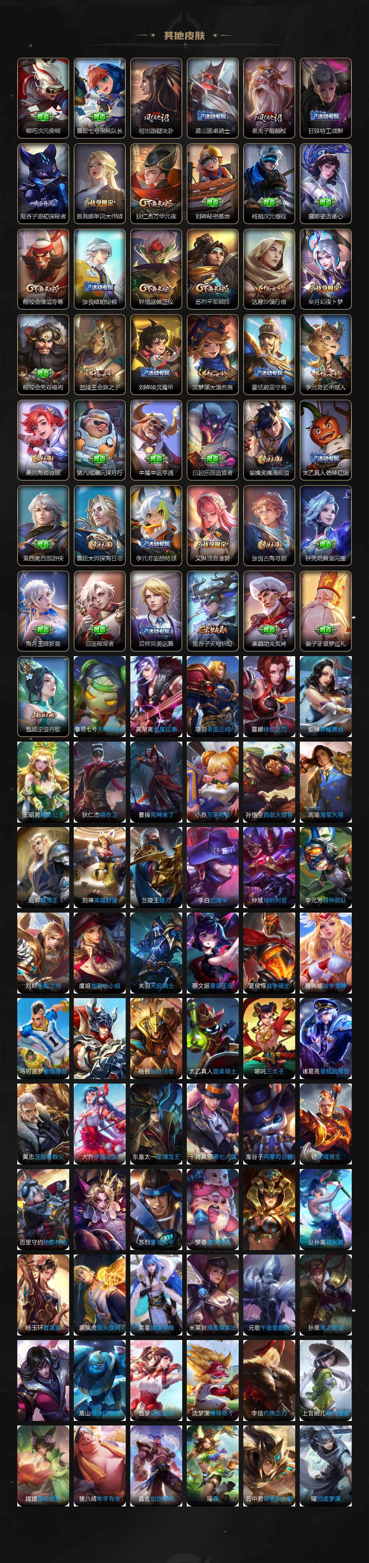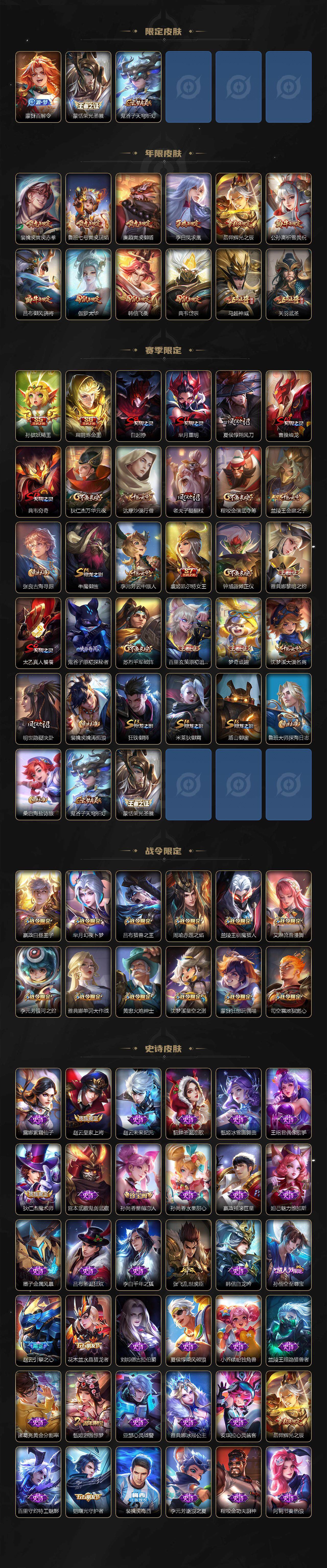 【限定皮肤】:白起狰,狄仁杰阴阳师,虞姬凯尔特女王,廉颇寅虎御盾,赵云皇家上将,赵云引擎之心,妲己时之彼端,嬴政白昼王子,孙尚香蔷薇恋人,鲁班七号寅虎瑞焰,高渐离玩趣恶龙,孙膑妖精王,扁鹊炼金王,芈月重明,芈月幻夜卜梦,吕布猎兽之王,吕布御风骁将,周瑜赤莲之焰,夏侯惇朔风刀,甄姬游园惊梦,曹操烛龙,典韦穷奇,典韦岱宗,马可波罗深海之息,狄仁杰魔术师,狄仁杰万华元夜,达摩沙漠行僧,项羽海滩派对,老夫子醍醐杖,关羽武圣,程咬金演武夺筹,露娜一生所爱,露娜启示之音,韩信飞衡,兰陵王驯魔猎人,兰陵王金庭之子,孙悟空至尊宝,孙悟空大圣娶亲,牛魔御旌,后羿辉光之辰,李元芳银河之约,李元芳云中旅人,虞姬启明星使,钟馗驱傩正仪,杨玉环遇见飞天,干将莫邪冰霜恋舞曲,雅典娜单词大作战,雅典娜黎明之约,太乙真人饕餮,鬼谷子原初探秘者,黄忠火炮绅士,苏烈千军破阵,百里玄策原初追逐者,弈星混沌棋,梦奇顽趣,公孙离祈雪灵祝,沈梦溪星空之诺,沈梦溪大漠名商,明世隐疑决卦,裴擒虎李小龙,裴擒虎寅虎赤拳,裴擒虎擒涛扼浪,狂铁御狮,米莱狄御霄,云中君纤云弄巧,伽罗太华,盾山御銮,孙策挚爱之约,上官婉儿梁祝,嫦娥拒霜思,蒙犽狂想玩偶喵,鲁班大师探海日志,桑启海盐诗旅,艾琳流音漫舞,司空震地狱燃心,阿古朵江河有灵,张良古海寻踪,裴擒虎梅西,蒙犽百解令,蒙恬荣光圣徽,鬼谷子天穹祈灯