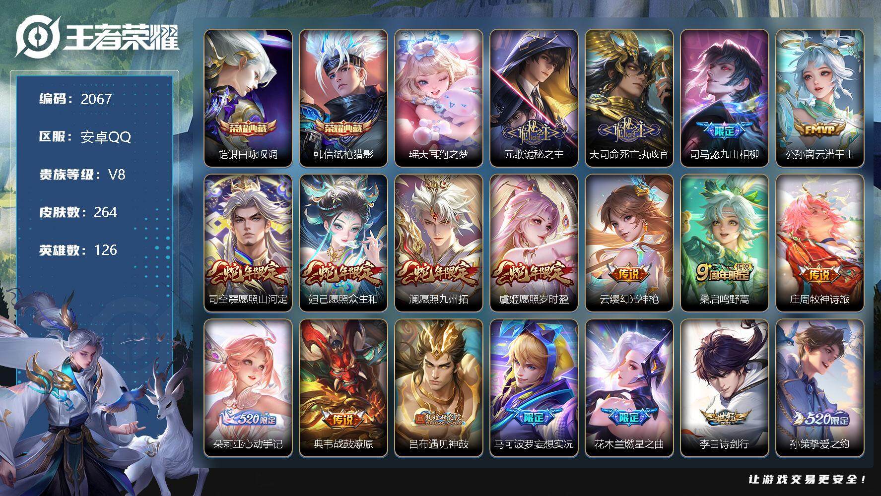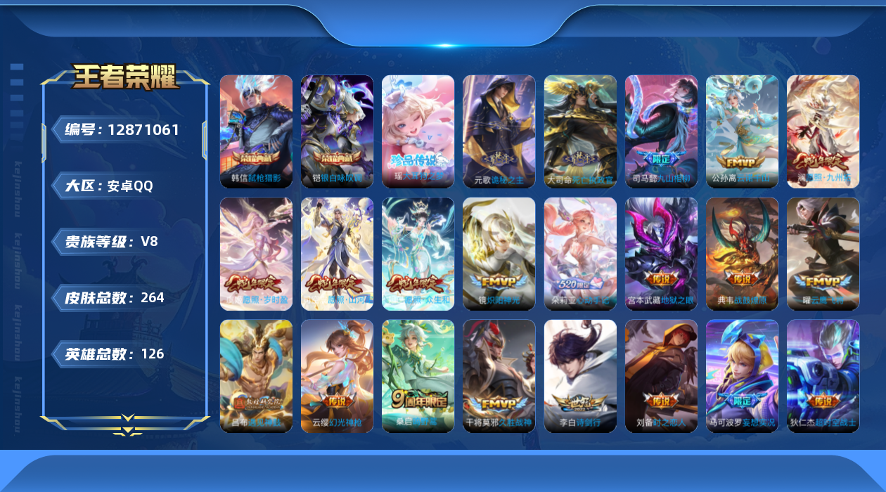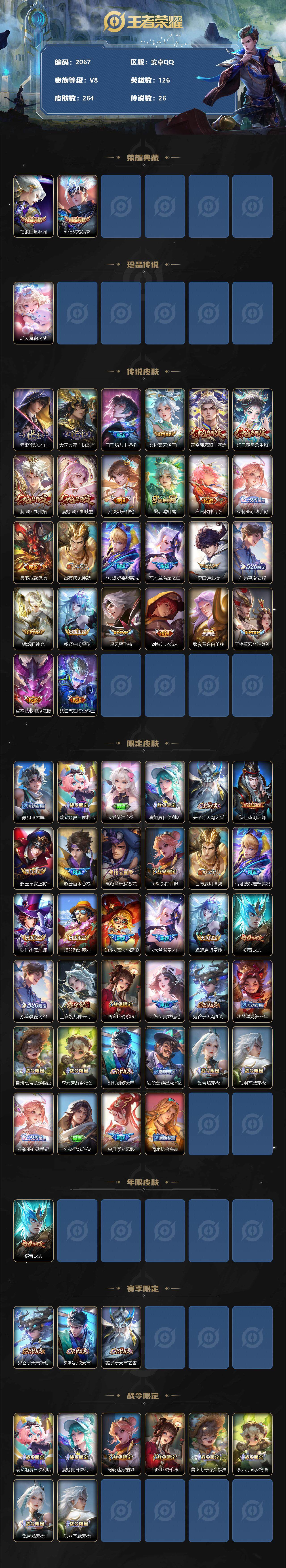 [12871061]安卓Q-V8-至尊星耀V段位-126英雄-264皮肤-2典藏-0珍品无双-0无双-1珍品传说-26传说-73史诗