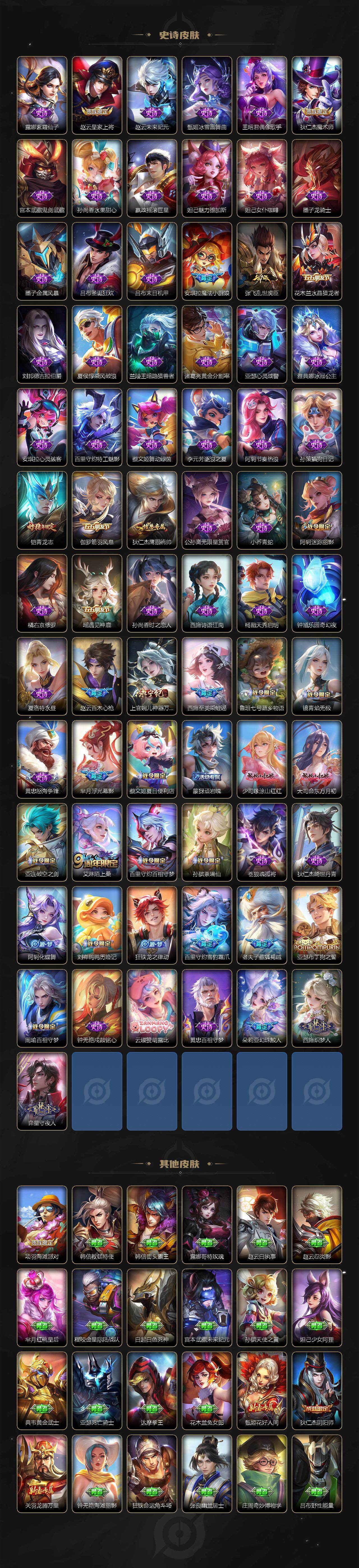 【史诗皮肤】:露娜紫霞仙子,赵云皇家上将,赵云未来纪元,甄姬冰雪圆舞曲,王昭君偶像歌手,狄仁杰魔术师,宫本武藏鬼剑武藏,孙尚香水果甜心,嬴政摇滚巨星,妲己魅力维加斯,妲己女仆咖啡,墨子龙骑士,墨子金属风暴,吕布圣诞狂欢,吕布末日机甲,安琪拉魔法小厨娘,张飞乱世虎臣,花木兰水晶猎龙者,刘邦德古拉伯爵,夏侯惇乘风破浪,兰陵王暗隐猎兽者,诸葛亮黄金分割率,亚瑟心灵战警,雅典娜冰冠公主,安琪拉心灵骇客,百里守约特工魅影,蔡文姬舞动绿茵,李元芳逐浪之夏,阿轲节奏热浪,孙策猫狗日记,铠青龙志,伽罗箭羽风息,狄仁杰鹰眼统帅,公孙离无限星赏官,小乔青蛇,阿轲迷踪丽影,橘右京修罗,瑶遇见神鹿,孙