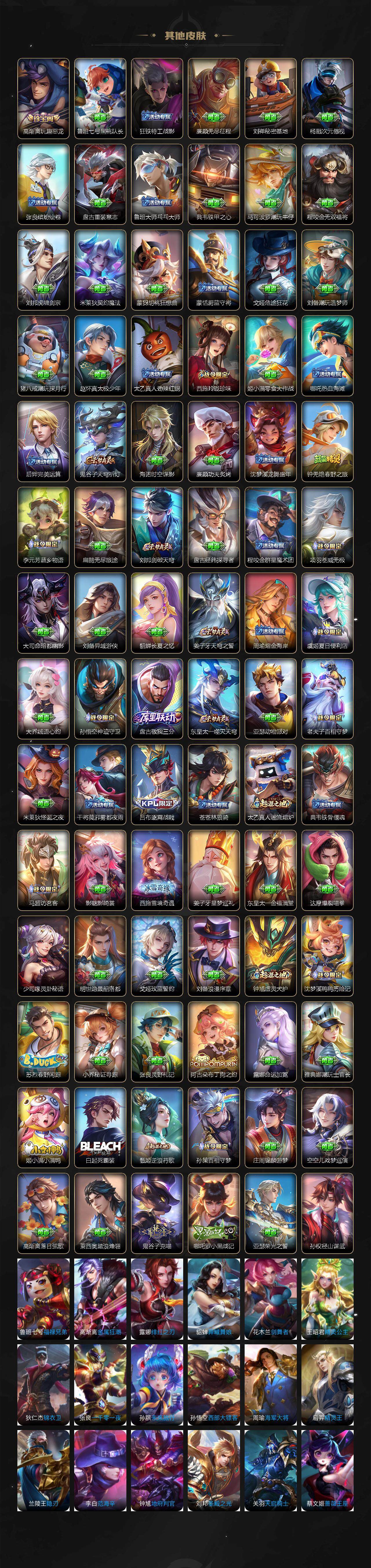 【限定皮肤】:蒙犽顽岩魄,蔡文姬夏日便利店,大乔绒语心约,虞姬夏日便利店,姜子牙天穹之誓,狄仁杰阴阳师,赵云皇家上将,赵云百木心枪,高渐离玩趣恶龙,阿轲迷踪丽影,吕布遇见神鼓,马可波罗妄想实况,狄仁杰魔术师,项羽海滩派对,安琪拉魔法小厨娘,花木兰燃星之曲,虞姬启明星使,铠青龙志,孙策挚爱之约,上官婉儿神器万象笔,西施玲珑珍味,西施至美乘鲤谣,鬼谷子天穹祈灯,沈梦溪龙舞盛年,鲁班七号蔬乡物语,李元芳蔬乡物语,刘邦剑破天穹,程咬金群星魔术团,镜青焰无极,项羽苍威无极,朵莉亚心动手记,刘备异域游侠,芈月浮光幕影,周瑜熔金海岸