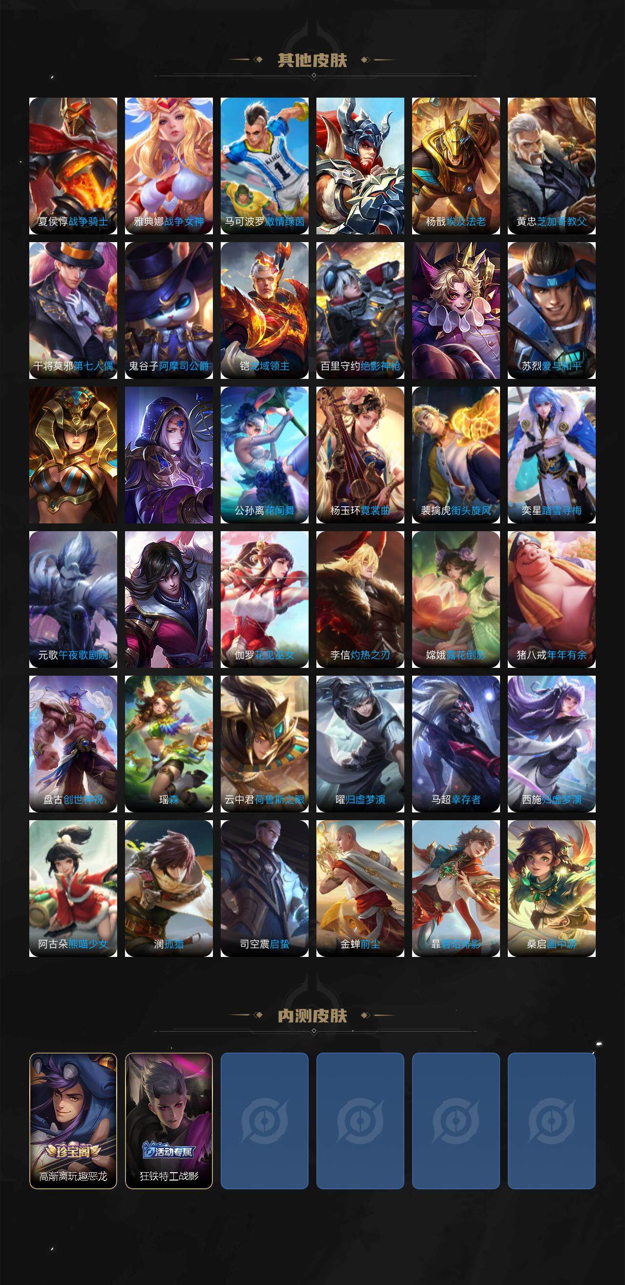 小乔青蛇,瑶遇见神鹿,伽罗箭羽风息,李元芳逐浪之夏,公孙离无限星赏官,孙策猫狗日记,阿轲节奏热浪,露娜紫霞仙子,诸葛亮黄金分割率,王昭君偶像歌手,孙尚香时之恋人,雅典娜冰冠公主,吕布末日机甲,橘右京修罗,墨子龙骑士,嬴政摇滚巨星,安琪拉心灵骇客,刘邦德古拉伯爵,兰陵王暗隐猎兽者,宫本武藏鬼剑武藏,亚瑟心灵战警,钟馗乐园奇幻夜,杨戬天秀·启明,蔡文姬舞动绿茵,西施诗语江南,夏侯惇乘风破浪,花木兰水晶猎龙者,墨子金属风暴,吕布圣诞狂欢,百里守约特工魅影,夏洛特永昼,苍狼魂孤将,狄仁杰绮世丹青
