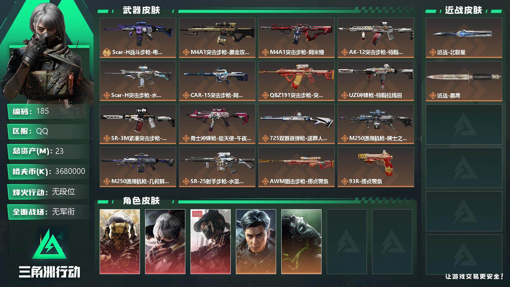 [12871205]汤38396总资产23M,哈夫币368w,近战-北极星,腾龙突击步枪-气象感应(优品C)/SCAR-H战斗步枪-电玩高手(优品C),露娜-黑天际线/红狼-蚀金玫瑰/蜂医-送葬人无题密令,枪皮数量99,战场等级:11 列兵,行动等级:50 黄金,角色皮肤数量3,安全箱等时效性道具请以游戏内数据为准;详情请看图【个人信息】战场等级:11 列兵,行动等级:50 黄金【哈夫币】368w【总资产】23M【货币】20三角币/0曼德尔币/0三角券【安全箱】基础安全箱2(1x2)/S6高级安全箱6(2x3)【通行证】烽火地带限定版【特勤处】制药台Lv.1/工作台Lv.2/仓库Lv.5/防具台Lv.3/训练中心Lv.4/靶场Lv.2/技术中心Lv.1/指挥中心Lv.3/潜水中心Lv.0/收藏室Lv.0【角色皮肤】露娜-黑天际线/红狼-蚀金玫瑰/蜂医-送葬人无题密令/【已拥有捆绑包】捞点薯条捆绑包/特斯拉线圈捆绑包/【近战皮肤】近战-黑鹰/近战-北极星/【传说典藏】SCAR-H战斗步枪-电玩高手(优品C)/腾龙突击步枪-气象感应(优品C)/【步枪皮肤】M4A1突击步枪-蚀金玫瑰/SCAR-H战斗步枪-水墨云图/腾龙突击步枪-无垢/SR-3M紧凑突击步枪-荒野求生/CAR-15突击步枪-阿米娅/M4A1突击步枪-阿米娅/腾龙突击步枪-捞点薯条/AK-12突击步枪-特斯拉线圈/SR-3M紧凑突击步枪-特斯拉线圈/SCAR-H战斗步枪-启航/SR-3M紧凑突击步枪-战术竞备/【冲锋枪皮肤】UZI冲锋枪-特斯拉线圈/MP7冲锋枪-无垢/勇士冲锋枪-能天使-午夜邮差/P90冲锋枪-紧急戒备/MP7冲锋枪-守护者/【霰弹枪皮肤】725双管霰弹枪-送葬人-无题密令/【轻机枪皮肤】PKM通用机枪-荒野求生/M250通用机枪-骑士之心/M250通用机枪-几何解构/【精准射手步枪皮肤】SR-25射手步枪-水墨云图/PSG-1射手步枪-无垢/【狙击步枪皮肤】SVD狙击步枪-阿萨拉工艺/SV-98狙击步枪-囚徒/SV-98狙击步枪-林中猎手/SVD狙击步枪-荒野求生/AWM狙击步枪-捞点薯条/【手枪皮肤】沙漠之鹰-曙光/93R-捞点薯条/【特殊武器】复合弓-黑-天际线/【挂饰】诡影狙击兵/诡影喷火兵/挂饰-启程/挂饰-蚀金玫瑰/阿萨拉喷火兵/阿萨拉霰弹兵/阿萨拉狙击兵/挂饰-晶石幻想/挂饰-阿米娅/挂饰-来