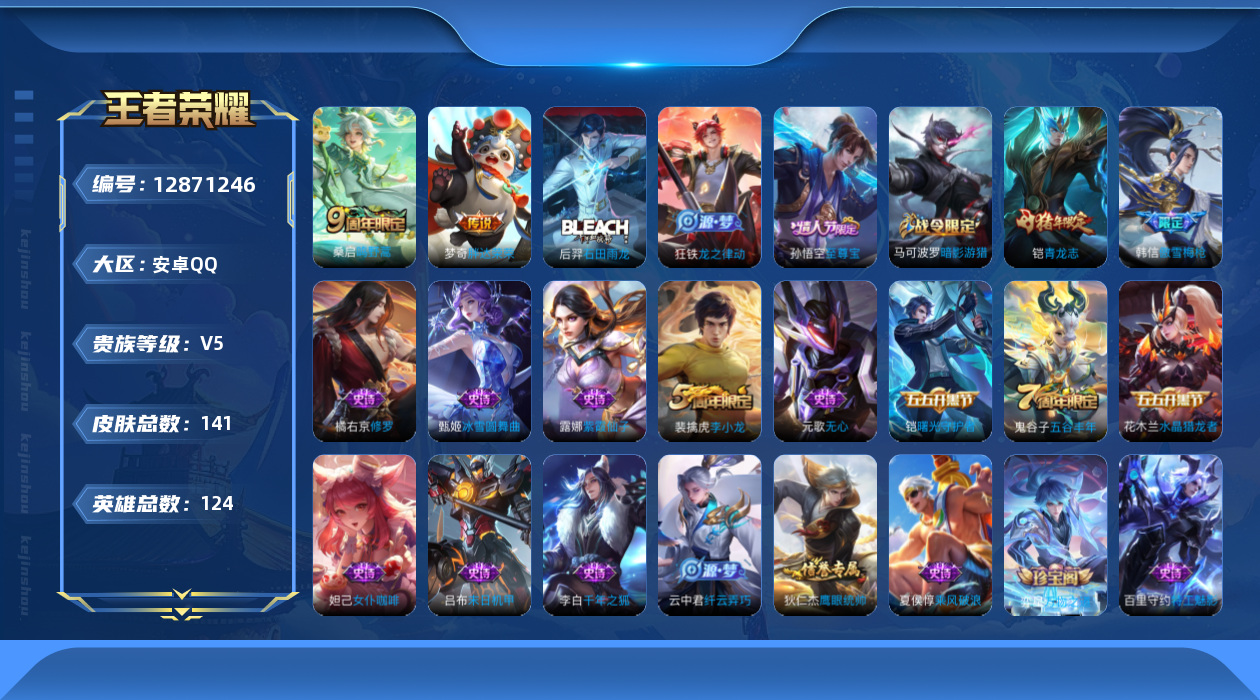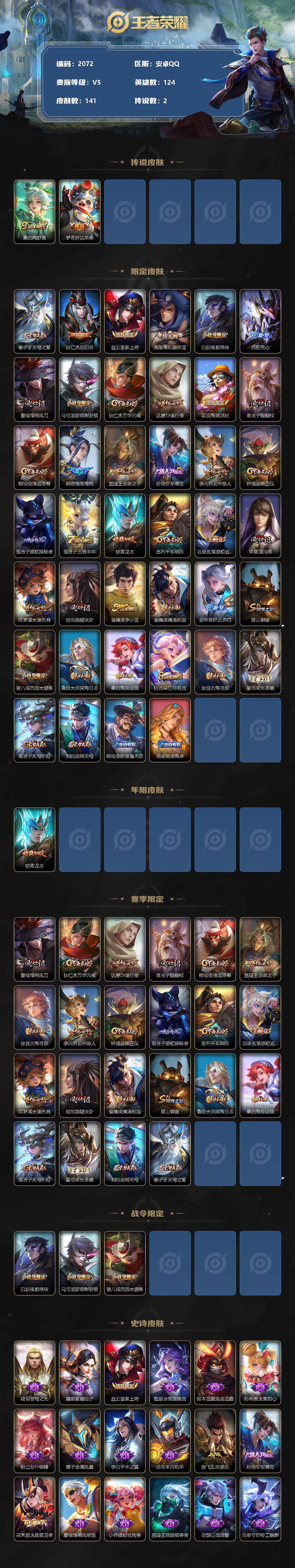 [12871246]安卓Q-V0-至尊星耀III段位-124英雄-141皮肤-0典藏-0珍品无双-0无双-0珍品传说-2传说-38史诗
