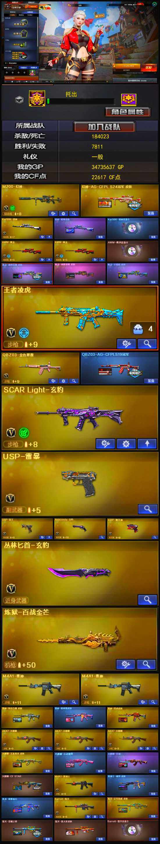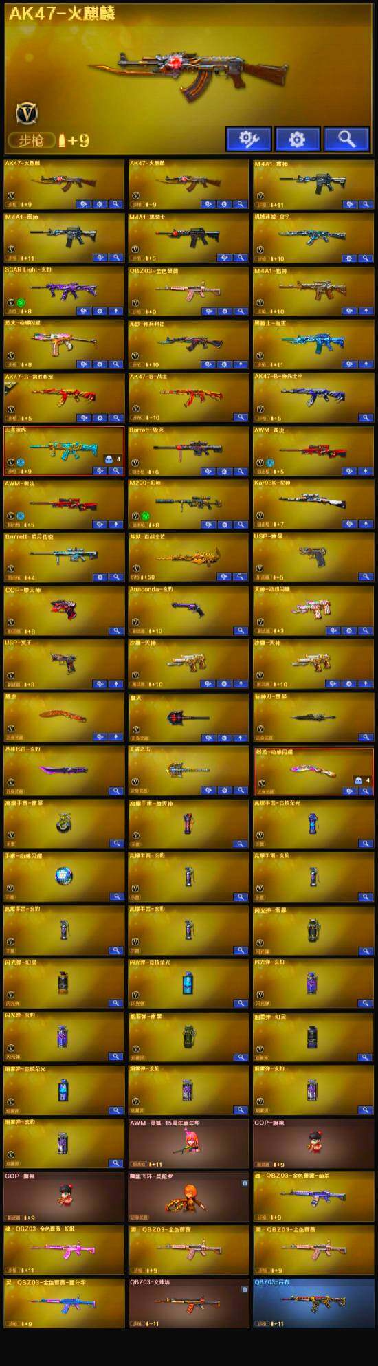 【英雄级武器】:AK47-火麒麟*3,M4A1-雷神*2,M4A1-黑骑士,无影-神兵利器,QBZ03-金色蔷薇,M4A1-猎神,烈火-动感闪耀,AK-47-猩红传说,黑骑士-海王,AK47-B-常胜将军,Barrett-毁灭,AWM-裁决*2,M200-幻神,Kar98K-星神,沙鹰-天神*2,USP-雷暴,COP-堕天神,天神-动感闪耀,USP-冥王,屠龙,擎天,屠龙-动感闪耀,斩神刀-雷暴,高爆手雷-竞技荣光,手雷-动感闪耀,闪光弹-竞技荣光,烟雾弹-竞技荣光,M4A1-赤狱骑士