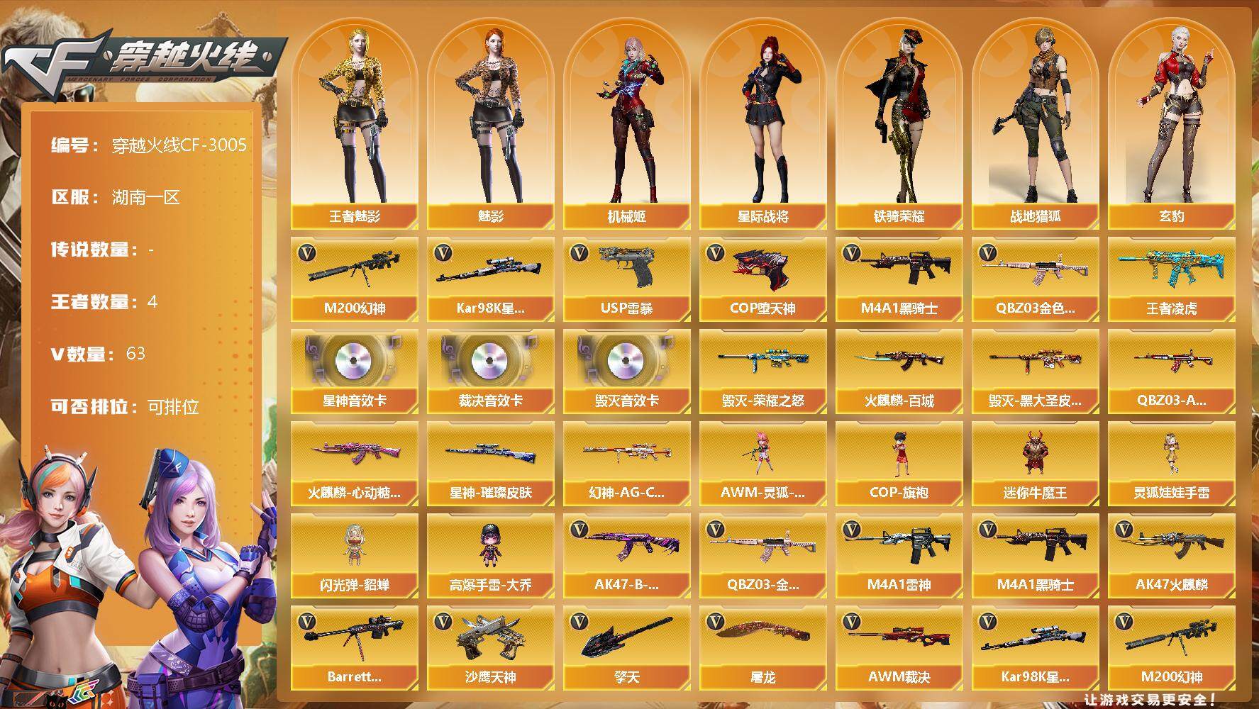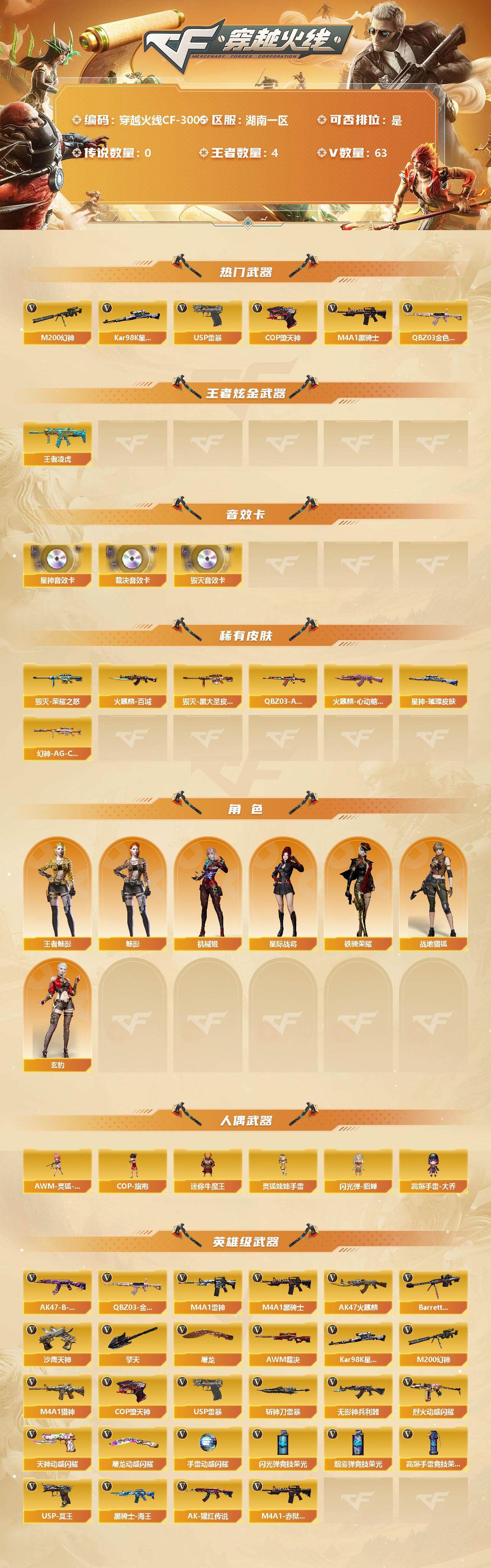 [12873542]湖南一区-63V-4王者-0炫金 【热门武器】:QBZ03-金色蔷薇,M200-幻神,Kar98K-星神,M4A1-黑骑士,USP-雷暴,COP-堕天神 【王者炫金武器】:王者凌虎 【音效卡】:Barrett-毁灭音效卡,AWM-裁决音效卡,Kar98K-星神音效卡 【稀有皮肤】:幻神-AG-CFPL S24冠军 皮肤,星神-璀璨皮肤,QBZ03-AG-CFPLS19冠军,火麒麟-百城,火麒麟-心动糖果,毁灭-荣耀之怒,毁灭-黑大圣皮肤 【角色】:王者-魅影,魅影,星际战将,机械姬,战地猎狐,玄豹,铁骑荣耀 【人偶武器】:AWM-灵狐-15周年嘉年华,COP-旗袍*2,迷你牛魔王,灵狐娃娃手雷,闪光弹-貂蝉,高爆手雷-大乔 【英雄级武器】:AK47-火麒麟*3,M4A1-雷神*2,M4A1-黑骑士,无影-神兵利器,QBZ03-金色蔷薇,M4A1-猎神,烈火-动感闪耀,AK-47-猩红传说,黑骑士-海王,AK47-B-常胜将军,Barrett-毁灭,AWM-裁决*2,M200-幻神,Kar98K-星神,沙鹰-天神*2,USP-雷暴,COP-堕天神,天神-动感闪耀,USP-冥王,屠龙,擎天,屠龙-动感闪耀,斩神刀-雷暴,高爆手雷-竞技荣光,手雷-动感闪耀,闪光弹-竞技荣光,烟雾弹-竞技荣光,M4A1-赤狱骑士 【特殊枪械】:1黑骑士