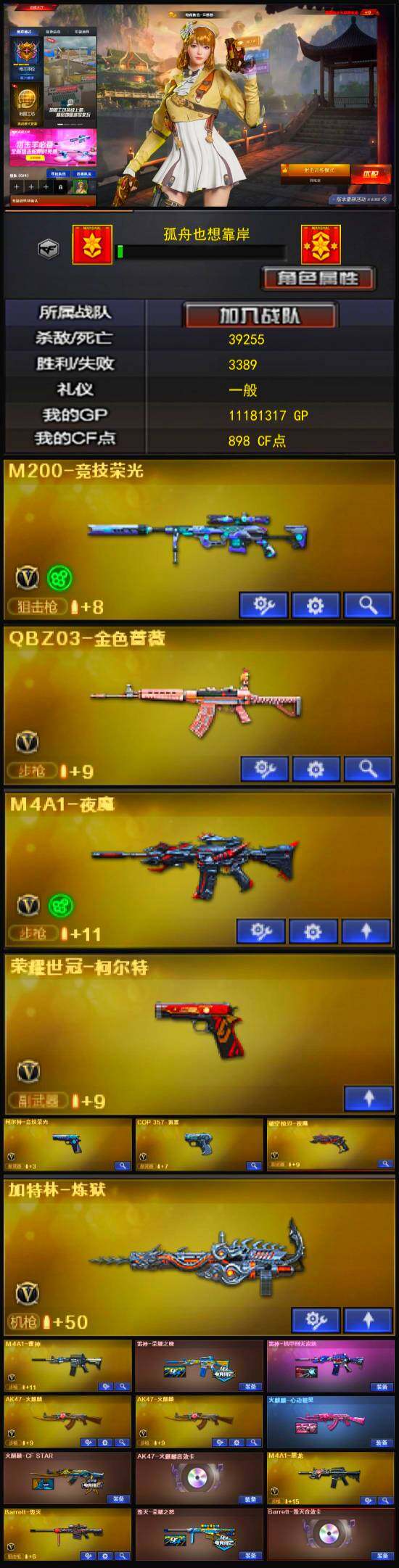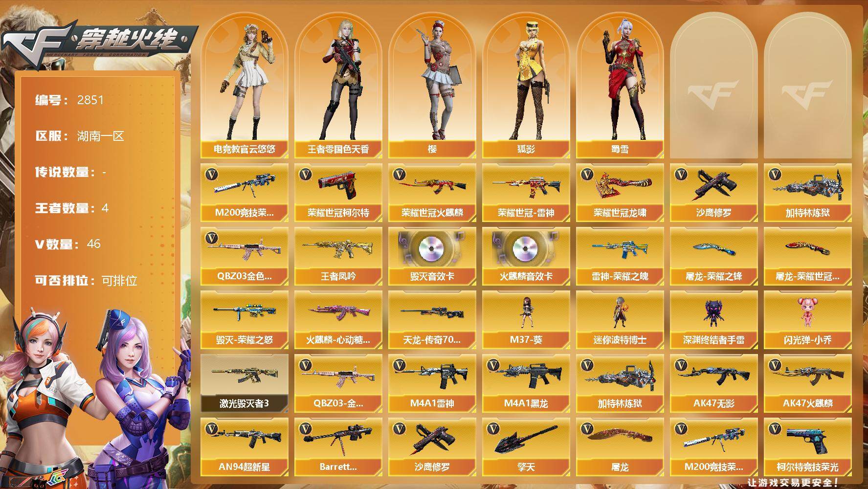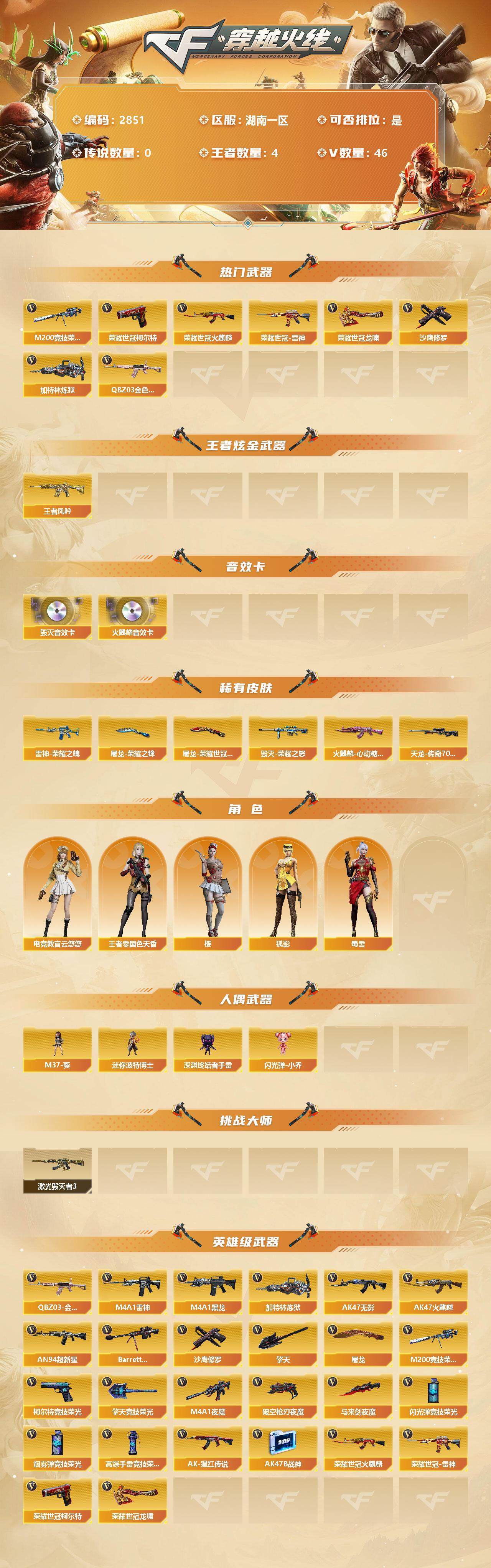 [12874242]湖南一区-46V-4王者-0炫金 【热门武器】:QBZ03-金色蔷薇,M200-竞技荣光,荣耀世冠-火麒麟,荣耀世冠-雷神,荣耀世冠-柯尔特,加特林-炼狱,沙鹰-修罗,荣耀世冠-龙啸 【王者炫金武器】:王者凤吟 【音效卡】:AK47-火麒麟音效卡,Barrett-毁灭音效卡 【稀有皮肤】:雷神-荣耀之魄,火麒麟-心动糖果,毁灭-荣耀之怒,AWM-天龙-传奇70KG,屠龙-荣耀之锋,屠龙-荣耀世冠AG 【角色】:王者-零-国色天香,狐影,樱,电竞教官-云悠悠,蜀雪 【人偶武器】:M37-葵,迷你波特博士*2,深渊终结者手雷,闪光弹-小乔 【挑战大师】:激光毁灭者III 【英雄级武器】:AK47-火麒麟*2,M4A1-黑龙,M4A1-雷神,AK47-无影,AN94-超新星,QBZ03-金色蔷薇,AK-47-猩红传说,AK47-B-战神,荣耀世冠-火麒麟,荣耀世冠-雷神,M4A1-夜魔,Barrett-毁灭,M200-竞技荣光,加特林-炼狱,沙鹰-修罗,破空枪刃-夜魔,柯尔特-竞技荣光,荣耀世冠-柯尔特,屠龙,马来剑-夜魔,擎天,擎天-竞技荣光,荣耀世冠-龙啸,高爆手雷-竞技荣光,闪光弹-竞技荣光,烟雾弹-竞技荣光 【特殊枪械】:1炼狱
