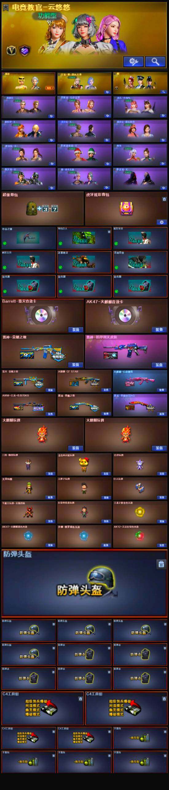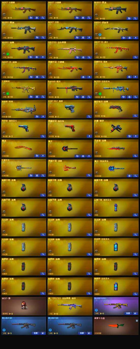 【英雄级武器】:AK47-火麒麟*2,M4A1-黑龙,M4A1-雷神,AK47-无影,AN94-超新星,QBZ03-金色蔷薇,AK-47-猩红传说,AK47-B-战神,荣耀世冠-火麒麟,荣耀世冠-雷神,M4A1-夜魔,Barrett-毁灭,M200-竞技荣光,加特林-炼狱,沙鹰-修罗,破空枪刃-夜魔,柯尔特-竞技荣光,荣耀世冠-柯尔特,屠龙,马来剑-夜魔,擎天,擎天-竞技荣光,荣耀世冠-龙啸,高爆手雷-竞技荣光,闪光弹-竞技荣光,烟雾弹-竞技荣光