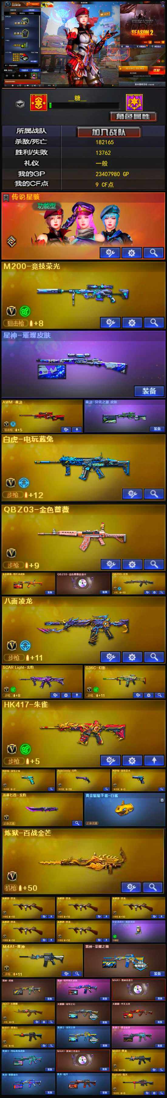 【热门武器】:G36C-幻影,QBZ03-金色蔷薇,HK417-朱雀,金色蔷薇-古蛇迷踪,修罗-古蛇迷踪,M200-竞技荣光,八面凌龙,白虎-电玩蓝兔,柯尔特-冠军之特,M4A1-黑骑士,汤姆逊-烈龙*5,裁决-雪莉杨,沙鹰-修罗,黄金猫猫手套-白鲨
