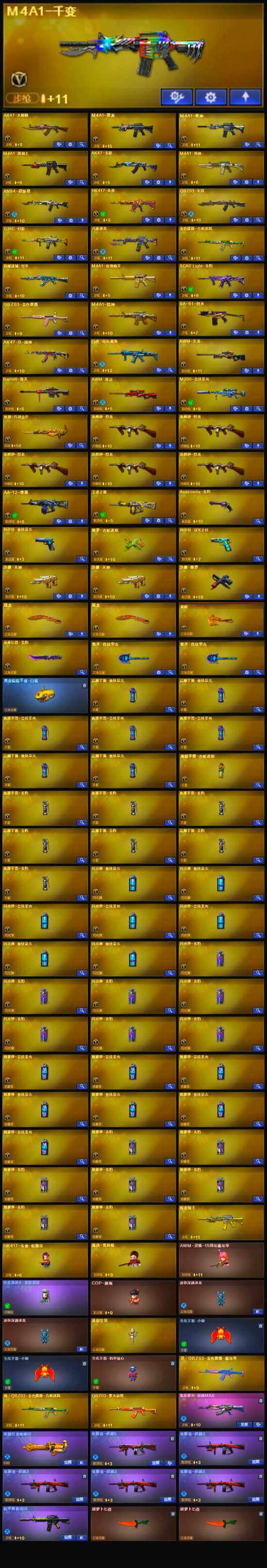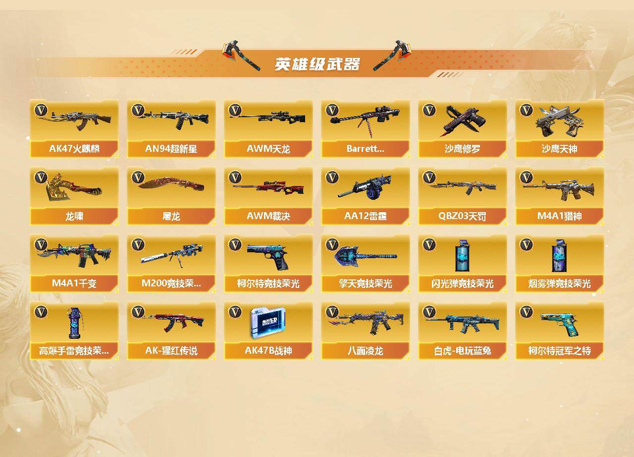 【英雄级武器】:M4A1-千变,AK47-火麒麟,M4A1-黑龙,M4A1-雷神,M4A1-黑骑士,AK47-无影,M4A1-死神,AN94-超新星,HK417-朱雀,QBZ03-天罚,G36C-幻影,金色蔷薇-古蛇迷踪,M4A1-玫瑰精灵,QBZ03-金色蔷薇,M4A1-猎神,AK-47-猩红传说*3,AK47-B-战神,白虎-电玩蓝兔,八面凌龙,AWM-天龙,Barrett-毁灭,AWM-裁决,M200-竞技荣光,汤姆逊-烈龙*5,AA-12-雷霆,沙鹰-修罗,沙鹰-天神*2,柯尔特-竞技荣光,修罗-古蛇迷踪,柯尔特-冠军之特,屠龙*2,龙啸,擎天-竞技荣光*2,高爆手雷-竞技荣光*7,闪光弹-竞技荣光*7,烟雾弹-竞技荣光*7
