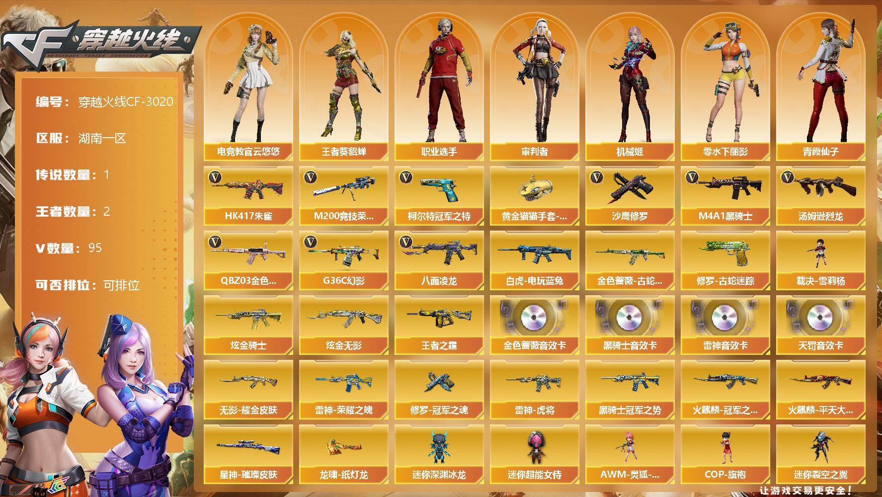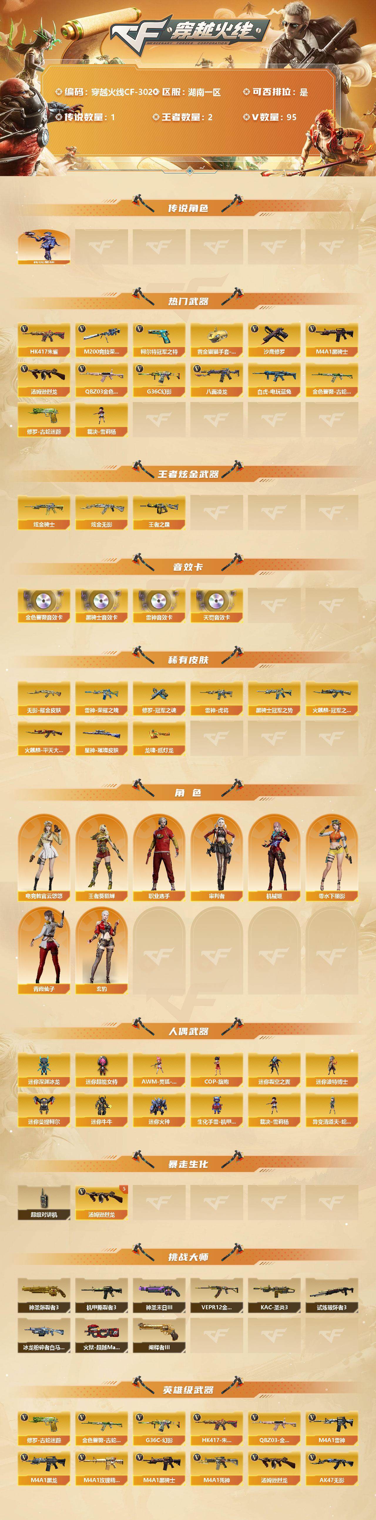 [12876176]湖南一区-95V-2王者-2炫金 【传说角色】:传说星骇 【热门武器】:G36C-幻影,QBZ03-金色蔷薇,HK417-朱雀,金色蔷薇-古蛇迷踪,修罗-古蛇迷踪,M200-竞技荣光,八面凌龙,白虎-电玩蓝兔,柯尔特-冠军之特,M4A1-黑骑士,汤姆逊-烈龙*5,裁决-雪莉杨,沙鹰-修罗,黄金猫猫手套-白鲨 【王者炫金武器】:王者之霆,炫金骑士,炫金无影 【音效卡】:M4A1-雷神音效卡,M4A1-黑骑士音效卡,QBZ03-金色蔷薇音效卡,QBZ03-天罚音效卡 【稀有皮肤】:星神-璀璨皮肤,雷神-荣耀之魄,雷神-虎将,火麒麟-冠军之心,火麒麟-平天大圣*2,黑骑士-冠军之势,无影耀金皮肤,修罗-冠军之魂,龙啸-纸灯龙皮肤 【角色】:审判者,电竞教官-云悠悠,机械姬,玄豹,王者-葵-貂蝉,零-水下丽影,职业选手,青霞仙子 【人偶武器】:裁决-雪莉杨,AWM-灵狐-15周年嘉年华,COP-旗袍,异变清道夫-蛇影双骄,迷你深渊冰龙*2,迷你超能女侍,迷你裂空之翼*2,迷你波特博士*2,迷你曼提柯尔,迷你牛牛,迷你火种,生化手雷-机甲核心 【暴走生化】:超级对讲机 【挑战大师】:神圣爆裂者III,机甲撕裂者III,神圣爆裂者-末日III,KAC-圣炎切割者III,阐释者III*2,试炼破坏者III,VEPR-12-金魔,冰龙粉碎者-白马银枪*2,火狱乱世-超越Max 【英雄级武器】:M4A1-千变,AK47-火麒麟,M4A1-黑龙,M4A1-雷神,M4A1-黑骑士,AK47-无影,M4A1-死神,AN94-超新星,HK417-朱雀,QBZ03-天罚,G36C-幻影,金色蔷薇-古蛇迷踪,M4A1-玫瑰精灵,QBZ03-金色蔷薇,M4A1-猎神,AK-47-猩红传说*3,AK47-B-战神,白虎-电玩蓝兔,八面凌龙,AWM-天龙,Barrett-毁灭,AWM-裁决,M200-竞技荣光,汤姆逊-烈龙*5,AA-12-雷霆,沙鹰-修罗,沙鹰-天神*2,柯尔特-竞技荣光,修罗-古蛇迷踪,柯尔特-冠军之特,屠龙*2,龙啸,擎天-竞技荣光*2,高爆手雷-竞技荣光*7,闪光弹-竞技荣光*7,烟雾弹-竞技荣光*7 【特殊枪械】:1黑骑士,5烈龙