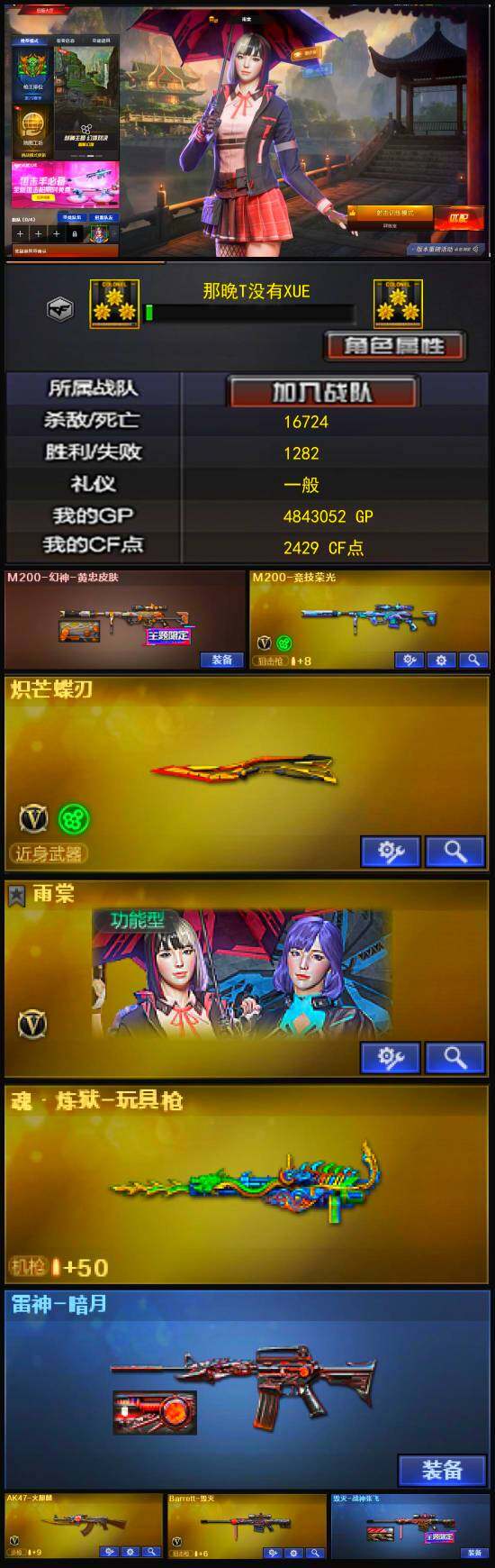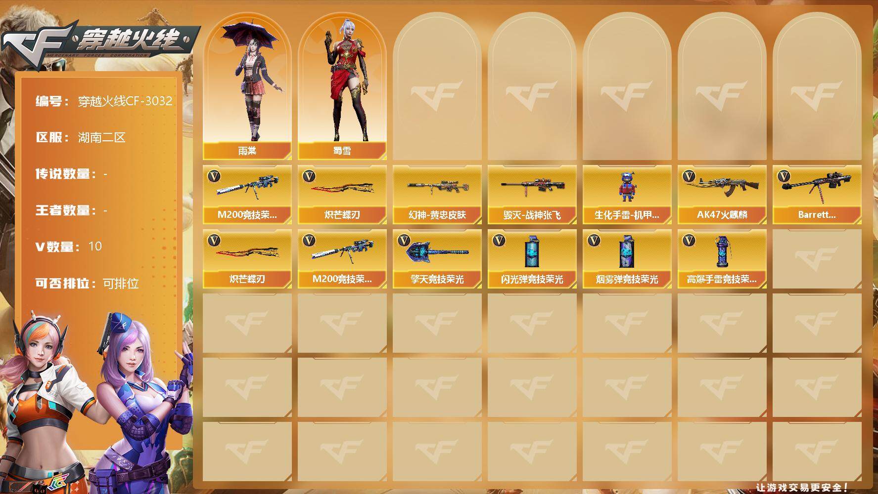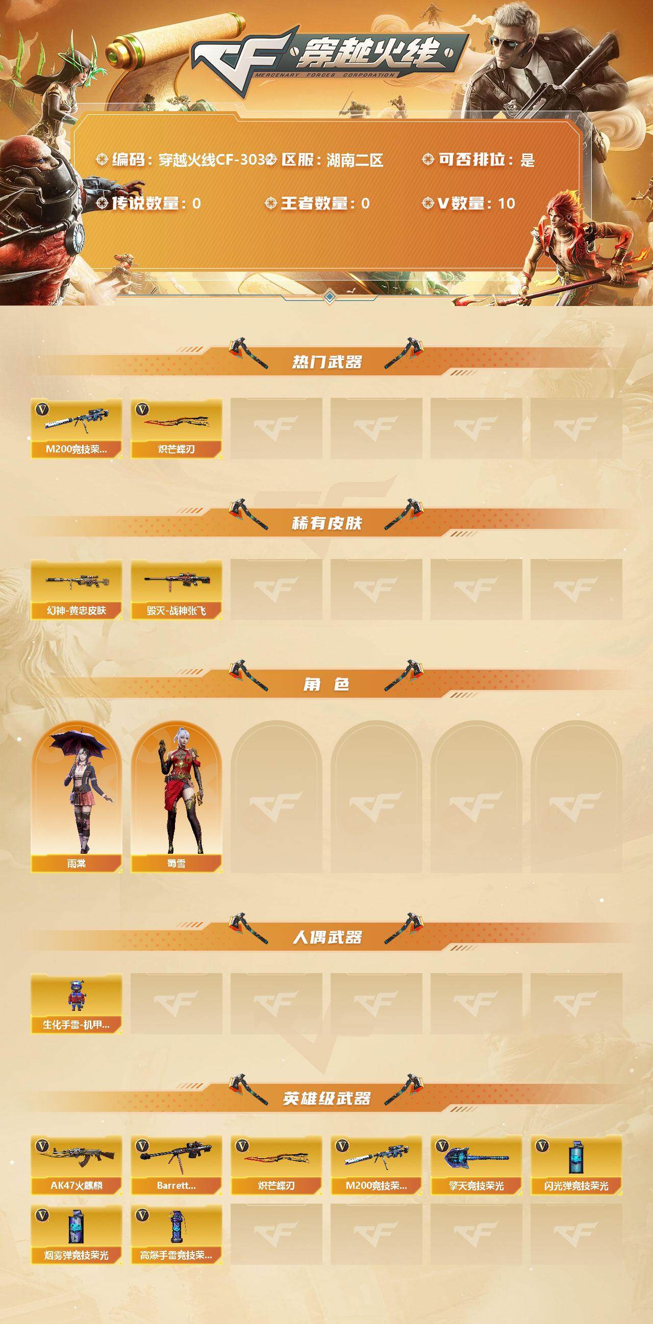 [12878057]湖南二区-10V-0王者-0炫金 【热门武器】:M200-竞技荣光,炽芒蝶刃 【稀有皮肤】:M200-幻神-黄忠皮肤,毁灭-战神张飞 【角色】:雨棠,蜀雪 【人偶武器】:生化手雷-机甲核心*3 【英雄级武器】:AK47-火麒麟,Barrett-毁灭,M200-竞技荣光,擎天-竞技荣光,炽芒蝶刃,高爆手雷-竞技荣光,闪光弹-竞技荣光*2,烟雾弹-竞技荣光 【特殊枪械】: