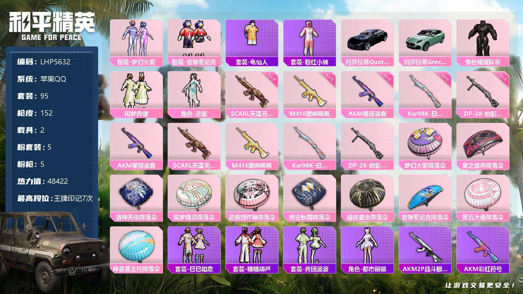 [12878285]素材身法号 苹果 手Q-5粉装-5特效枪-2载具-4.8w热力值-7王牌印记-95套装-152枪皮【热门品类】:粉装-梦幻火箭,粉装-音爆索尼克,套装-龟仙人,套装-粉红小猪【粉色载具】:玛莎拉蒂Quattroporte(夜幕蓝),玛莎拉蒂Grecale(薄荷绿)【粉色套装】:粉装-梦幻火箭,粉装-音爆索尼克,角色-猩猩队长,粉装-闲梦青缨,角色-灵玺【粉色枪皮等级】:AKM-星际浪客(五级),SCAR-L-天蓬元帅(八级),M416-暖熊萌萌(五级),Kar98K-巳巳如意(五级),DP-28-豹影疾电(五级)