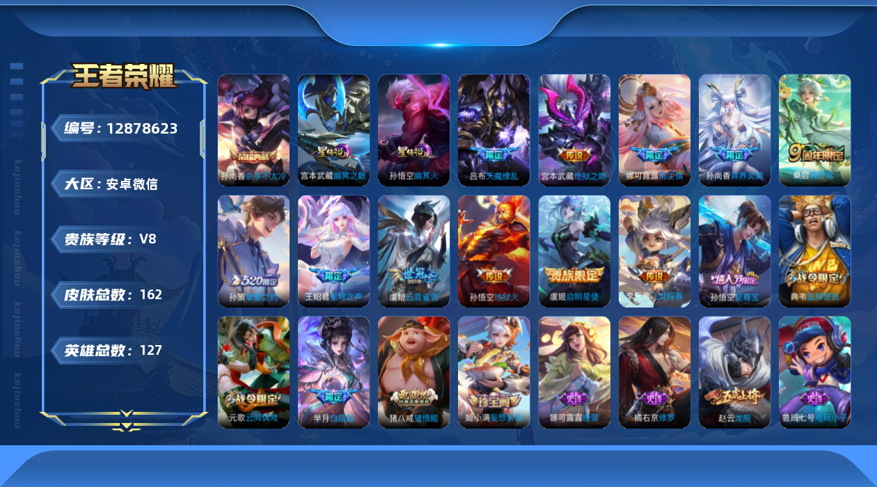 [12878623]安卓WX-V8-至尊星耀IV段位-125英雄-162皮肤-1典藏-11传说-48史诗 【英雄全皮】:娜可露露全皮,猪八戒全皮 【荣耀典藏】:孙尚香杀手不太冷 【传说皮肤】:桑启鸣野蒿,王昭君星穹之声,娜可露露前尘镜,孙策挚爱之约,孙尚香异界灵契,李元芳飞鸢探春,虞姬启明星使,虞姬云霓雀翎,宫本武藏地狱之眼,孙悟空地狱火,吕布天魔缭乱 【限定皮肤】:姜子牙天穹之誓,狄仁杰阴阳师,赵云皇家上将,赵云龙胆,孙尚香异界灵契,鲁班七号狮舞东方,庄周高山流水,阿轲迷踪丽影,芈月白晶晶,吕布天魔缭乱,元歌云间偶戏,夏侯惇朔风刀,甄姬幽恒,典韦蓝屏警告,狄仁杰魔术师,狄仁杰万华元夜,项羽海滩派对,老夫子醍醐杖,程咬金演武夺筹,刘邦夺宝奇兵,王昭君星穹之声,兰陵王金庭之子,娜可露露前尘镜,亚瑟潮玩骑士王,孙悟空至尊宝,牛魔御旌,李元芳云中旅人,虞姬启明星使,钟馗神迹守卫,钟馗驱傩正仪,女娲朔望之晖,雅典娜单词大作战,雅典娜黎明之约,蔡文姬繁星吟游,太乙真人饕餮,鬼谷子原初探秘者,鬼谷子五谷丰年,苏烈千军破阵,百里玄策原初追逐者,弈星混沌棋,明世隐疑决卦,裴擒虎擒涛扼浪,狂铁御狮,米莱狄御霄,云中君纤云弄巧,盾山御銮,孙策挚爱之约,猪八戒西部大镖客,猪八戒猪悟能,上官婉儿梁祝,嫦娥拒霜思,蒙犽狂想玩偶喵,鲁班大师探海日志,桑启海盐诗旅,艾琳女武神,阿古朵江河有灵,张良古海寻踪,姬小满妄想食味,刘邦剑破天穹,周瑜熔金海岸 【年限皮肤】:甄姬幽恒,赵云龙胆 【赛季限定】:夏侯惇朔风刀,狄仁杰万华元夜,老夫子醍醐杖,程咬金演武夺筹,兰陵王金庭之子,张良古海寻踪,牛魔御旌,李元芳云中旅人,钟馗驱傩正仪,雅典娜黎明之约,太乙真人饕餮,鬼谷子原初探秘者,苏烈千军破阵,百里玄策原初追逐者,弈星混沌棋,明世隐疑决卦,裴擒虎擒涛扼浪,狂铁御狮,米莱狄御霄,盾山御銮,鲁班大师探海日志,桑启海盐诗旅,刘邦剑破天穹,姜子牙天穹之誓 【战令限定】:鲁班七号狮舞东方,阿轲迷踪丽影,元歌云间偶戏,典韦蓝屏警告,刘邦夺宝奇兵,亚瑟潮玩骑士王,钟馗神迹守卫,女娲朔望之晖,雅典娜单词大作战,猪八戒西部大镖客,蒙犽狂想玩偶喵 【史诗皮肤】:鲁班七号电玩小子,赵云皇家上将,貂蝉圣诞恋歌,王昭君偶像歌手,狄仁杰魔术师,廉颇地狱岩魂,宫本武藏鬼剑武藏,孙尚香水果甜心,嬴政暗夜贵公子,妲己魅力维加斯,妲己女仆咖啡,墨子金属风暴,