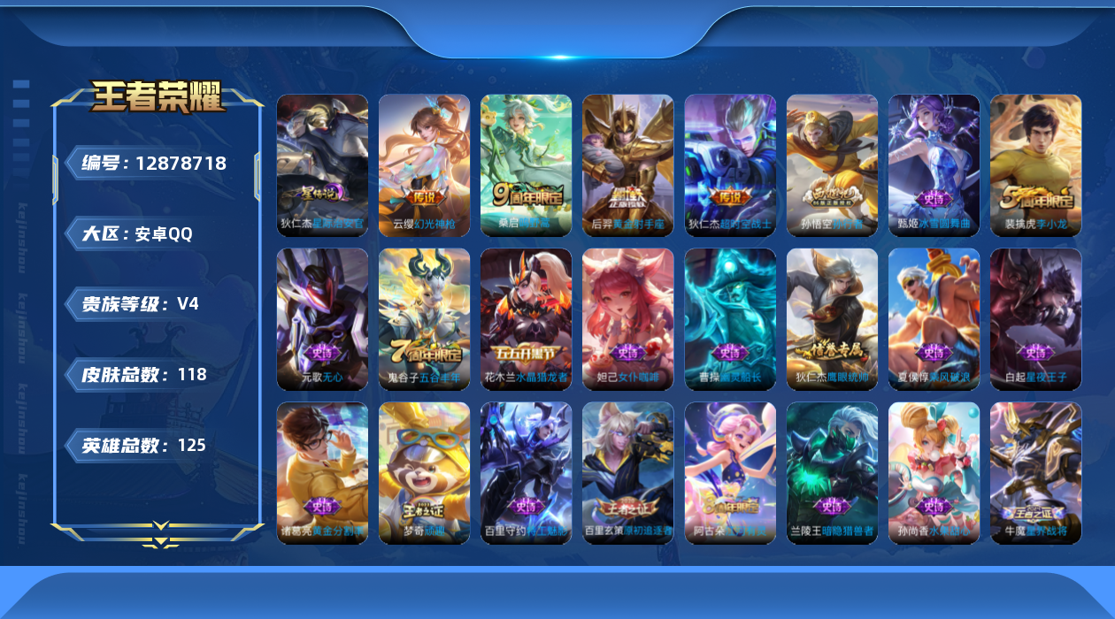 [12878718]安卓Q-V4-永恒钻石II段位-125英雄-118皮肤-1星传说-4传说-32史诗 【传说皮肤】:云缨幻光神枪,桑启鸣野蒿,后羿黄金射手座,狄仁杰超时空战士 【限定皮肤】:姜子牙天穹之誓,狄仁杰阴阳师,元歌无心,项羽海滩派对,孙悟空孙行者,李元芳云中旅人,干将莫邪胡桃夹子,雅典娜黎明之约,鬼谷子五谷丰年,百里玄策原初追逐者,梦奇顽趣,沈梦溪大漠名商,裴擒虎李小龙,裴擒虎擒涛扼浪,米莱狄御霄,鲁班大师探海日志,桑启海盐诗旅,阿古朵江河有灵,张良古海寻踪,蒙犽百解令,蒙恬荣光圣徽,鬼谷子天穹祈灯,沈梦溪龙舞盛年,刘邦剑破天穹,程咬金群星魔术团,周瑜熔金海岸 【赛季限定】:张良古海寻踪,李元芳云中旅人,雅典娜黎明之约,百里玄策原初追逐者,梦奇顽趣,沈梦溪大漠名商,裴擒虎擒涛扼浪,米莱狄御霄,鲁班大师探海日志,桑启海盐诗旅,鬼谷子天穹祈灯,蒙恬荣光圣徽,刘邦剑破天穹,姜子牙天穹之誓 【史诗皮肤】:甄姬冰雪圆舞曲,廉颇地狱岩魂,宫本武藏鬼剑武藏,孙尚香水果甜心,妲己魅力维加斯,妲己女仆咖啡,墨子金属风暴,吕布圣诞狂欢,曹操幽灵船长,花木兰水晶猎龙者,刘邦德古拉伯爵,夏侯惇乘风破浪,小乔缤纷独角兽,兰陵王暗隐猎兽者,诸葛亮黄金分割率,亚瑟心灵战警,百里守约特工魅影,程咬金功夫厨神,白起星夜王子,孙策猫狗日记,狄仁杰鹰眼统帅,百里玄策原初追逐者,裴擒虎李小龙,孙悟空孙行者,雅典娜黎明之约,鬼谷子五谷丰年,元歌无心,梦奇顽趣,阿古朵江河有灵,蒙犽百解令,蒙恬荣光圣徽,牛魔星界战将 【其他皮肤】:项羽海滩派对,韩信教廷特使,韩信街头霸王,达摩大发明家,赵云忍炎影,白起白色死神,扁鹊救世之瞳,典韦黄金武士,亚瑟死亡骑士,张飞五福同心,甄姬花好人间,狄仁杰阴阳师,刘备纽约教父,关羽龙腾万里,狂铁命运角斗场,老夫子功夫老勺,诸葛亮掌控之力,米莱狄御霄,沈梦溪鲨炮海盗猫,姜子牙炽热元素使,哪吒次元突破,鲁班七号黑桃队长,狂铁特工战影,刘禅秘密基地,张良缤纷绘卷,鲁班大师乓乓大师,干将莫邪胡桃夹子,程咬金无双福将,沈梦溪大漠名商,蒙犽胡桃狂想曲,蒙恬蔚蓝守将,李元芳云中旅人,戈娅危途狂花,桑启海盐诗旅,猪八戒潮玩探月行,赵怀真太极少年,裴擒虎擒涛扼浪,太乙真人劲辣红锅,莱西奥西部游侠,鲁班大师探海日志,李元芳妄想特派,张良古海寻踪,钟无艳聚星闪耀,曹操决胜大满贯,鬼谷子天穹祈灯,廉颇功夫炙烤