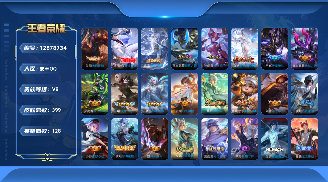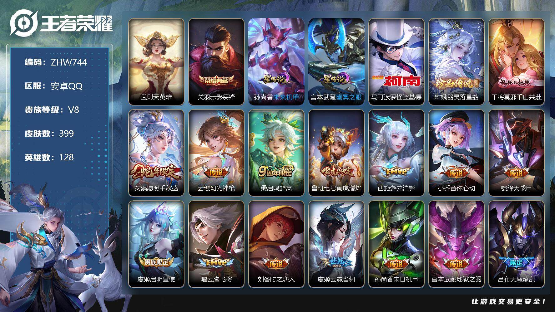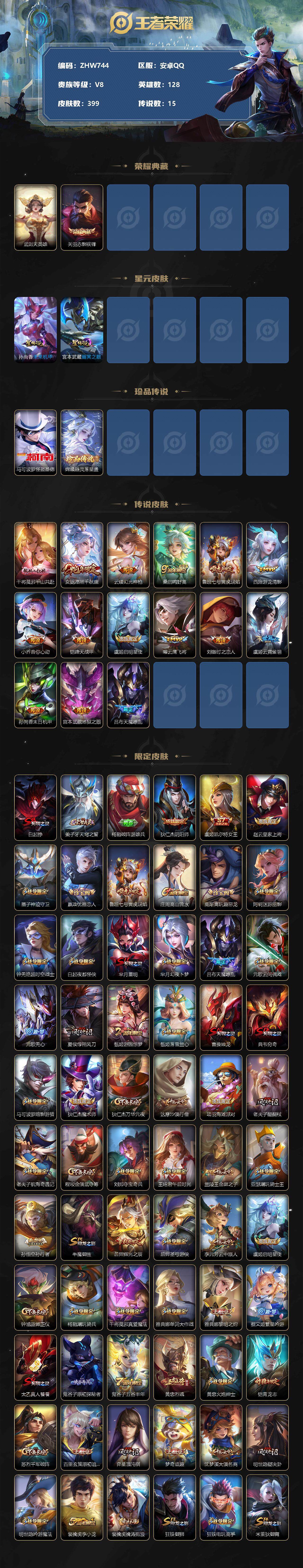 [12878734]【特价急出/详情看图】:安卓Q-V8-最强王者段位-128英雄-399皮肤-1典藏-2星元-2珍品传说-15传说-118史诗