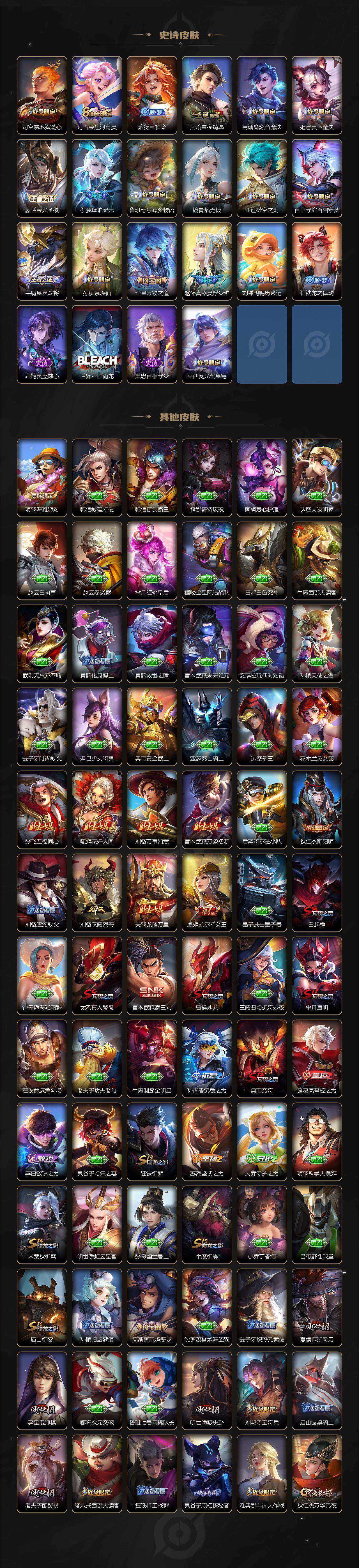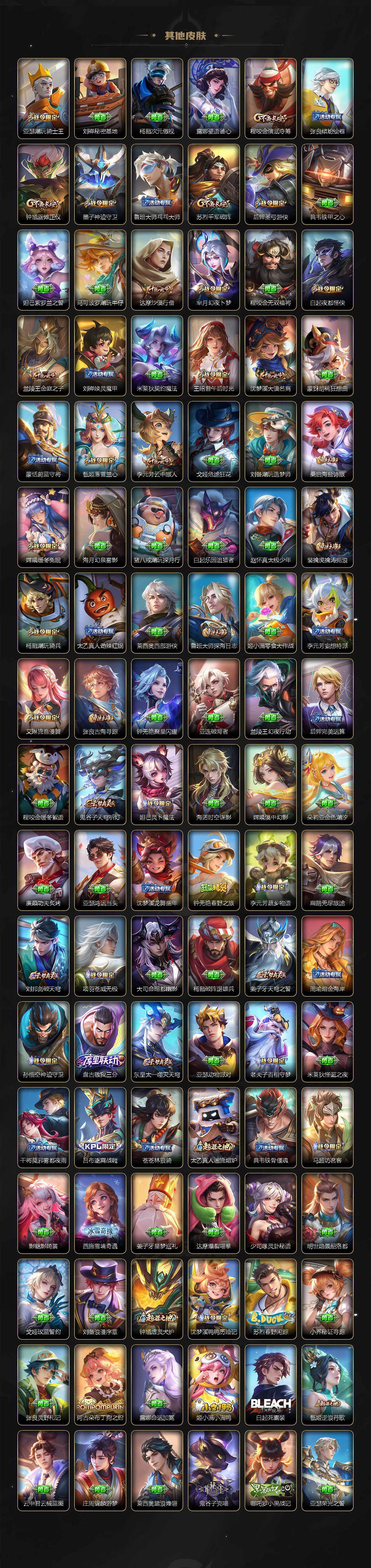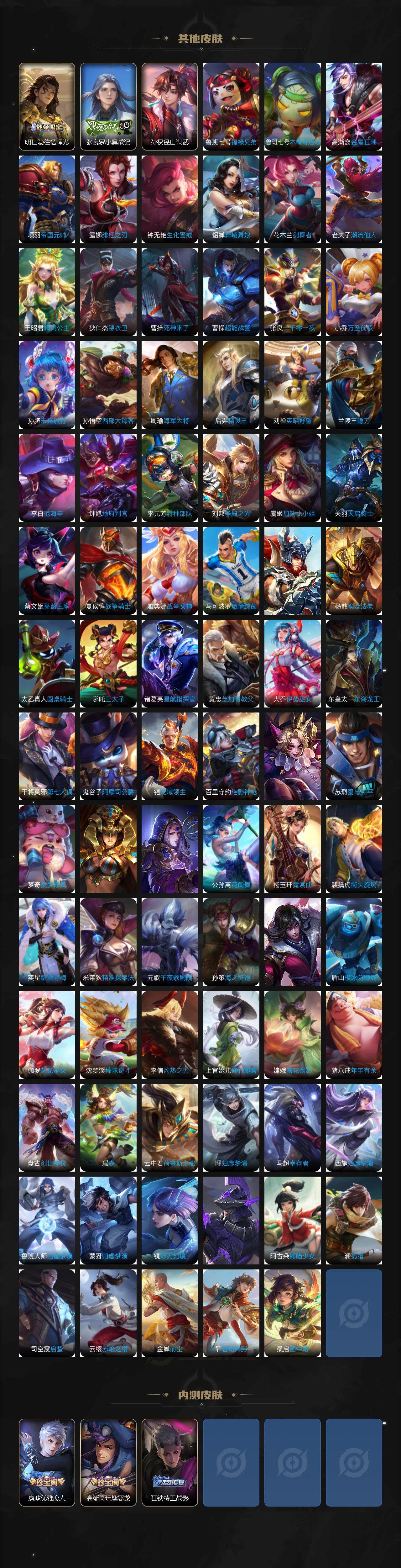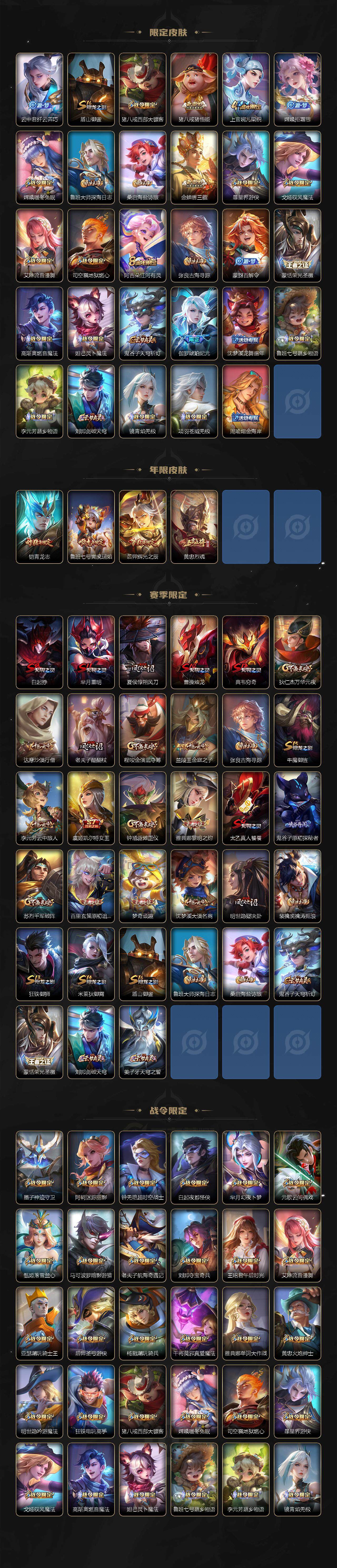 【限定皮肤】:白起狰,姜子牙天穹之誓,杨戬破阵退雄兵,狄仁杰阴阳师,虞姬凯尔特女王,赵云皇家上将,墨子神迹守卫,嬴政优雅恋人,鲁班七号寅虎瑞焰,庄周高山流水,高渐离玩趣恶龙,阿轲迷踪丽影,钟无艳超时空战士,白起夜都怪侠,芈月重明,芈月幻夜卜梦,吕布天魔缭乱,元歌云间偶戏,元歌无心,夏侯惇朔风刀,甄姬游园惊梦,甄姬落雪兰心,曹操烛龙,典韦穷奇,马可波罗暗影游猎,狄仁杰魔术师,狄仁杰万华元夜,达摩沙漠行僧,项羽海滩派对,老夫子醍醐杖,老夫子航海奇遇记,程咬金演武夺筹,刘邦夺宝奇兵,王昭君午后时光,兰陵王金庭之子,亚瑟潮玩骑士王,孙悟空孙行者,牛魔御旌,后羿辉光之辰,后羿圣弓游侠,李元芳云中旅人,虞姬启明星使,钟馗驱傩正仪,杨戬潮玩骑兵,干将莫邪真爱魔法,雅典娜单词大作战,雅典娜黎明之约,蔡文姬繁星吟游,太乙真人饕餮,鬼谷子原初探秘者,鬼谷子五谷丰年,黄忠烈魂,黄忠火炮绅士,铠青龙志,苏烈千军破阵,百里玄策原初追逐者,弈星混沌棋,梦奇顽趣,沈梦溪大漠名商,明世隐疑决卦,明世隐吟游魔法,裴擒虎李小龙,裴擒虎擒涛扼浪,狂铁御狮,狂铁电玩高手,米莱狄御霄,云中君纤云弄巧,盾山御銮,猪八戒西部大镖客,猪八戒猪悟能,上官婉儿梁祝,嫦娥拒霜思,嫦娥暖冬兔眠,鲁班大师探海日志,桑启海盐诗旅,金蝉唐三藏,暃星界游侠,戈娅驭风魔法,艾琳流音漫舞,司空震地狱燃心,阿古朵江河有灵,张良古海寻踪,蒙犽百解令,蒙恬荣光圣徽,高渐离燃音魔法,妲己灵卜魔法,鬼谷子天穹祈灯,伽罗琥珀纪元,沈梦溪龙舞盛年,鲁班七号蔬乡物语,李元芳蔬乡物语,刘邦剑破天穹,镜青焰无极,项羽苍威无极,周瑜熔金海岸
