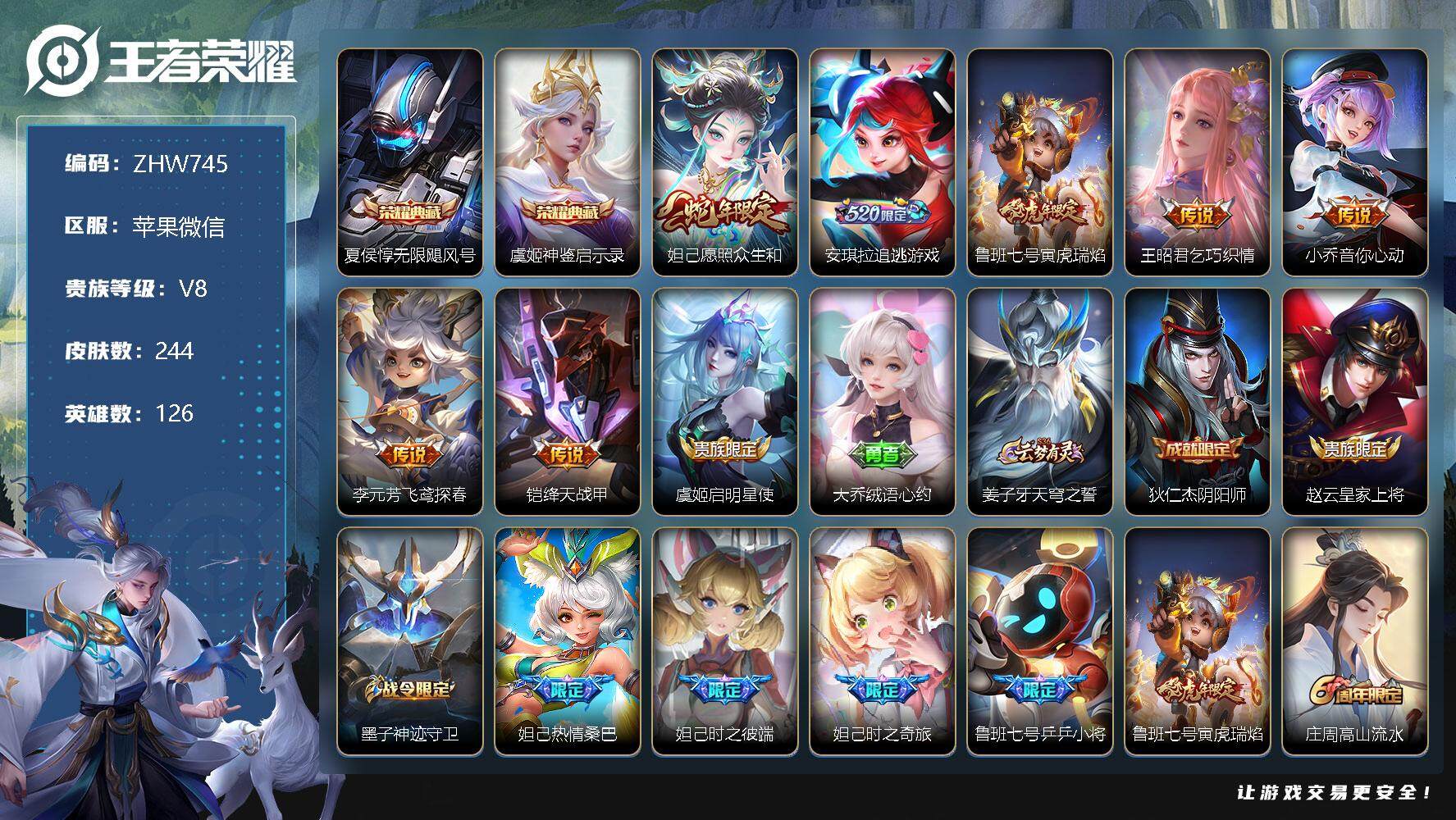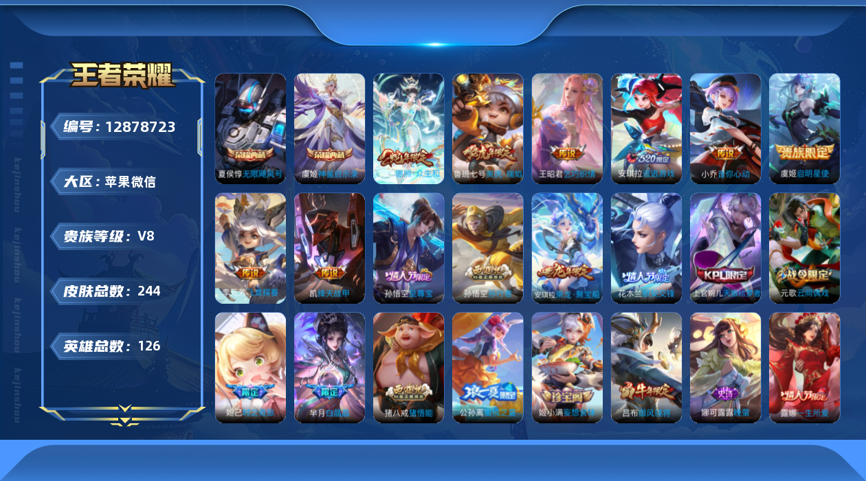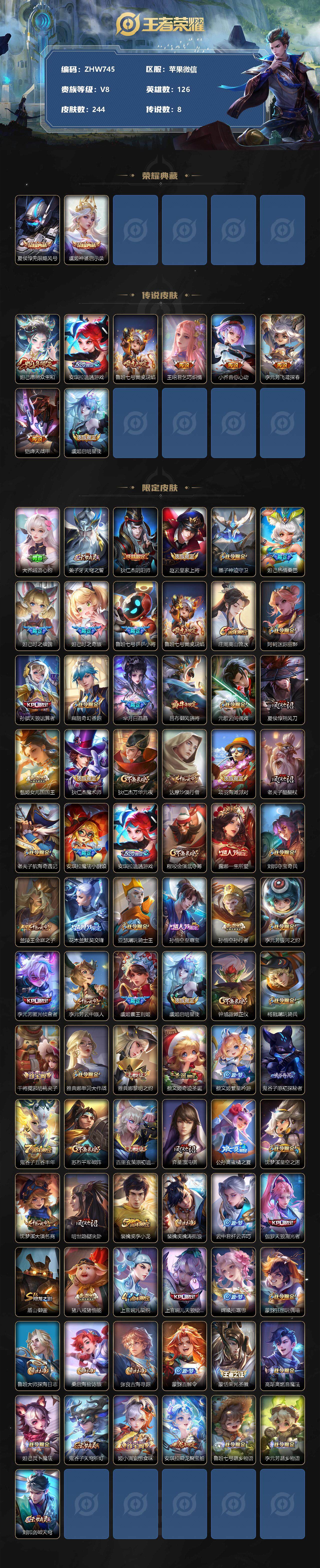 [12878723]苹果WX-V8-最强王者段位-126英雄-244皮肤-2典藏-0珍品无双-0无双-0珍品传说-8传说-72史诗-钱包无法实名