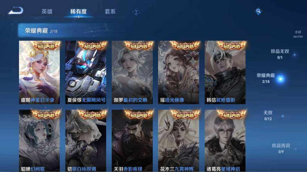 - PX_2106370-Q/至尊星耀/91皮肤/101英雄/0典藏/0珍品无双/0无双/0珍品传说/17传说/26史诗/8稀有英雄 【17 传说皮肤】鹤归松栖 云缨,云霓雀翎 虞姬,逐花归海 澜,飞鸢探春 李元芳,齐天大圣 孙悟空,落雪白狼 亚连,霜月吟 露娜,乘龙·问璇玑 孙尚香,末日机甲 孙尚香,乘龙·淬吴钩 孙策,山海·炽霜斩 李信,乘龙·铭钟鼎 赵云,妄想实况 马可波罗,寅虎·赤拳 裴擒虎,