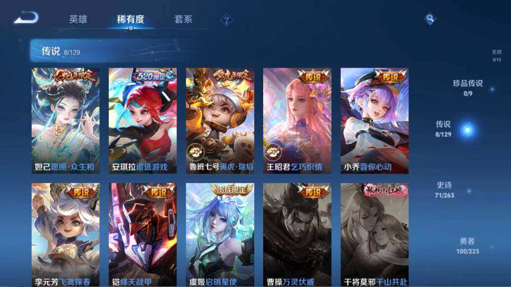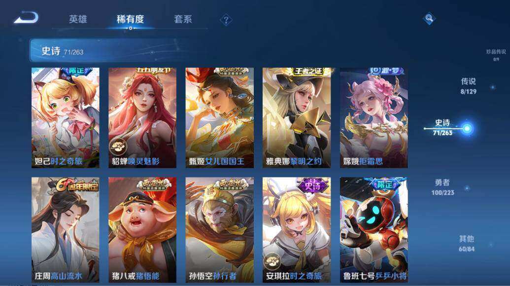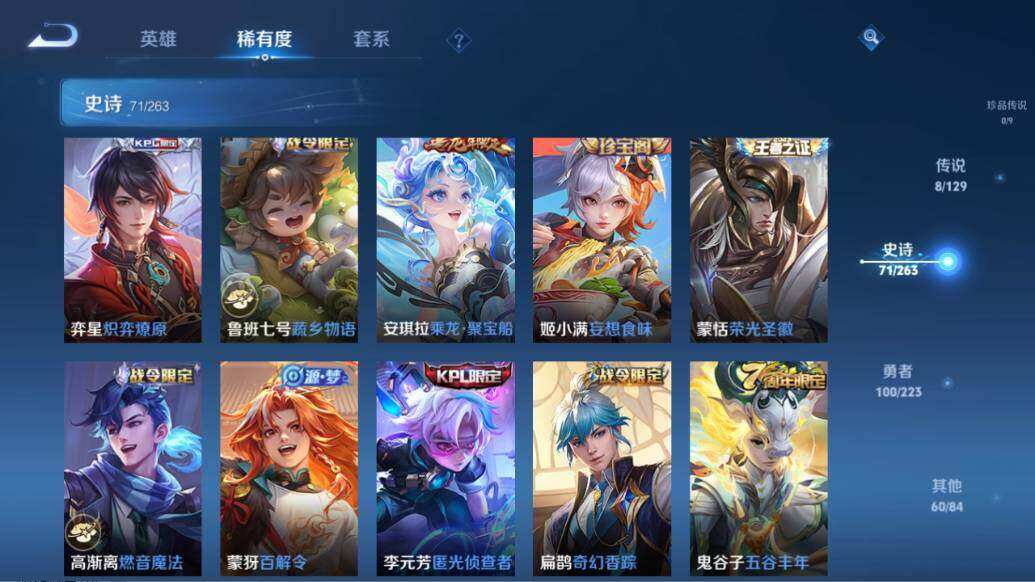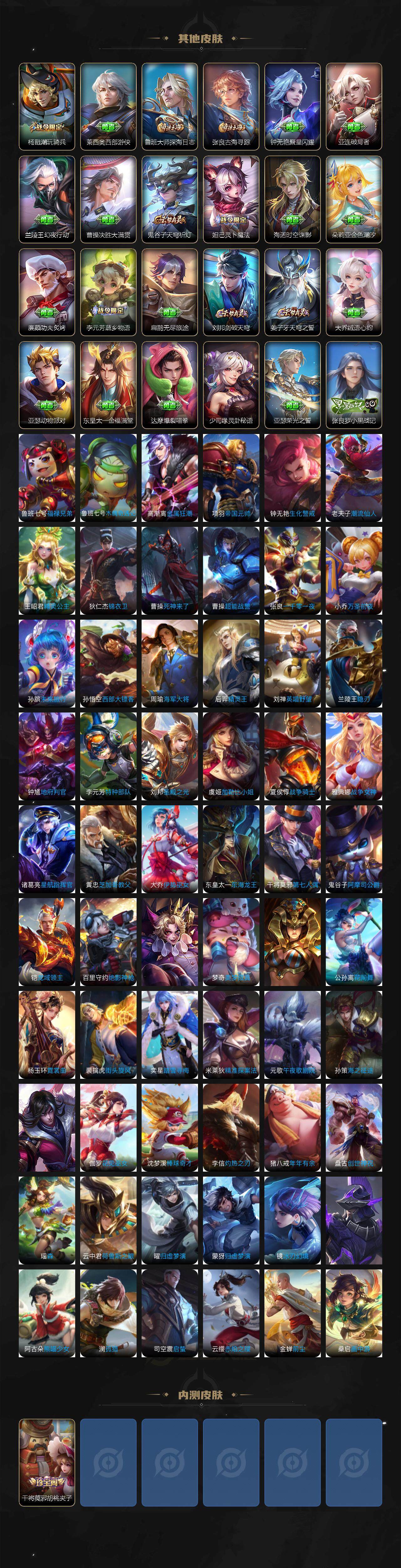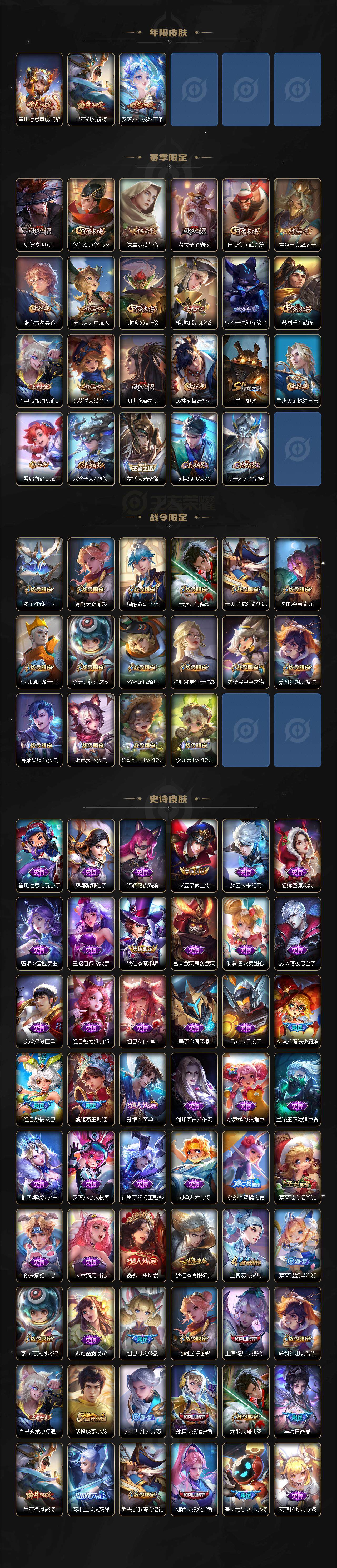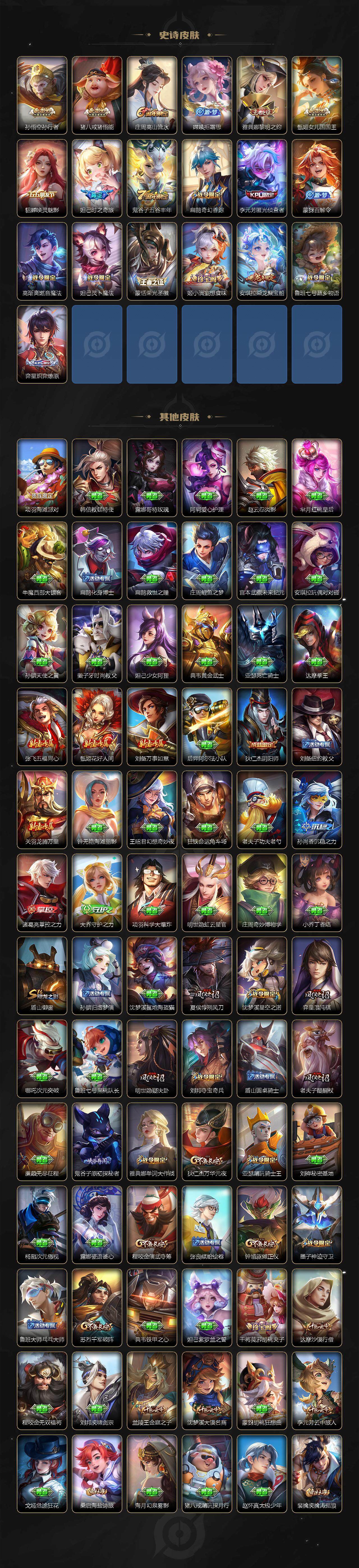 【限定皮肤】:大乔绒语心约,姜子牙天穹之誓,狄仁杰阴阳师,赵云皇家上将,墨子神迹守卫,妲己热情桑巴,妲己时之彼端,妲己时之奇旅,鲁班七号乒乒小将,鲁班七号寅虎瑞焰,庄周高山流水,阿轲迷踪丽影,孙膑天狼运算者,扁鹊奇幻香踪,芈月白晶晶,吕布御风骁将,元歌云间偶戏,夏侯惇朔风刀,甄姬女儿国国王,狄仁杰魔术师,狄仁杰万华元夜,达摩沙漠行僧,项羽海滩派对,老夫子醍醐杖,老夫子航海奇遇记,安琪拉魔法小厨娘,安琪拉追逃游戏,程咬金演武夺筹,露娜一生所爱,刘邦夺宝奇兵,兰陵王金庭之子,花木兰默契交锋,亚瑟潮玩骑士王,孙悟空至尊宝,孙悟空孙行者,李元芳银河之约,李元芳匿光侦查者,李元芳云中旅人,虞姬霸王别姬,虞姬启明星使,钟馗驱傩正仪,杨戬潮玩骑兵,干将莫邪胡桃夹子,雅典娜单词大作战,雅典娜黎明之约,蔡文姬奇迹圣诞,蔡文姬繁星吟游,鬼谷子原初探秘者,鬼谷子五谷丰年,苏烈千军破阵,百里玄策原初追逐者,弈星混沌棋,公孙离蜜橘之夏,沈梦溪星空之诺,沈梦溪大漠名商,明世隐疑决卦,裴擒虎李小龙,裴擒虎擒涛扼浪,云中君纤云弄巧,伽罗天狼溯光者,盾山御銮,猪八戒猪悟能,上官婉儿梁祝,上官婉儿天狼绘梦者,嫦娥拒霜思,蒙犽狂想玩偶喵,鲁班大师探海日志,桑启海盐诗旅,张良古海寻踪,蒙犽百解令,蒙恬荣光圣徽,高渐离燃音魔法,妲己灵卜魔法,鬼谷子天穹祈灯,姬小满妄想食味,安琪拉乘龙聚宝船,鲁班七号蔬乡物语,李元芳蔬乡物语,刘邦剑破天穹