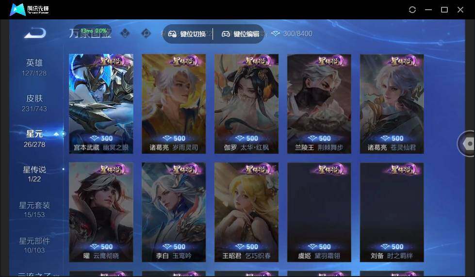 - [12162768]V8 2典藏 1无双 21传说 125英雄 347皮肤 可修改实名 优质装备:全息碎影(猴子典藏),弑枪猎影(韩信典藏),器灵·螭龙剑,云鹰飞将(小将军),黄金白羊座,炽阳神光,一念神魔,末日机甲-孙尚香(绿蚂蚱),地狱火,仲夏夜之梦(大飞蛾),地狱之眼,李逍遥,淬星耀世,末日机甲-孙策,记忆之芯(机甲兔),涂山容容 传说皮:幻光神枪 珍宝阁皮:妄想食味,蔷薇恋人,女武神,玩趣恶龙 限定皮:愿照·九州拓(澜年限),愿照·山河定(司空震年限),鸣野蒿,至尊宝,傲雪梅枪,神威(电光马子),瑞麟志(木兰年限),遇见飞天,高山流水,诗剑行,齐天大圣,五谷丰年,梁祝,虎魄,李小龙,孙行者,猪悟能,寅虎·赤拳(老虎年限),时之祈愿-云中君,百木心枪,深海之息(深海大菠萝),山海·玄木吟(马可年限) 史诗皮:鸭鸭历险记-刘禅,苍鳞隐世,器灵·浮梦炉,糖绘人间,狼魂孤将,化蝶舞,星界战将,龙之律动,茶境仙,破空之剑,蒙犽顽岩魄,蔬乡物语(鲁班七号),织梦人,紫霞仙子,苍穹之光,电玩小子(小书包),黄金分割率,特工魅影,千年之狐,永昼,江河有灵,魅语,蒙恬荣光圣徽,无限星赏官,冰冠公主,青蛇,偶像歌手,晚萤,电玩·爆裂旋风,暗夜猫娘,末日机甲-吕布,猫狗日记-孙策,乱世虎臣,节奏热浪,修罗,女仆咖啡,摇滚巨星,水果甜心,绅士熊喵,天才门将,星夜王子,心灵骇客,功夫厨神,德古拉伯爵,暗隐猎兽者,幽灵船长,鬼剑武藏,暗渊魔法,心灵战警,乐园奇幻夜,舞动绿茵,地狱岩魂,纤云弄巧,拒霜思,缤纷独角兽,乘风破浪,逐浪之夏,水晶猎龙者,曙光守护者,热力回旋,箭羽风息,金属风暴,原初追逐者,圣诞狂欢,圣诞恋歌,鹰眼统帅,黎明之约,赏金猎手,滕王阁序,无心,未来纪元-赵云
