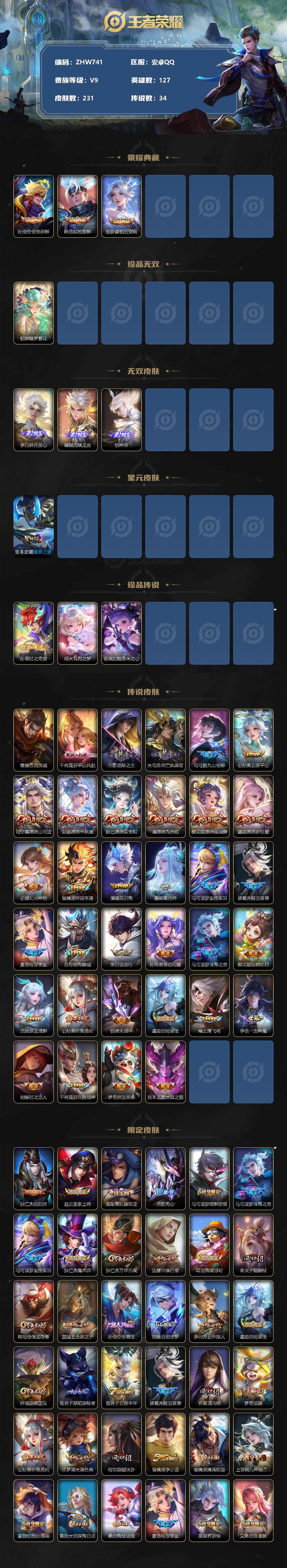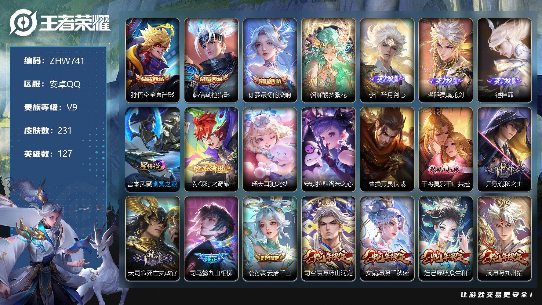 [12878776]【特价急出/详情看图】:安卓Q-V9-最强王者段位-127英雄-231皮肤-3典藏-1珍品无双-3无双-1星元-3珍品传说-34传说-57史诗