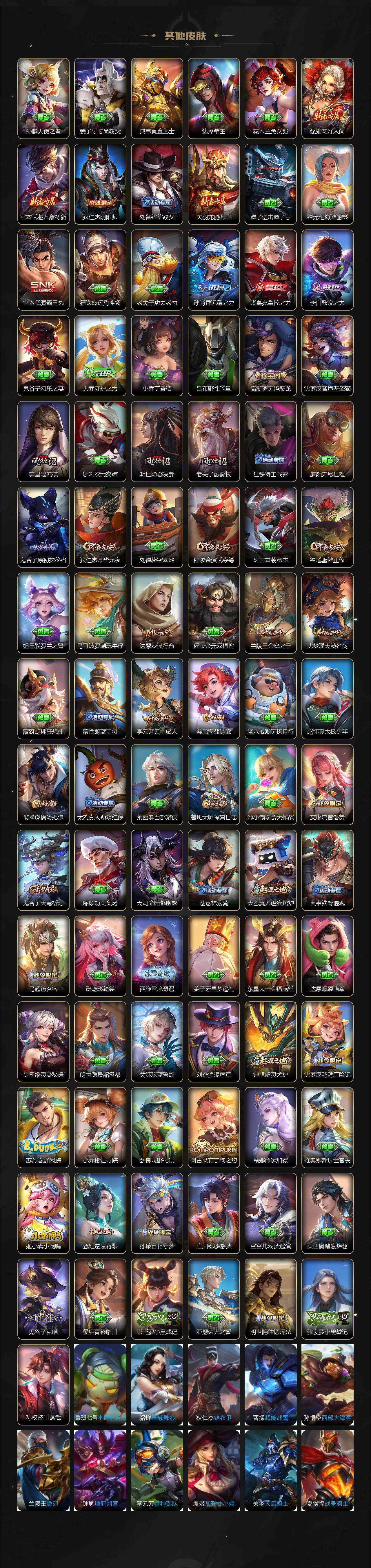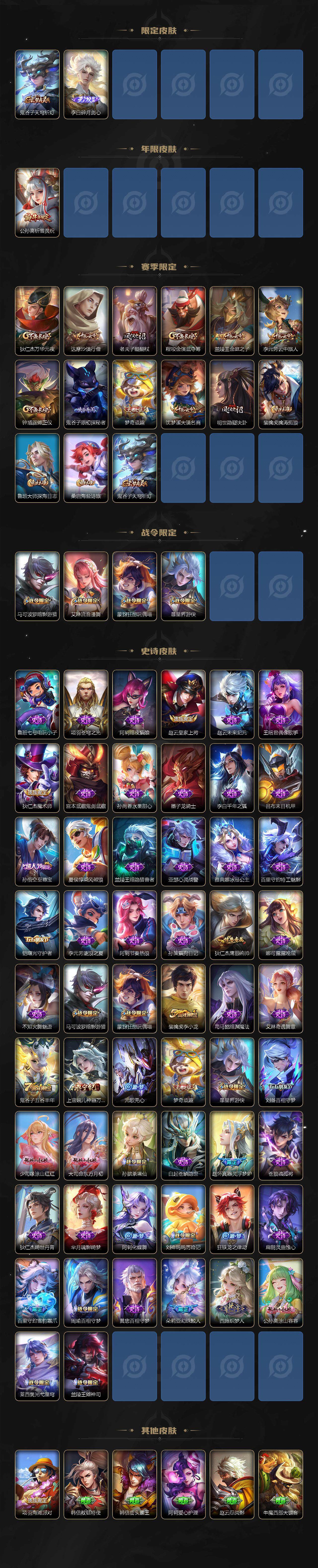 【赛季限定】:狄仁杰万华元夜,达摩沙漠行僧,老夫子醍醐杖,程咬金演武夺筹,兰陵王金庭之子,李元芳云中旅人,钟馗驱傩正仪,鬼谷子原初探秘者,弈星混沌棋,梦奇顽趣,沈梦溪大漠名商,明世隐疑决卦,裴擒虎擒涛扼浪,鲁班大师探海日志,桑启海盐诗旅,鬼谷子天穹祈灯