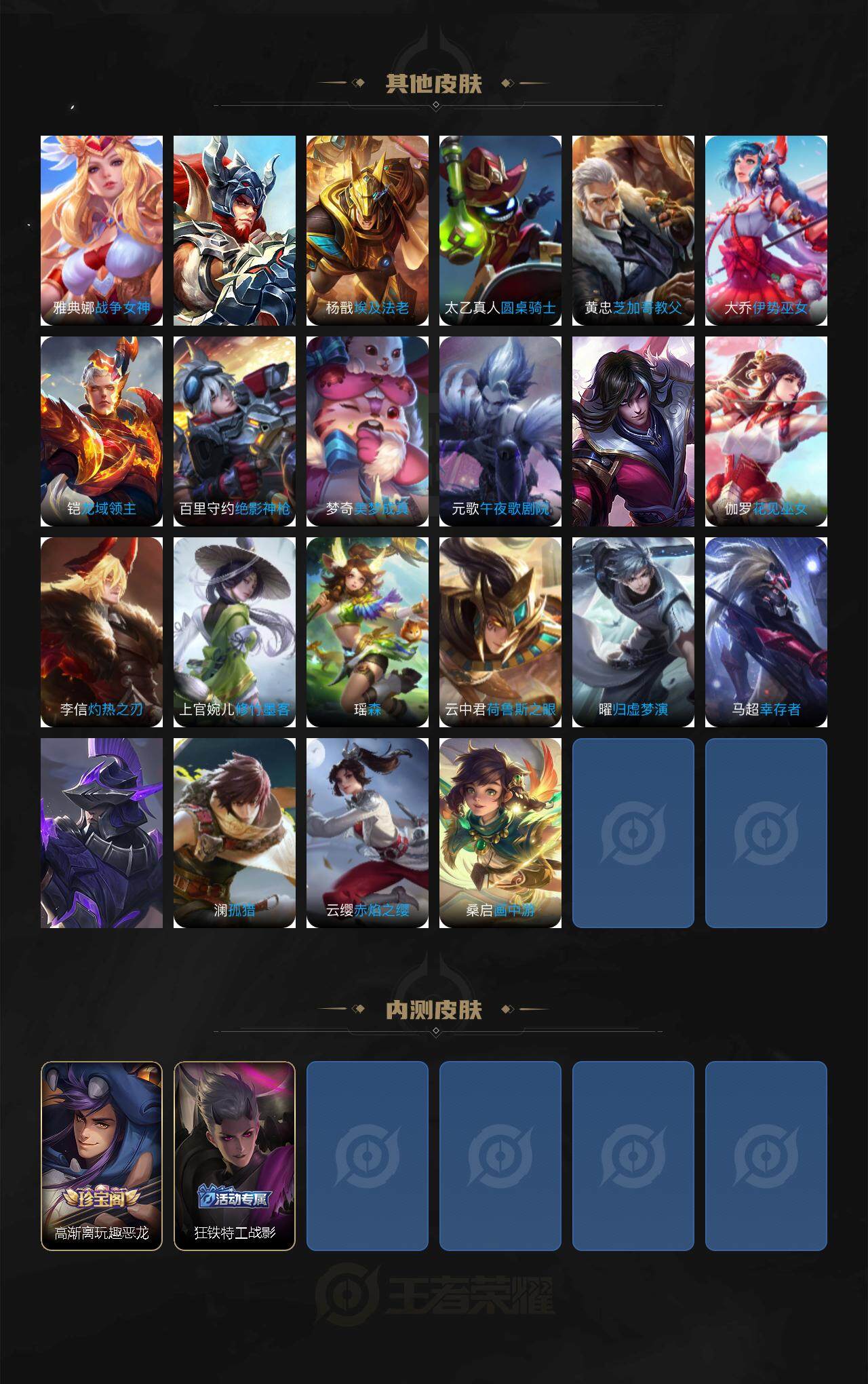 【史诗皮肤】:鲁班七号电玩小子,项羽苍穹之光,阿轲暗夜猫娘,赵云皇家上将,赵云未来纪元,王昭君
