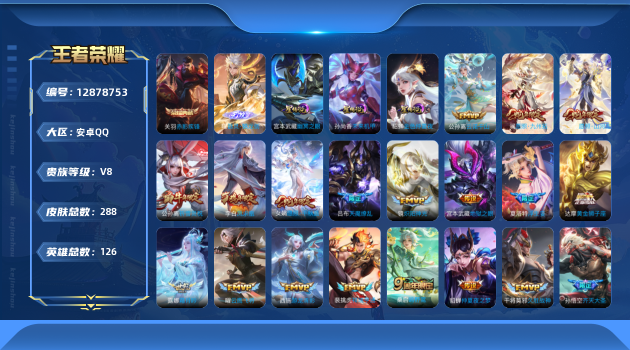 - [12259753]V7 1典藏 11传说 125英雄 235皮肤 可修改实名 优质装备:鸣剑·曳影,云鹰飞将(小将军),无双飞将,电玩·雷克斯,妄想奇谈,霜月吟,澜逐花归海,涂山容容 珍宝阁皮:胡桃夹子,万物之道 限定皮:愿照·九州拓(澜年限),愿照·岁时盈(虞姬年限),鸣野蒿,至尊宝,诗剑行,五谷丰年,梁祝,祈雪灵祝(雪兔子),天狼绘梦者,神器·万象笔,山海·玄木吟(马可年限) 史诗皮:赞萌露比,器灵·浮梦炉,化蝶舞,星界战将,谪仙醉月,龙之律动,石田雨龙,茶境仙,炽弈燎原,战舞者,上官婉儿群星魔术团,蔬乡物语(鲁班七号),百相守梦-黄忠,织梦人,守夜人,紫霞仙子,黄金分割率,特工魅影,千年之狐,江河有灵,百解令(蒙犽),蒙恬荣光圣徽,无限星赏官,匿光破解者,电玩·爆裂旋风,末日机甲-吕布,猫狗日记-大乔,修罗,女仆咖啡,水果甜心,星夜王子,德古拉伯爵,暗隐猎兽者,鬼剑武藏,心灵战警,舞动绿茵,地狱岩魂,拒霜思,缤纷独角兽,乘风破浪,逐浪之夏,水晶猎龙者,曙光守护者,箭羽风息,金属风暴,圣诞狂欢,圣诞恋歌,鹰眼统帅,魅力维加斯,赏金猎手,无心,未来纪元-赵云