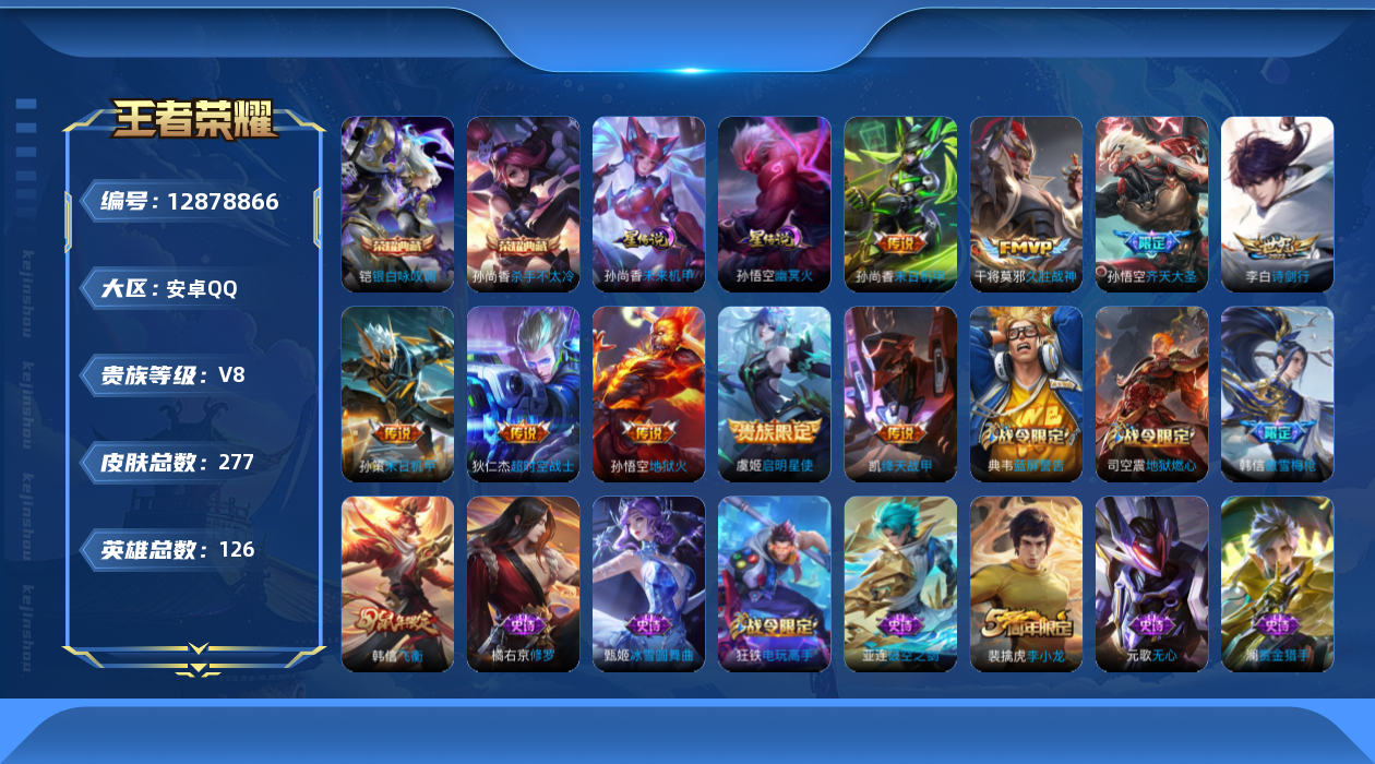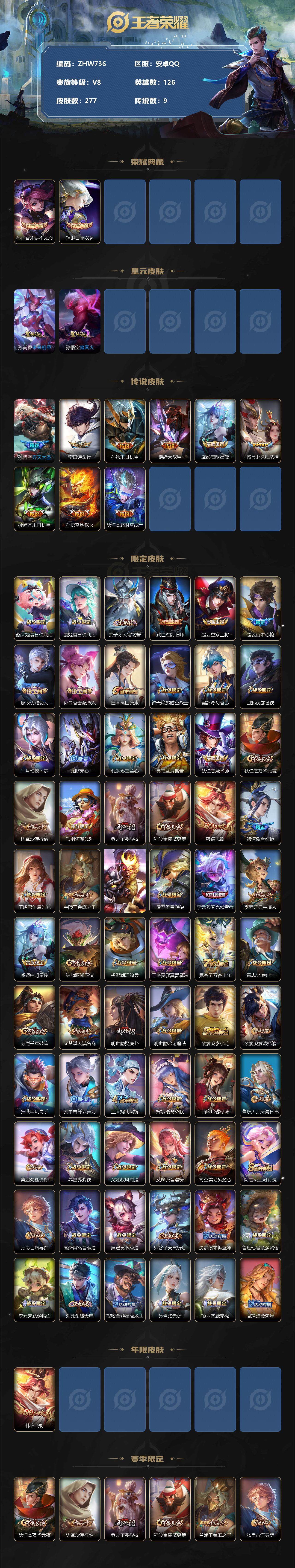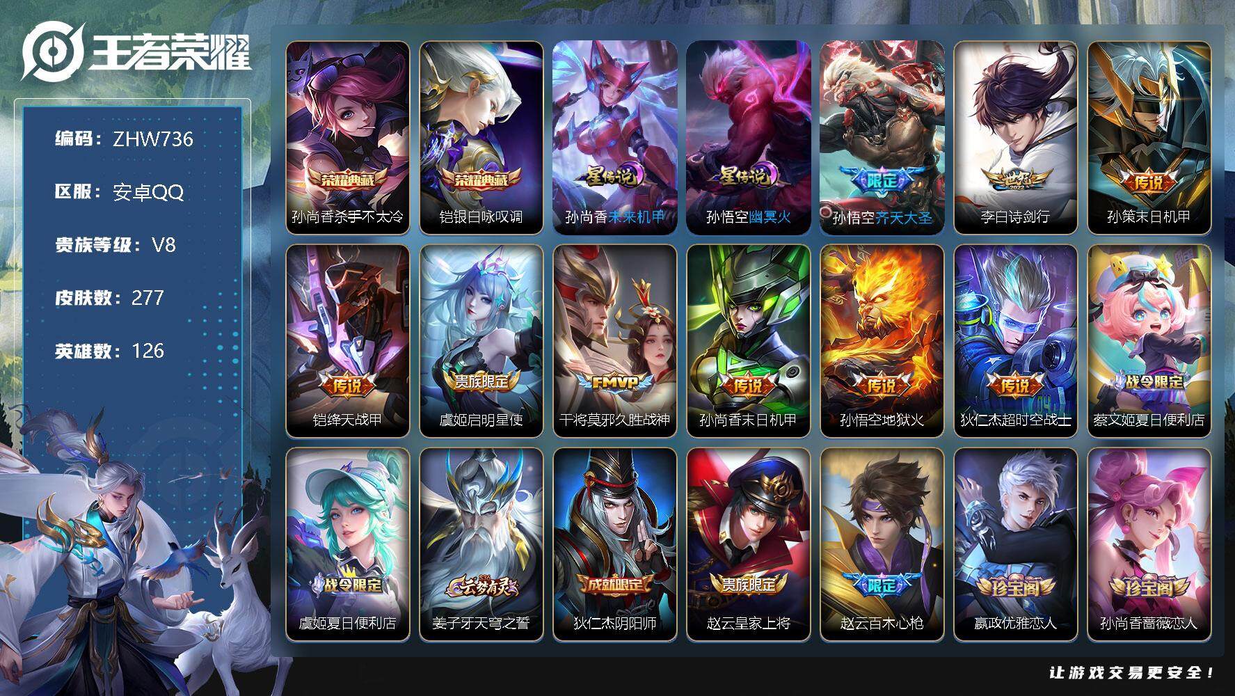 [12878866]【特价急出/详情看图】安卓Q-V8-尊贵铂金III段位-126英雄-277皮肤-2典藏-9传说-75史诗 【荣耀典藏】:孙尚香杀手不太冷,铠银白咏叹调 【传说皮肤】:孙悟空齐天大圣,李白诗剑行,孙策末日机甲,铠绛天战甲,虞姬启明星使,干将莫邪久胜战神,孙尚香末日机甲,孙悟空地狱火,狄仁杰超时空战士 【限定皮肤】:蔡文姬夏日便利店,虞姬夏日便利店,姜子牙天穹之誓,狄仁杰阴阳师,赵云皇家上将,赵云百木心枪,嬴政优雅恋人,孙尚香蔷薇恋人,庄周高山流水,钟无艳超时空战士,扁鹊奇幻香踪,白起夜都怪侠,芈月幻夜卜梦,元歌无心,甄姬落雪兰心,典韦蓝屏警告,狄仁杰魔术师,狄仁杰万华元夜,达摩沙漠行僧,项羽海滩派对,老夫子醍醐杖,程咬金演武夺筹,韩信飞衡,韩信傲雪梅枪,王昭君午后时光,兰陵王金庭之子,孙悟空齐天大圣,后羿圣弓游侠,李元芳匿光侦查者,李元芳云中旅人,虞姬启明星使,钟馗驱傩正仪,杨戬潮玩骑兵,干将莫邪真爱魔法,鬼谷子五谷丰年,黄忠火炮绅士,苏烈千军破阵,沈梦溪大漠名商,明世隐疑决卦,明世隐吟游魔法,裴擒虎李小龙,裴擒虎擒涛扼浪,狂铁电玩高手,云中君纤云弄巧,上官婉儿梁祝,嫦娥暖冬兔眠,西施玲珑珍味,鲁班大师探海日志,桑启海盐诗旅,暃星界游侠,戈娅驭风魔法,艾琳流音漫舞,司空震地狱燃心,阿古朵江河有灵,张良古海寻踪,高渐离燃音魔法,妲己灵卜魔法,鬼谷子天穹祈灯,沈梦溪龙舞盛年,鲁班七号蔬乡物语,李元芳蔬乡物语,刘邦剑破天穹,程咬金群星魔术团,镜青焰无极,项羽苍威无极,周瑜熔金海岸 【年限皮肤】:韩信飞衡 【赛季限定】:狄仁杰万华元夜,达摩沙漠行僧,老夫子醍醐杖,程咬金演武夺筹,兰陵王金庭之子,张良古海寻踪,李元芳云中旅人,钟馗驱傩正仪,苏烈千军破阵,沈梦溪大漠名商,明世隐疑决卦,裴擒虎擒涛扼浪,鲁班大师探海日志,桑启海盐诗旅,鬼谷子天穹祈灯,刘邦剑破天穹,姜子牙天穹之誓 【战令限定】:蔡文姬夏日便利店,虞姬夏日便利店,钟无艳超时空战士,扁鹊奇幻香踪,白起夜都怪侠,芈月幻夜卜梦,甄姬落雪兰心,典韦蓝屏警告,王昭君午后时光,艾琳流音漫舞,后羿圣弓游侠,杨戬潮玩骑兵,干将莫邪真爱魔法,黄忠火炮绅士,明世隐吟游魔法,狂铁电玩高手,嫦娥暖冬兔眠,西施玲珑珍味,司空震地狱燃心,暃星界游侠,戈娅驭风魔法,高渐离燃音魔法,妲己灵卜魔法,鲁班七号蔬乡物语,李元芳蔬乡物语,镜青焰无极,项羽苍