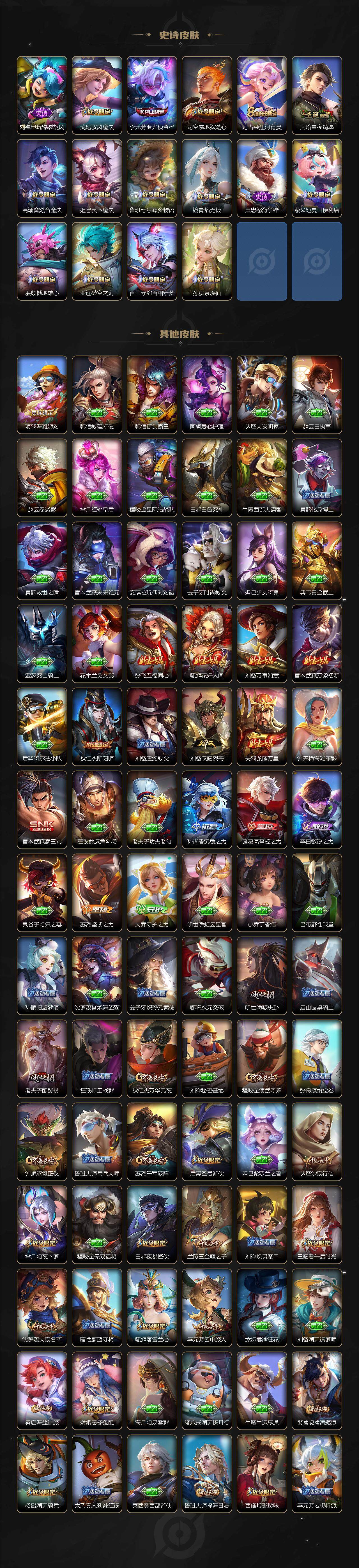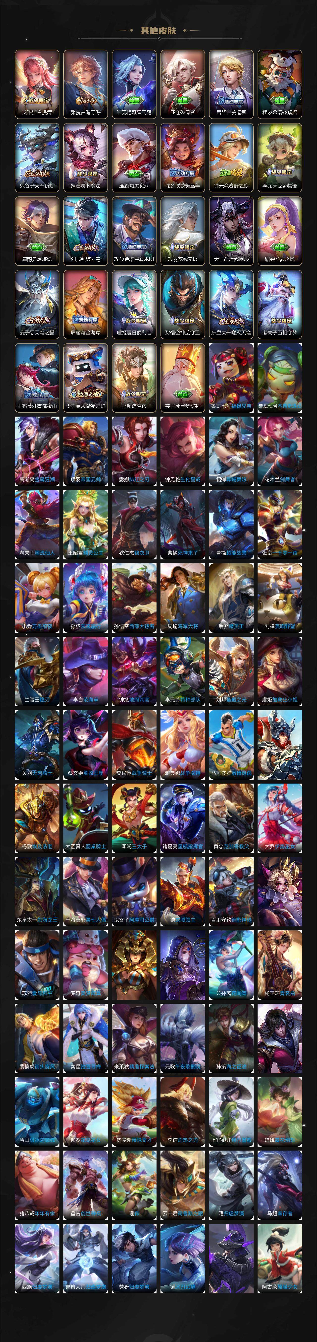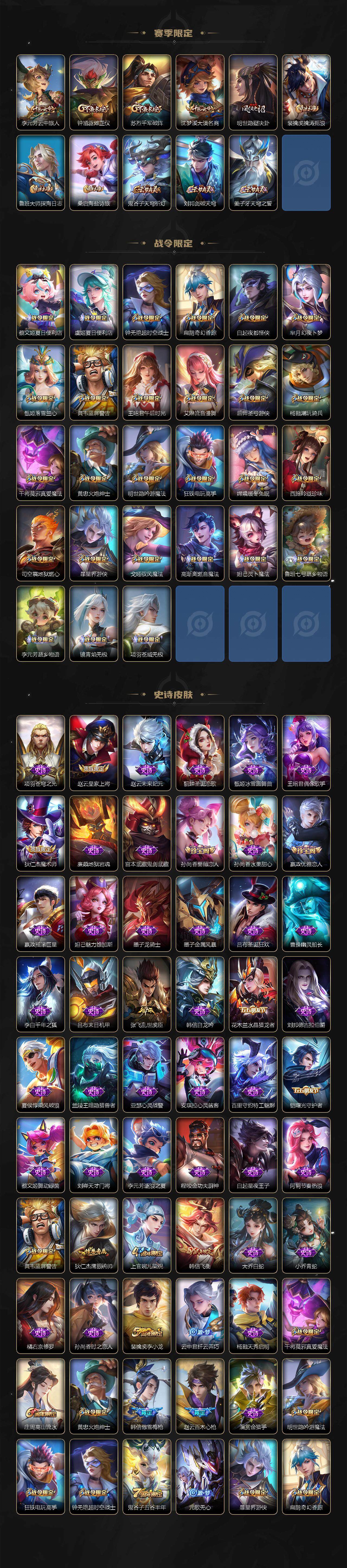 【限定皮肤】:蔡文姬夏日便利店,虞姬夏日便利店,姜子牙天穹之誓,狄仁杰阴阳师,赵云皇家上将,赵云百木心枪,嬴政优雅恋人,孙尚香蔷薇恋人,庄周高山流水,钟无艳超时空战士,扁鹊奇幻香踪,白起夜都怪侠,芈月幻夜卜梦,元歌无心,甄姬落雪兰心,典韦蓝屏警告,狄仁杰魔术师,狄仁杰万华元夜,达摩沙漠行僧,项羽海滩派对,老夫子醍醐杖,程咬金演武夺筹,韩信飞衡,韩信傲雪梅枪,王昭君午后时光,兰陵王金庭之子,孙悟空齐天大圣,后羿圣弓游侠,李元芳匿光侦查者,李元芳云中旅人,虞姬启明星使,钟馗驱傩正仪,杨戬潮玩骑兵,干将莫邪真爱魔法,鬼谷子五谷丰年,黄忠火炮绅士,苏烈千军破阵,沈梦溪大漠名商,明世隐疑决卦,明世隐吟游魔法,裴擒虎李小龙,裴擒虎擒涛扼浪,狂铁电玩高手,云中君纤云弄巧,上官婉儿梁祝,嫦娥暖冬兔眠,西施玲珑珍味,鲁班大师探海日志,桑启海盐诗旅,暃星界游侠,戈娅驭风魔法,艾琳流音漫舞,司空震地狱燃心,阿古朵江河有灵,张良古海寻踪,高渐离燃音魔法,妲己灵卜魔法,鬼谷子天穹祈灯,沈梦溪龙舞盛年,鲁班七号蔬乡物语,李元芳蔬乡物语,刘邦剑破天穹,程咬金群星魔术团,镜青焰无极,项羽苍威无极,周瑜熔金海岸
