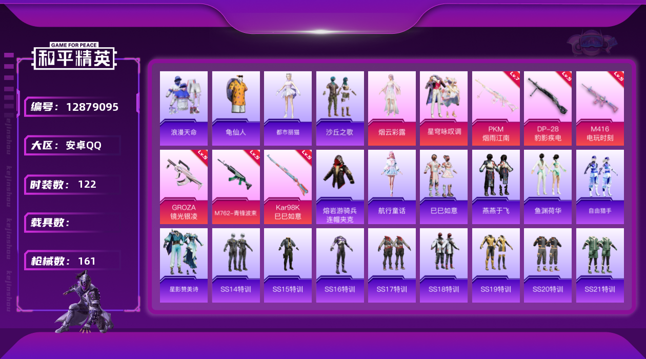 - PX_2102968- 苹果手Q-15王牌印记-6粉装-9特效枪-1载具-88027热力值-194套装-266枪皮-1卓越印记-0传奇印记 【6粉装】,梦幻火箭,天使彩虹糖,幻影飞狐,筑梦精灵,烈焰拳霸,金丰海韵 【9特效枪】AKM-炫紫旋律-4级 AKM-梦之光华-7级 SCAR-L-锦绣绵绵-5级 M416-五爪金龙-7级 GROZA-镜光银凌-5级 AUG-暖羊咩咩-5级 Kar98K-巳巳