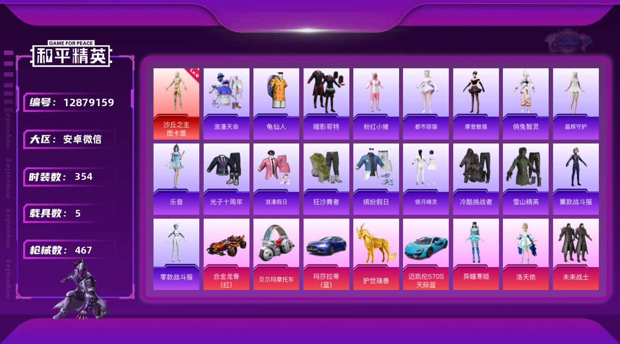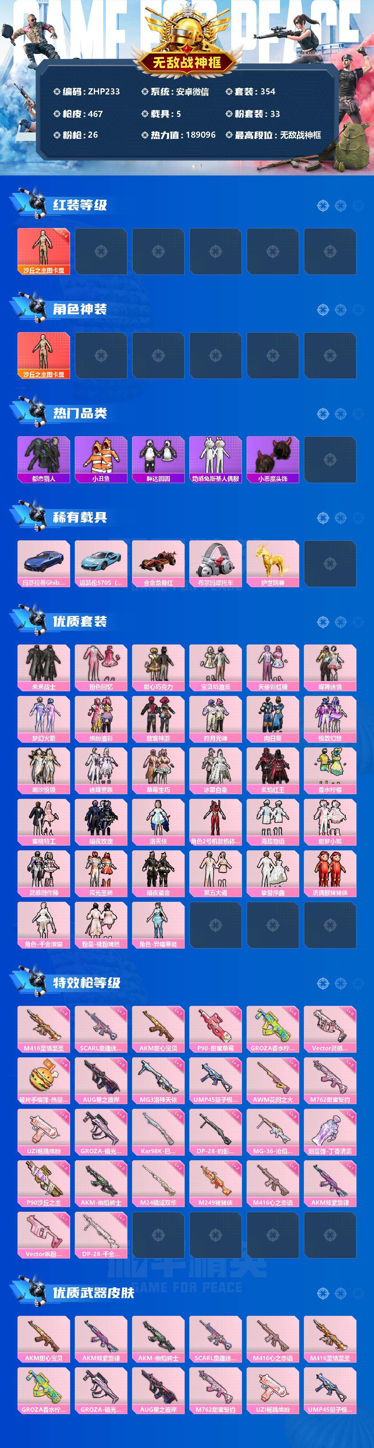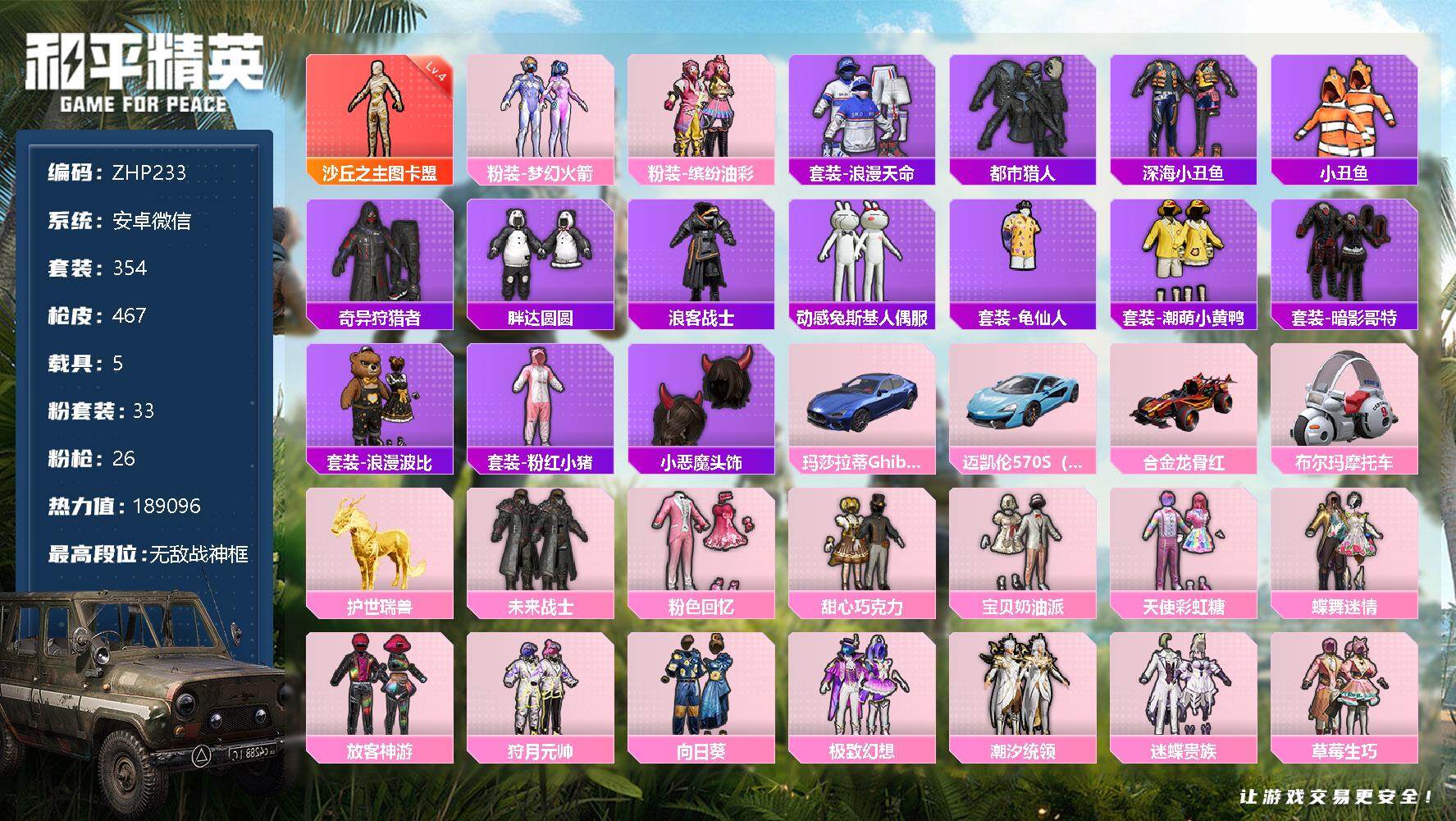 [12879159]战神框!4级图卡盟!9级至情至圣!安卓 微信-无敌战神框-1神装-33粉装-26特效枪-5载具-14粉色飞行器-189096热力值-29王牌印记-354套装-467枪皮