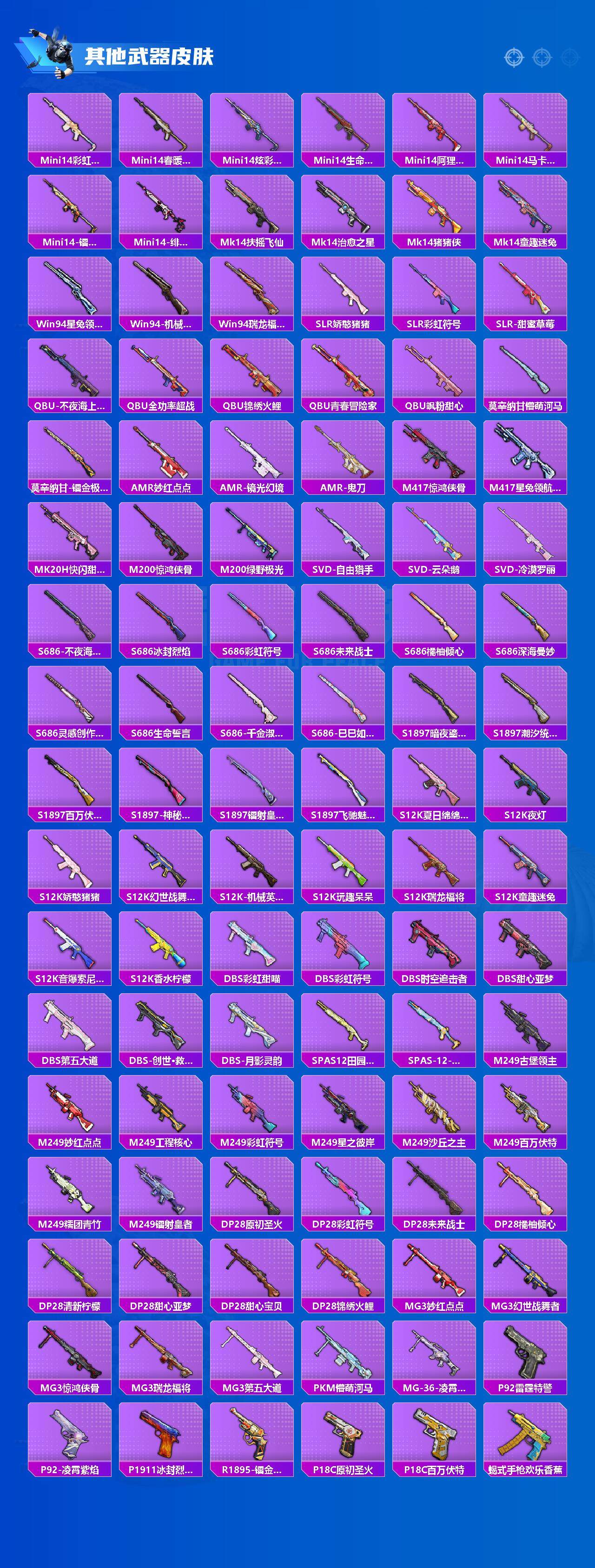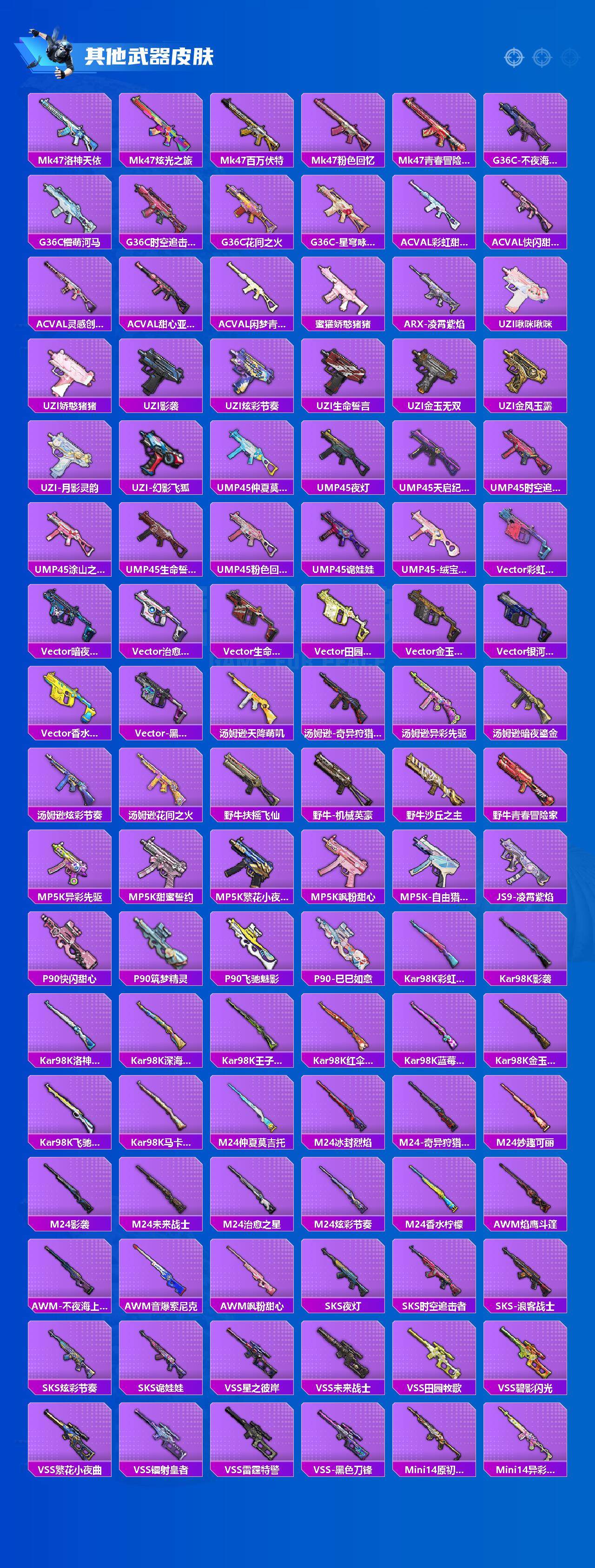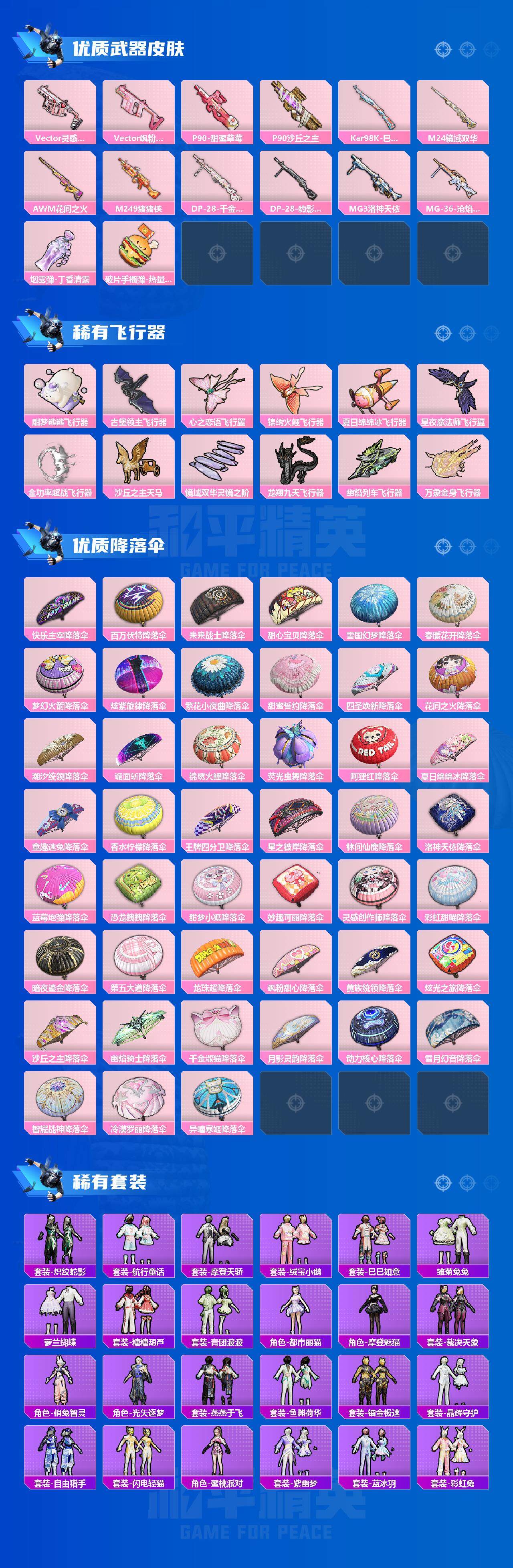 AKM-甜心宝贝,AKM-炫紫旋律,AKM-幽焰骑士,SCAR-L-童趣迷兔,M416-心之恋语,M416-至情至圣,GROZA-香水柠檬,GROZA-镜光银凌,AUG-星之彼岸,M762-甜蜜誓约,UZI-畅跳缤纷,UMP45-量子极限,Vector-灵感创作师,Vector-飒粉甜心,P90-甜蜜草莓,P90-沙丘之主,Kar98K-巳巳如意,M24-镜域双华,AWM-花间之火,M249-猪猪侠,DP-28-千金淑猫,MG3-洛神天依,烟雾弹-丁香清露,破片手榴弹-热量炸弹