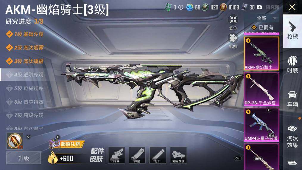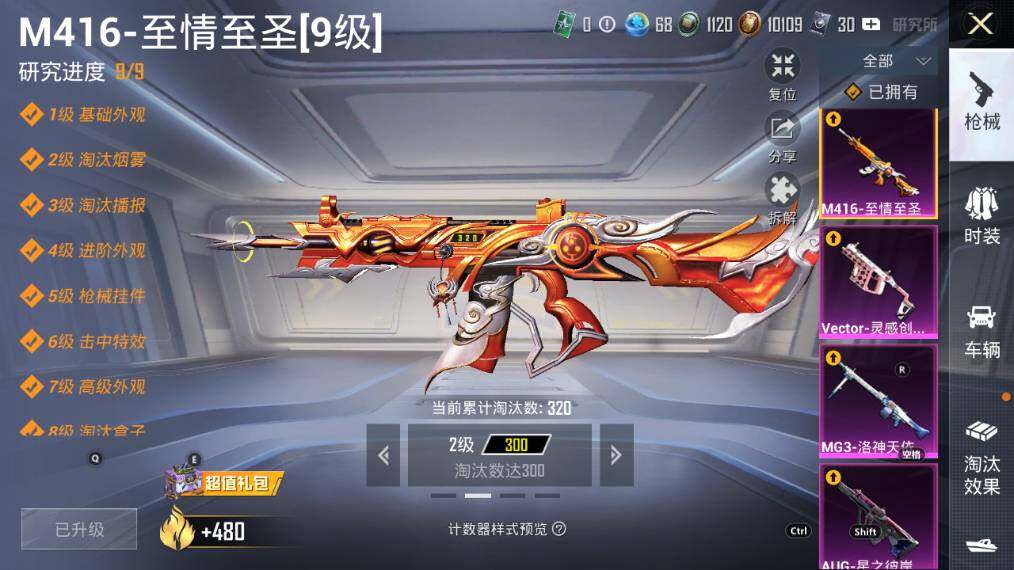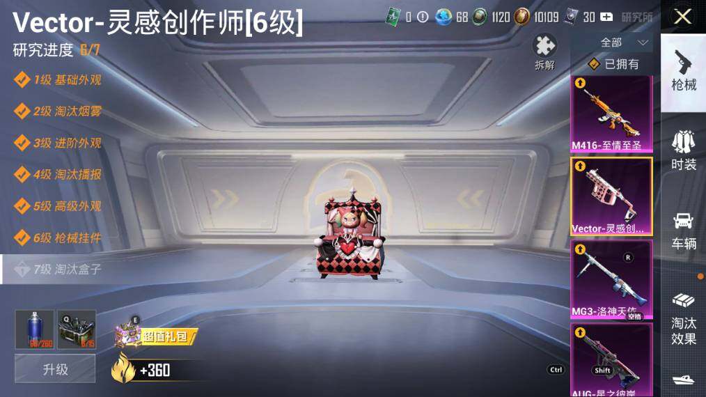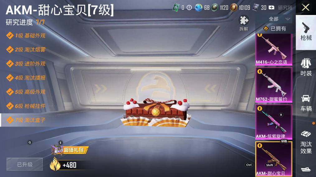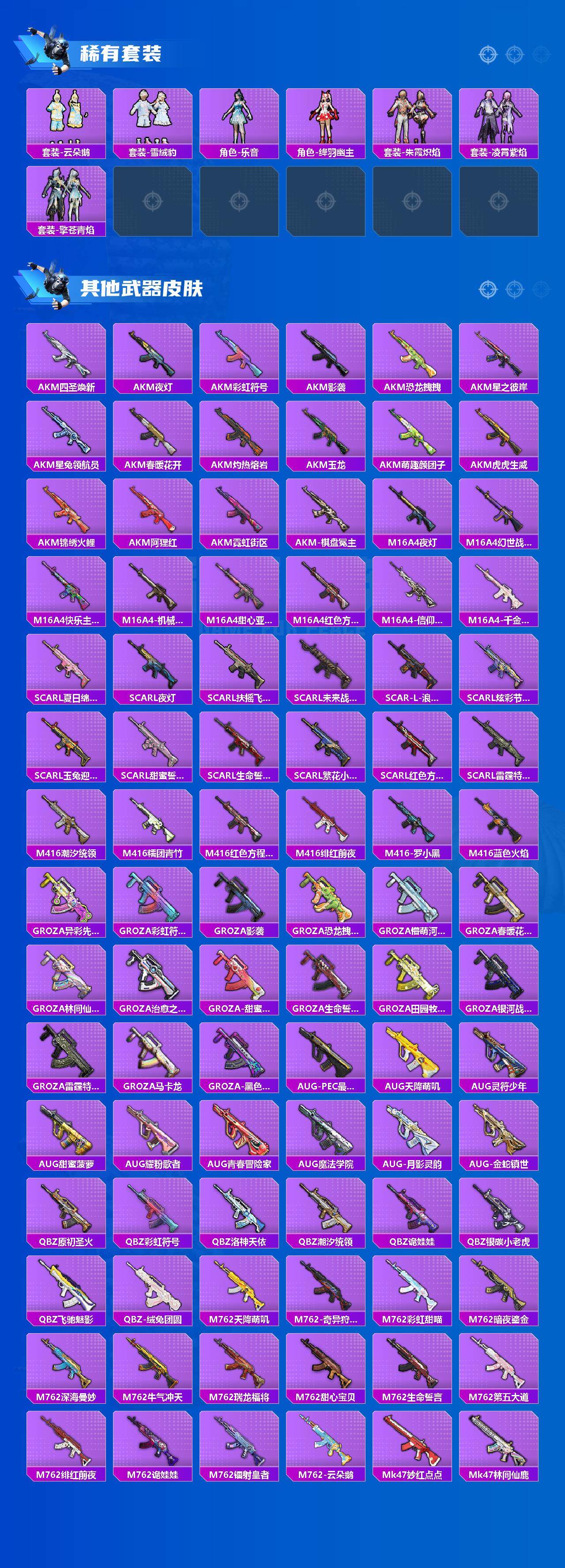 AKM-甜心宝贝,AKM-炫紫旋律,AKM-幽焰骑士,SCAR-L-童趣迷兔,M416-心之恋语,M416-至情至圣,GROZA-香水柠檬,GROZA-镜光银凌,AUG-星之彼岸,M762-甜蜜誓约,UZI-畅跳缤纷,UMP45-量子极限,Vector-灵感创作师,Vector-飒粉甜心,P90-甜蜜草莓,P90-沙丘之主,Kar98K-巳巳如意,M24-镜域双华,AWM-花间之火,M249-猪猪侠,DP-28-千金淑猫,MG3-洛神天依,烟雾弹-丁香清露,破片手榴弹-热量炸弹