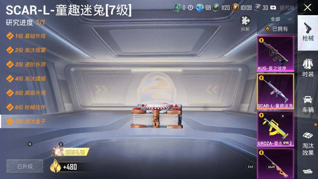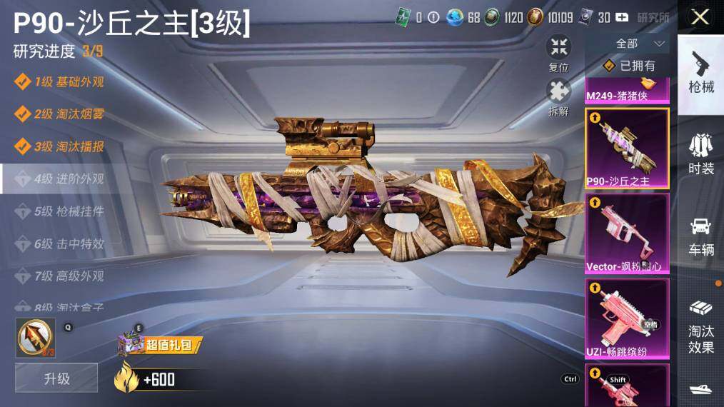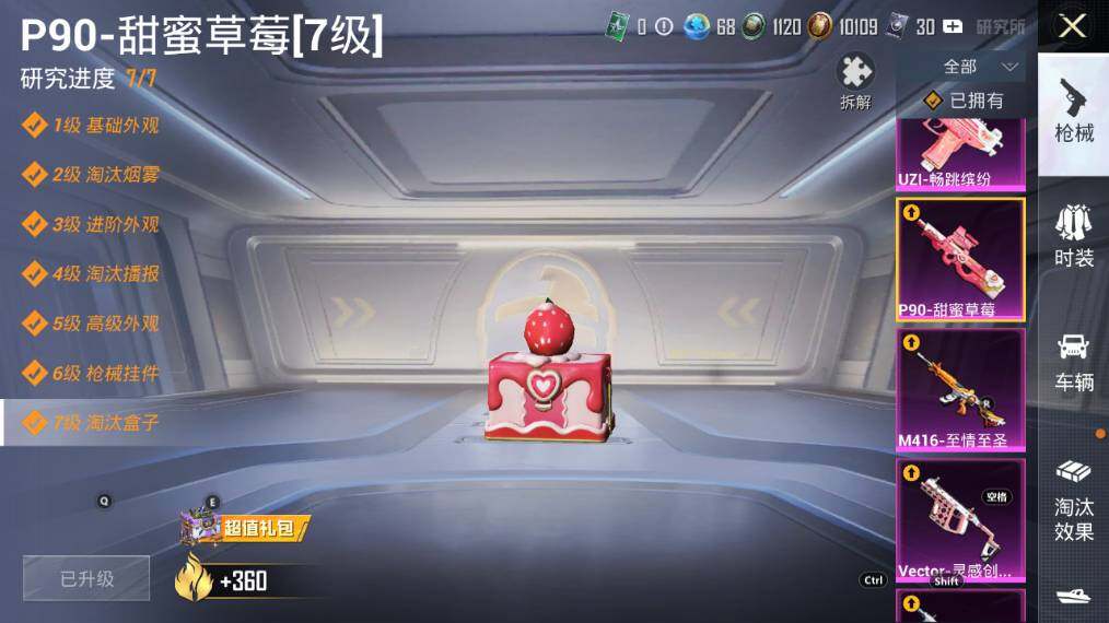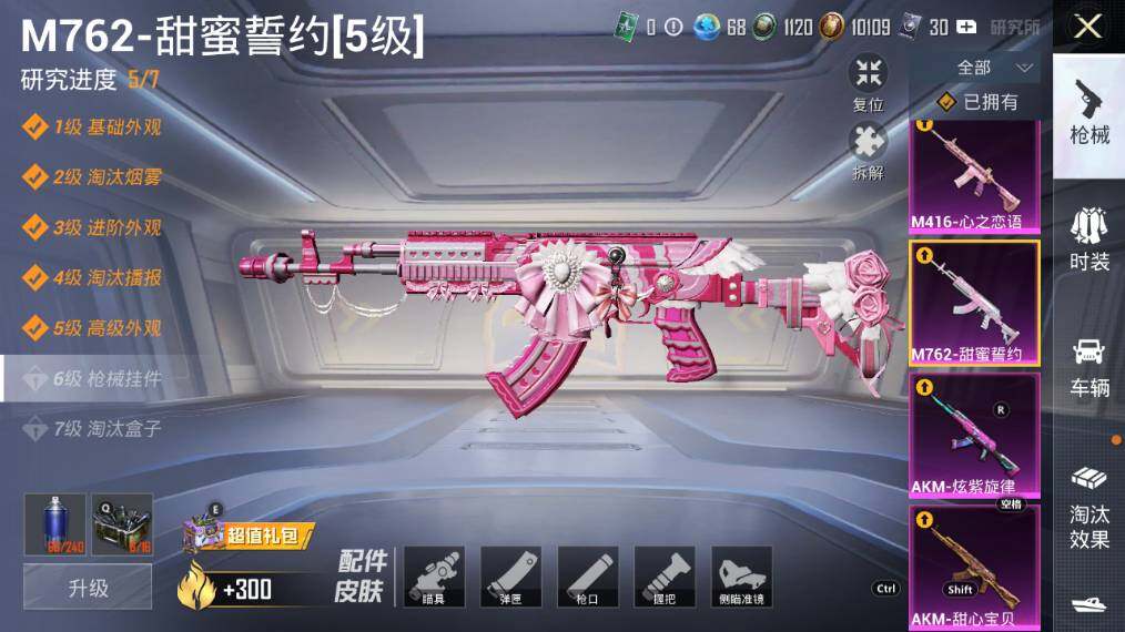 【粉色枪皮等级】:AKM-甜心宝贝(七级),AKM-炫紫旋律(一级),AKM-幽焰骑士(三级),SCAR-L-童趣迷兔(七级),M416-心之恋语(一级),M416-至情至圣(九级),GROZA-香水柠檬(六级),GROZA-镜光银凌(五级),AUG-星之彼岸(五级),M762-甜蜜誓约(五级),UZI-畅跳缤纷(五级),UMP45-量子极限(五级),Vector-灵感创作师(六级),Vector-飒粉甜心(一级),P90-甜蜜草莓(七级),P90-沙丘之主(三级),Kar98K-巳巳如意(五级),M24-镜域双华(二级),AWM-花间之火(五级),M249-猪猪侠(二级),DP-28-千金淑猫(一级),DP-28-豹影疾电(五级),MG3-洛神天依(五级),MG-36-沧焰双生(五级),烟雾弹-丁香清露(四级),破片手榴弹-热量炸弹(六级)