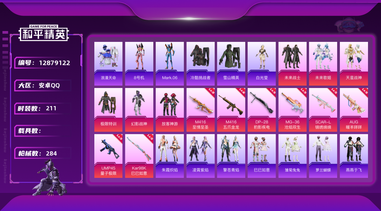 [12879122]9级至情至圣!金鞋都市赤蝎一套!安卓 手Q-无敌战神框-7粉装-8特效枪-0载具-2粉色飞行器-86186热力值-15王牌印记-211套装-284枪皮 【热门品类】:粉装-梦幻火箭,套装-浪漫天命,套装-赤蝎幽灵,套装-都市猎人,套装-派对舞王,套装-深海小丑鱼,套装-奇异狩猎者,角色-8号机,角色-Mark.06,小恶魔头饰 【粉色套装】:粉装-极限特训,粉装-幻影战神,粉装-未来战士,粉装-梦幻火箭,粉装-放客神游,粉装-天星战神,粉装-未来歌姬 【粉色枪皮等级】:SCAR-L-锦绣绵绵(五级),M416-五爪金龙(六级),M416-至情至圣(九级),AUG-暖羊咩咩(五级),UMP45-量子极限(五级),Kar98K-巳巳如意(五级),DP-28-豹影疾电(五级),MG-36-沧焰双生(五级) 【粉色枪皮】:SCAR-L-锦绣绵绵,M416-五爪金龙,M416-至情至圣,AUG-暖羊咩咩,UMP45-量子极限,Kar98K-巳巳如意,DP-28-豹影疾电,MG-36-沧焰双生 【粉色飞行器】:星夜魔法师飞行翼 【粉色降落伞】:深海曼妙降落伞,极限特训降落伞,百万伏特降落伞,未来战士降落伞,梦幻火箭降落伞,洛神天依降落伞,暗星紫秘降落伞,闲梦青缨降落伞,圣堂之誓降落伞,守护天翼降落伞,鬼刀降落伞,异瞳寒姬降落伞 【稀有套装】:套装-巳巳如意,套装-雏菊兔兔,套装-萝兰蝴蝶,套装-燕燕于飞,套装-鱼渊荷华,套装-旋风灵鼠,套装-粉恋花,套装-紫幽梦,套装-蓝冰羽,套装-彩虹兔,套装-云朵鹅,套装-雪绒豹,套装-朱霞炽焰,套装-凌霄紫焰,套装-擎苍青焰 【稀有枪皮】:AKM-夜灯,AKM-奇异狩猎者,AKM-彩虹符号,AKM-春暖花开,AKM-百万伏特,AKM-破晓战魂,AKM-萌趣颜团子,AKM-虎虎生威,AKM-霓虹街区,AKM-龙的传人,M16A4-夜灯,M16A4-幻世战舞者,M16A4-甜心亚梦,M16A4-红色方程式,M16A4-蓝色火焰,SCAR-L-夜灯,SCAR-L-未来战士,SCAR-L-玉兔迎春,SCAR-L-红色方程式,SCAR-L-黄金龙骨,M416-仓鼠灰灰,M416-夜灯,M416-快乐主宰,M416-糯团青竹,M416-蓝色火焰,GROZA-异彩先驱,GROZA-影袭,GROZA-懵萌河马,GROZA-春暖花开,GROZA-治愈之星