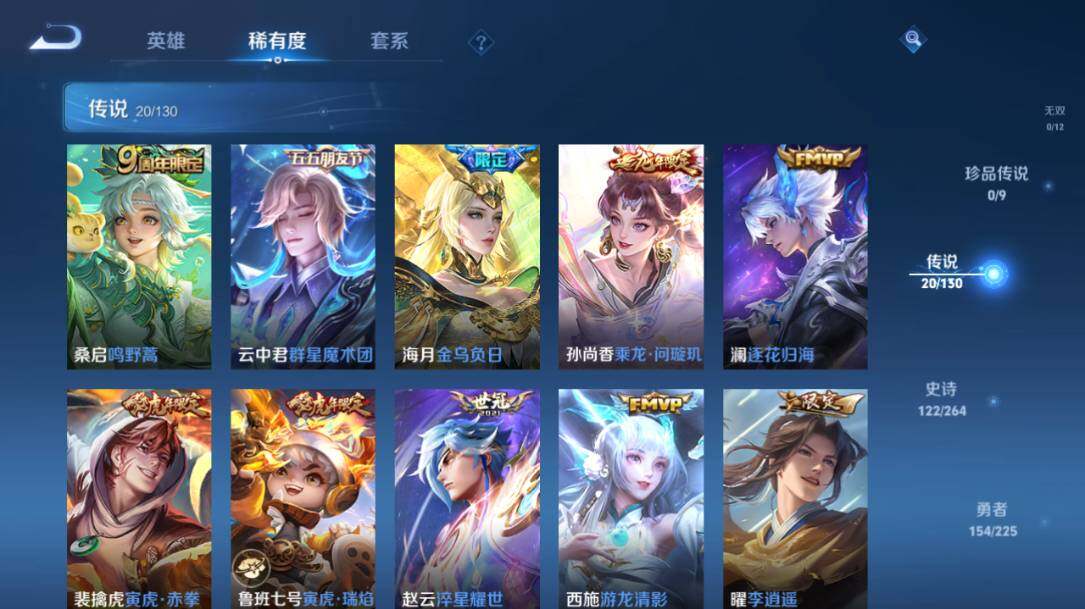 【传说皮肤】:桑启鸣野蒿,云中君群星魔术团,海月金乌负日,孙尚香乘龙问璇玑,澜逐花归海,裴擒虎寅虎赤拳,鲁班七号寅虎瑞焰,赵云淬星耀世,西施游龙清影,曜李逍遥 ,李元芳飞鸢探春,镜炽阳神光,虞姬启明星使,曜云鹰飞将,李信一念神魔,刘备时之恋人,干将莫邪久胜战神,诸葛亮武陵仙君,貂蝉仲夏夜之梦,孙尚香末日机甲
