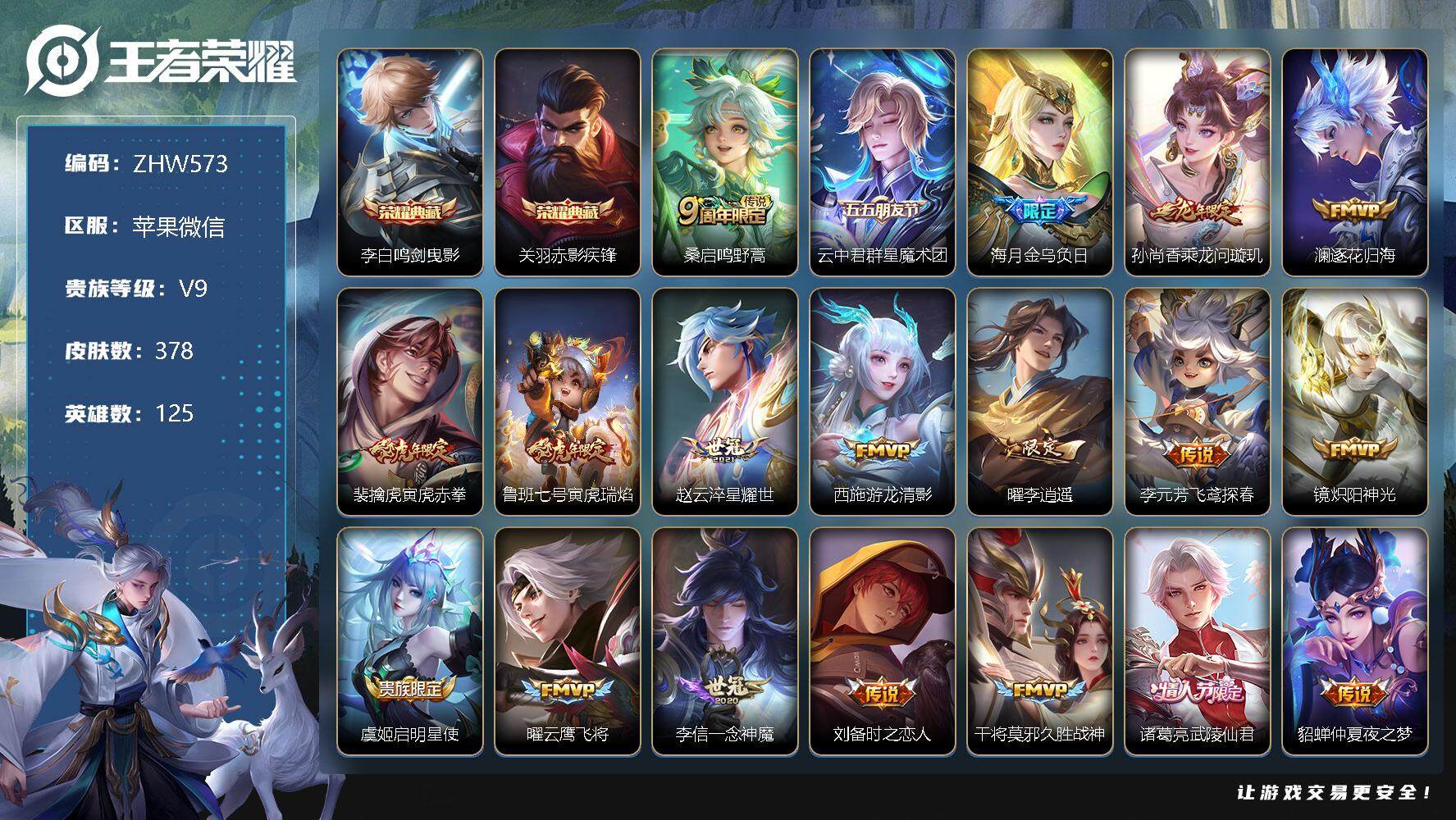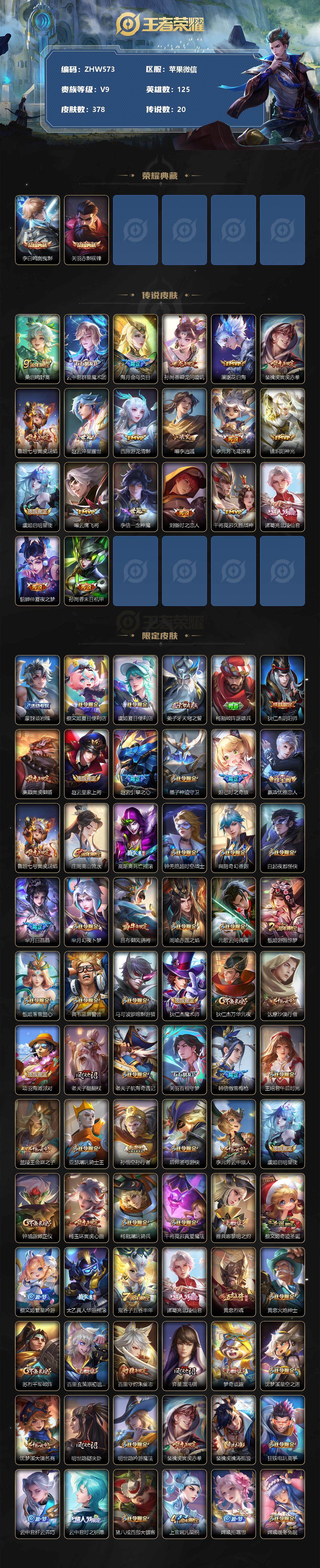 [12879138]打野45段!发育路42段!苹果WX-V9-至尊星耀II段位-125英雄-378皮肤-2典藏-0珍品无双-0无双-0珍品传说-20传说-122史诗 【英雄全皮】:蒙恬全皮,阿古朵全皮,戈娅全皮 【荣耀典藏】:李白鸣剑曳影,关羽赤影疾锋 【传说皮肤】:桑启鸣野蒿,云中君群星魔术团,海月金乌负日,孙尚香乘龙问璇玑,澜逐花归海,裴擒虎寅虎赤拳,鲁班七号寅虎瑞焰,赵云淬星耀世,西施游龙清影,曜李逍遥 ,李元芳飞鸢探春,镜炽阳神光,虞姬启明星使,曜云鹰飞将,李信一念神魔,刘备时之恋人,干将莫邪久胜战神,诸葛亮武陵仙君,貂蝉仲夏夜之梦,孙尚香末日机甲 【限定皮肤】:蒙犽顽岩魄,蔡文姬夏日便利店,虞姬夏日便利店,姜子牙天穹之誓,杨戬破阵退雄兵,狄仁杰阴阳师,廉颇寅虎御盾,赵云皇家上将,赵云引擎之心,墨子神迹守卫,妲己时之奇旅,嬴政优雅恋人,鲁班七号寅虎瑞焰,庄周高山流水,高渐离死亡摇滚,钟无艳超时空战士,扁鹊奇幻香踪,白起夜都怪侠,芈月白晶晶,芈月幻夜卜梦,吕布御风骁将,周瑜赤莲之焰,元歌云间偶戏,甄姬游园惊梦,甄姬落雪兰心,典韦蓝屏警告,马可波罗暗影游猎,狄仁杰魔术师,狄仁杰万华元夜,达摩沙漠行僧,项羽海滩派对,老夫子醍醐杖,老夫子航海奇遇记,关羽百相守梦,韩信傲雪梅枪,王昭君午后时光,兰陵王金庭之子,亚瑟潮玩骑士王,孙悟空孙行者,后羿圣弓游侠,李元芳云中旅人,虞姬启明星使,钟馗驱傩正仪,杨玉环寅虎心曲,杨戬潮玩骑兵,干将莫邪真爱魔法,雅典娜黎明之约,蔡文姬奇迹圣诞,蔡文姬繁星吟游,太乙真人华丽摇滚,鬼谷子五谷丰年,诸葛亮武陵仙君,黄忠烈魂,黄忠火炮绅士,苏烈千军破阵,百里玄策原初追逐者,百里守约朱雀志,弈星混沌棋,梦奇顽趣,沈梦溪星空之诺,沈梦溪大漠名商,明世隐疑决卦,明世隐吟游魔法,裴擒虎寅虎赤拳,裴擒虎擒涛扼浪,狂铁电玩高手,云中君纤云弄巧,云中君时之祈愿,猪八戒西部大镖客,上官婉儿梁祝,嫦娥拒霜思,嫦娥暖冬兔眠,曜李逍遥 ,西施玲珑珍味,鲁班大师探海日志,桑启海盐诗旅,暃星界游侠,戈娅驭风魔法,艾琳女武神,艾琳流音漫舞,司空震地狱燃心,阿古朵江河有灵,张良古海寻踪,蒙犽百解令,蒙恬荣光圣徽,高渐离燃音魔法,妲己灵卜魔法,鬼谷子天穹祈灯,伽罗琥珀纪元,姬小满妄想食味,孙尚香乘龙问璇玑,沈梦溪龙舞盛年,鲁班七号蔬乡物语,李元芳蔬乡物语,海月金乌负日,刘邦剑破天穹,上官婉儿群