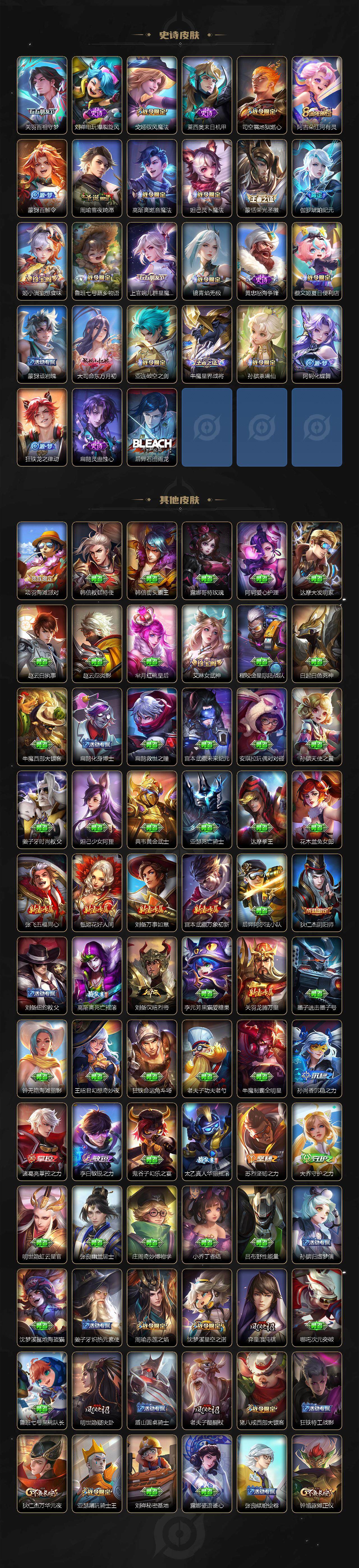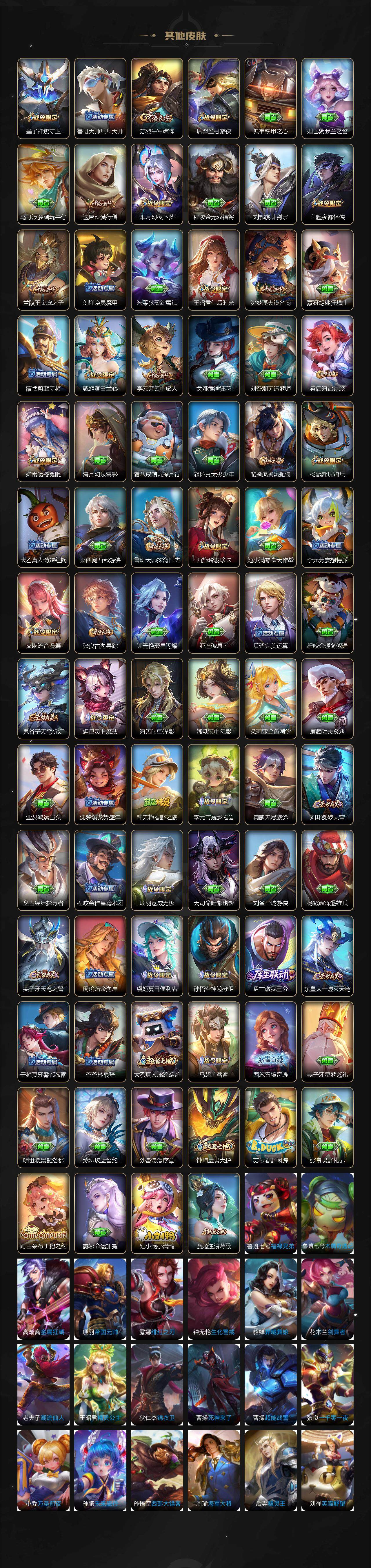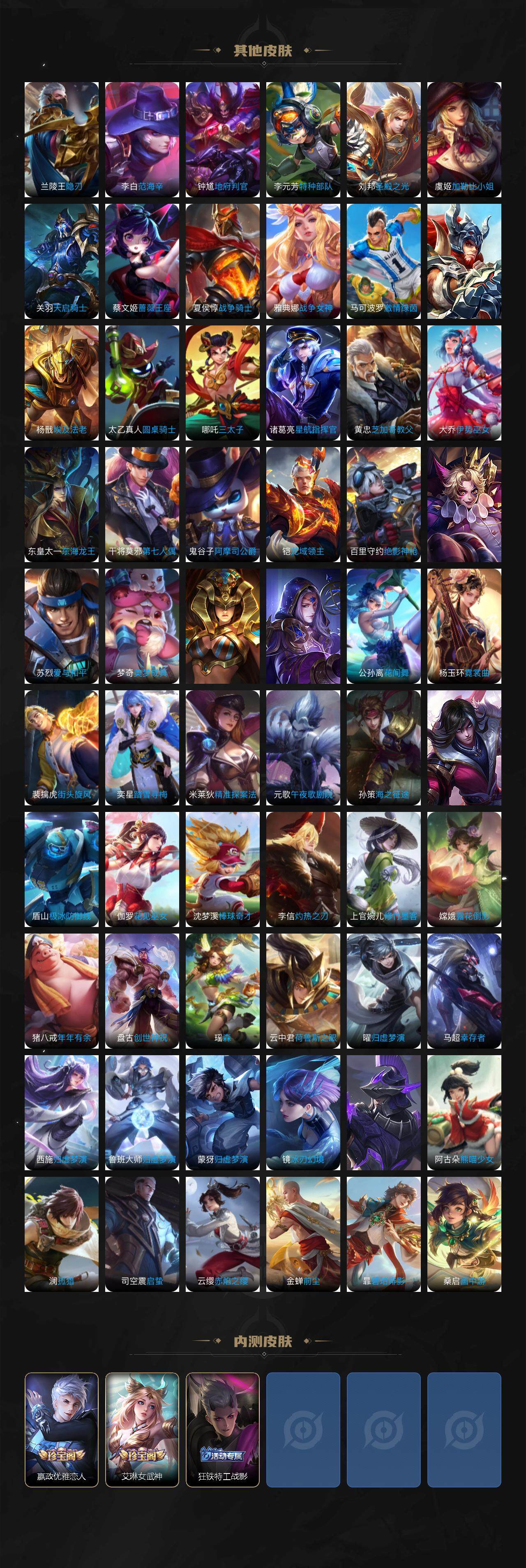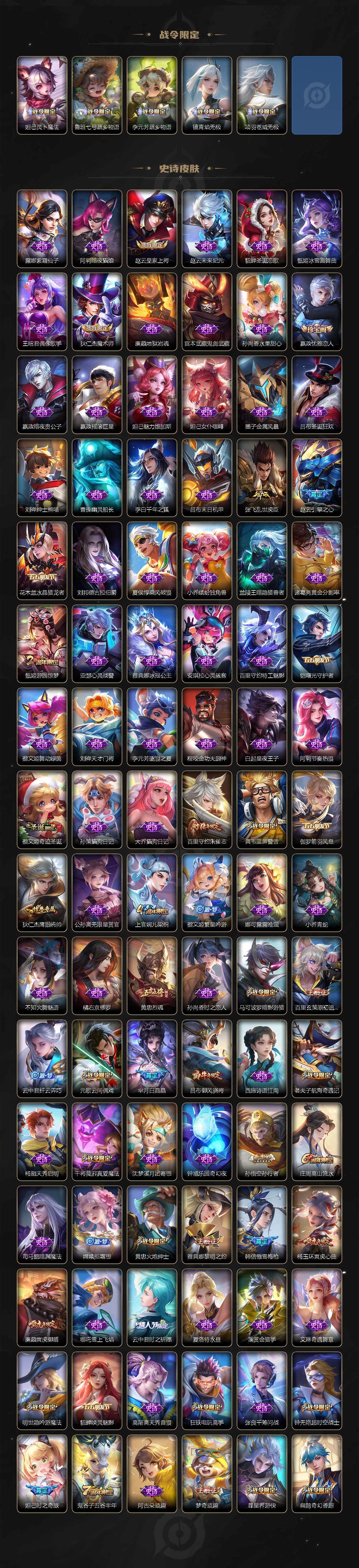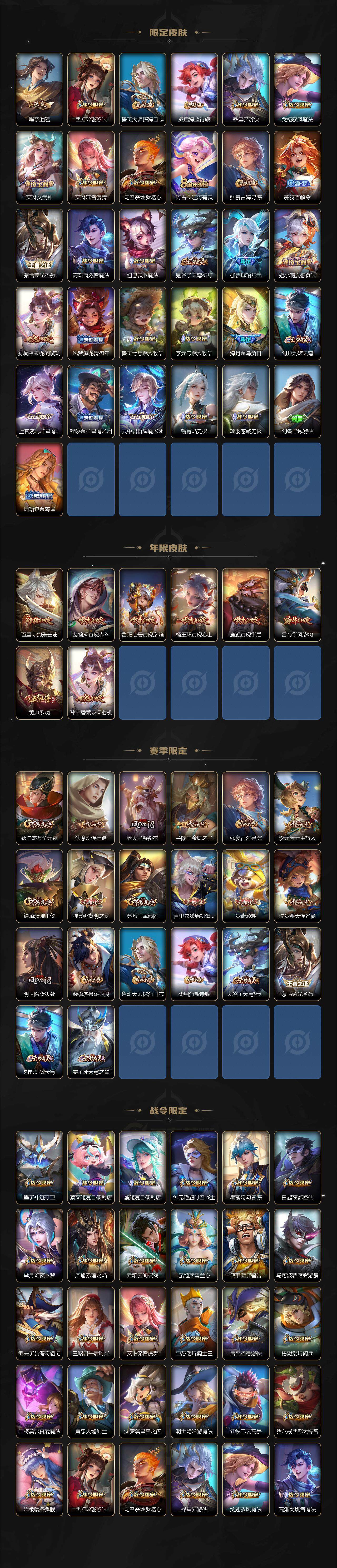 【限定皮肤】:蒙犽顽岩魄,蔡文姬夏日便利店,虞姬夏日便利店,姜子牙天穹之誓,杨戬破阵退雄兵,狄仁杰阴阳师,廉颇寅虎御盾,赵云皇家上将,赵云引擎之心,墨子神迹守卫,妲己时之奇旅,嬴政优雅恋人,鲁班七号寅虎瑞焰,庄周高山流水,高渐离死亡摇滚,钟无艳超时空战士,扁鹊奇幻香踪,白起夜都怪侠,芈月白晶晶,芈月幻夜卜梦,吕布御风骁将,周瑜赤莲之焰,元歌云间偶戏,甄姬游园惊梦,甄姬落雪兰心,典韦蓝屏警告,马可波罗暗影游猎,狄仁杰魔术师,狄仁杰万华元夜,达摩沙漠行僧,项羽海滩派对,老夫子醍醐杖,老夫子航海奇遇记,关羽百相守梦,韩信傲雪梅枪,王昭君午后时光,兰陵王金庭之子,亚瑟潮玩骑士王,孙悟空孙行者,后羿圣弓游侠,李元芳云中旅人,虞姬启明星使,钟馗驱傩正仪,杨玉环寅虎心曲,杨戬潮玩骑兵,干将莫邪真爱魔法,雅典娜黎明之约,蔡文姬奇迹圣诞,蔡文姬繁星吟游,太乙真人华丽摇滚,鬼谷子五谷丰年,诸葛亮武陵仙君,黄忠烈魂,黄忠火炮绅士,苏烈千军破阵,百里玄策原初追逐者,百里守约朱雀志,弈星混沌棋,梦奇顽趣,沈梦溪星空之诺,沈梦溪大漠名商,明世隐疑决卦,明世隐吟游魔法,裴擒虎寅虎赤拳,裴擒虎擒涛扼浪,狂铁电玩高手,云中君纤云弄巧,云中君时之祈愿,猪八戒西部大镖客,上官婉儿梁祝,嫦娥拒霜思,嫦娥暖冬兔眠,曜李逍遥 ,西施玲珑珍味,鲁班大师探海日志,桑启海盐诗旅,暃星界游侠,戈娅驭风魔法,艾琳女武神,艾琳流音漫舞,司空震地狱燃心,阿古朵江河有灵,张良古海寻踪,蒙犽百解令,蒙恬荣光圣徽,高渐离燃音魔法,妲己灵卜魔法,鬼谷子天穹祈灯,伽罗琥珀纪元,姬小满妄想食味,孙尚香乘龙问璇玑,沈梦溪龙舞盛年,鲁班七号蔬乡物语,李元芳蔬乡物语,海月金乌负日,刘邦剑破天穹,上官婉儿群