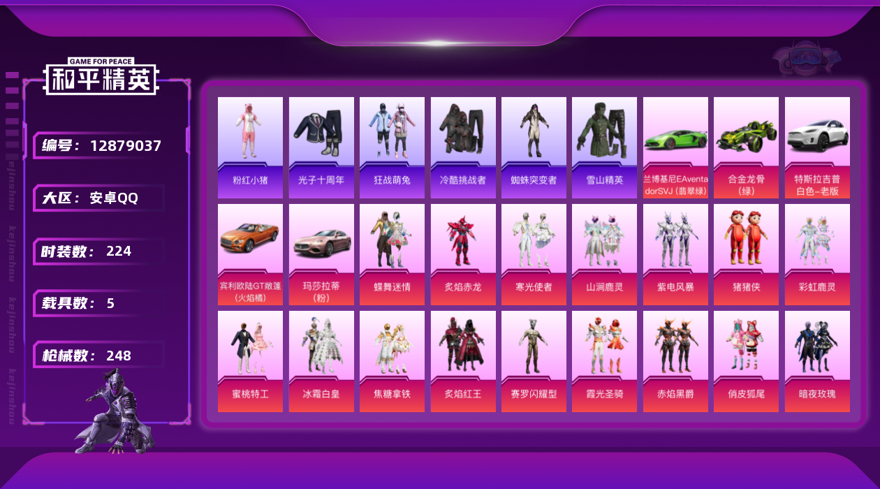- [12171886]MQ587【商品标题】:安卓 手Q-2粉装-6特效枪-0载具-0粉色飞行器-46592热力值-7王牌印记-137套装-151枪皮 【热门品类】:套装-浪漫天命,套装-派对舞王,套装-金羽特工,套装-龟仙人,角色-Mark.06 【粉色套装】:粉装-金丰海韵,粉装-星穹咏叹调 【粉色枪皮等级】:M416-电玩时刻(四级),GROZA-镜光银凌(五级),AUG-暖羊咩咩(五级),UMP45-量子极限(五级),Kar98K-巳巳如意(五级),DP-28-圣堂之誓(五级) 【粉色枪皮】:M416-电玩时刻,GROZA-镜光银凌,AUG-暖羊咩咩,UMP45-量子极限,Kar98K-巳巳如意,DP-28-圣堂之誓 【粉色降落伞】:暗夜玫瑰降落伞,精灵梦叶罗丽降落伞,鬼刀降落伞,赛博古神降落伞,月下星之子降落伞 【稀有套装】:套装-龟仙人,套装-巳巳如意,套装-雏菊兔兔,套装-萝兰蝴蝶,套装-小熊娃娃,套装-糖糖葫芦,套装-青团波波,套装-棉花软糖,角色-摩登魅猫,套装-燕燕于飞,套装-鱼渊荷华,角色-风玲,套装-新风雅兰,套装-粉恋花,套装-紫幽梦,套装-蓝冰羽 【稀有枪皮】:AKM-江南烟雨,AKM-破晓战魂,AKM-虎虎生威,M16A4-幻世战舞者,SCAR-L-夜灯,SCAR-L-玉兔迎春,SCAR-L-红色方程式,M416-糯团青竹,M416-红色方程式,M416-蓝色火焰,GROZA-彩虹符号,GROZA-田园牧歌,AUG-天降萌叽,AUG-甜蜜菠萝,AUG-耀粉歌者,AUG-月影灵韵,QBZ-洛神天依,M762-天降萌叽,M762-彩虹符号,M762-牛气冲天,M762-瑞龙福将,M762-萌物绒绒,G36C-暗夜玫瑰,AC-VAL-天降萌叽,蜜獾-天降萌叽,蜜獾-娇憨猪猪,UZI-天降萌叽,UZI-娇憨猪猪,UZI-炫彩节奏,UMP45-夜灯,UMP45-生命誓言,Vector-焰鹰斗篷,Vector-田园牧歌,Vector-创世·救赎,P90-巳巳如意,Kar98K-红色方程式,M24-樱桃泡泡,AWM-焰鹰斗篷,SKS-炫彩节奏,VSS-田园牧歌,Mini14-旋转彩虹,Mini14-炫彩节奏,Win94-瑞龙福将,SLR-娇憨猪猪,MK20-H-墨染幽兰,MK20-H-圣域龙灵,S686-彩虹符号,S686-红色方程式,S686-巳巳如意,S1897-炫
