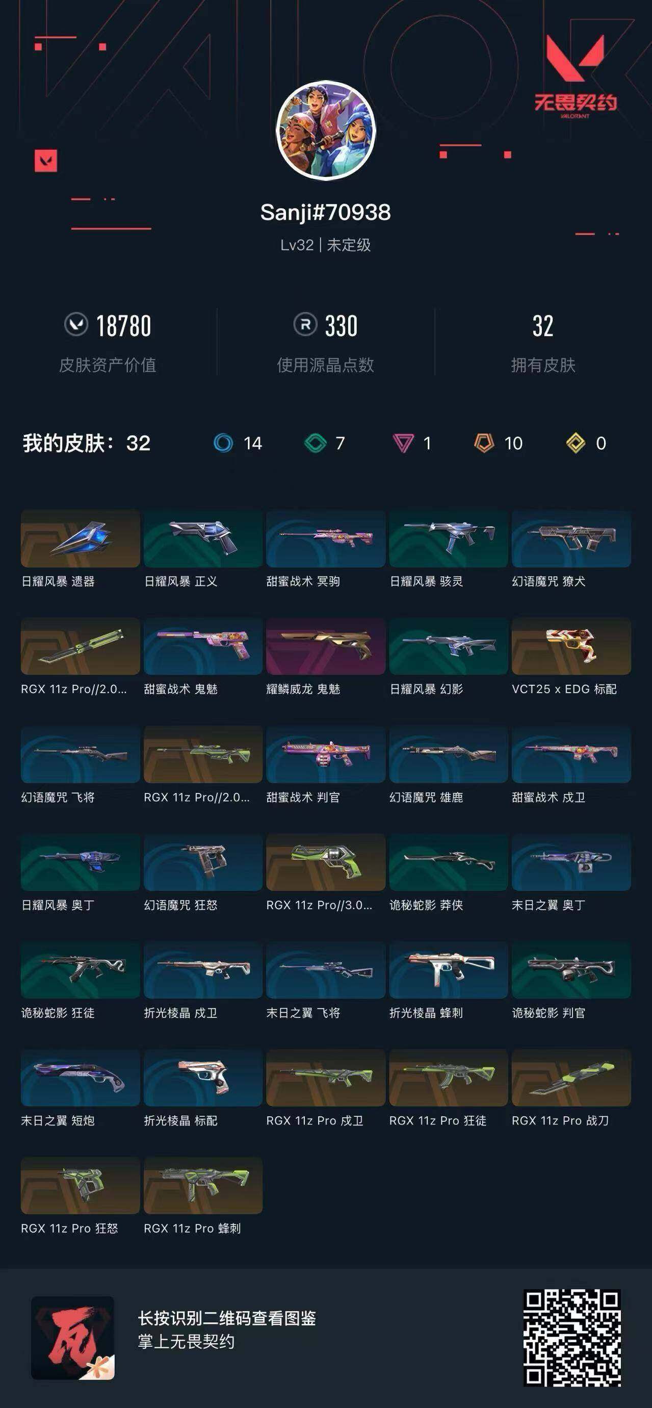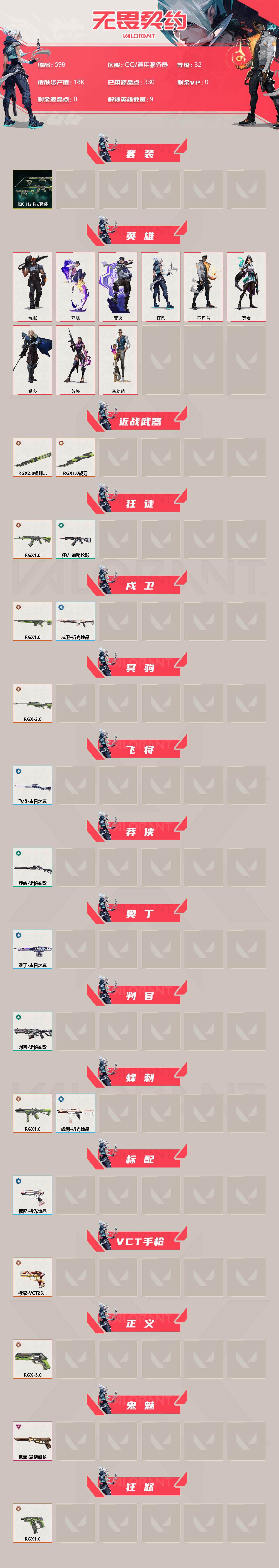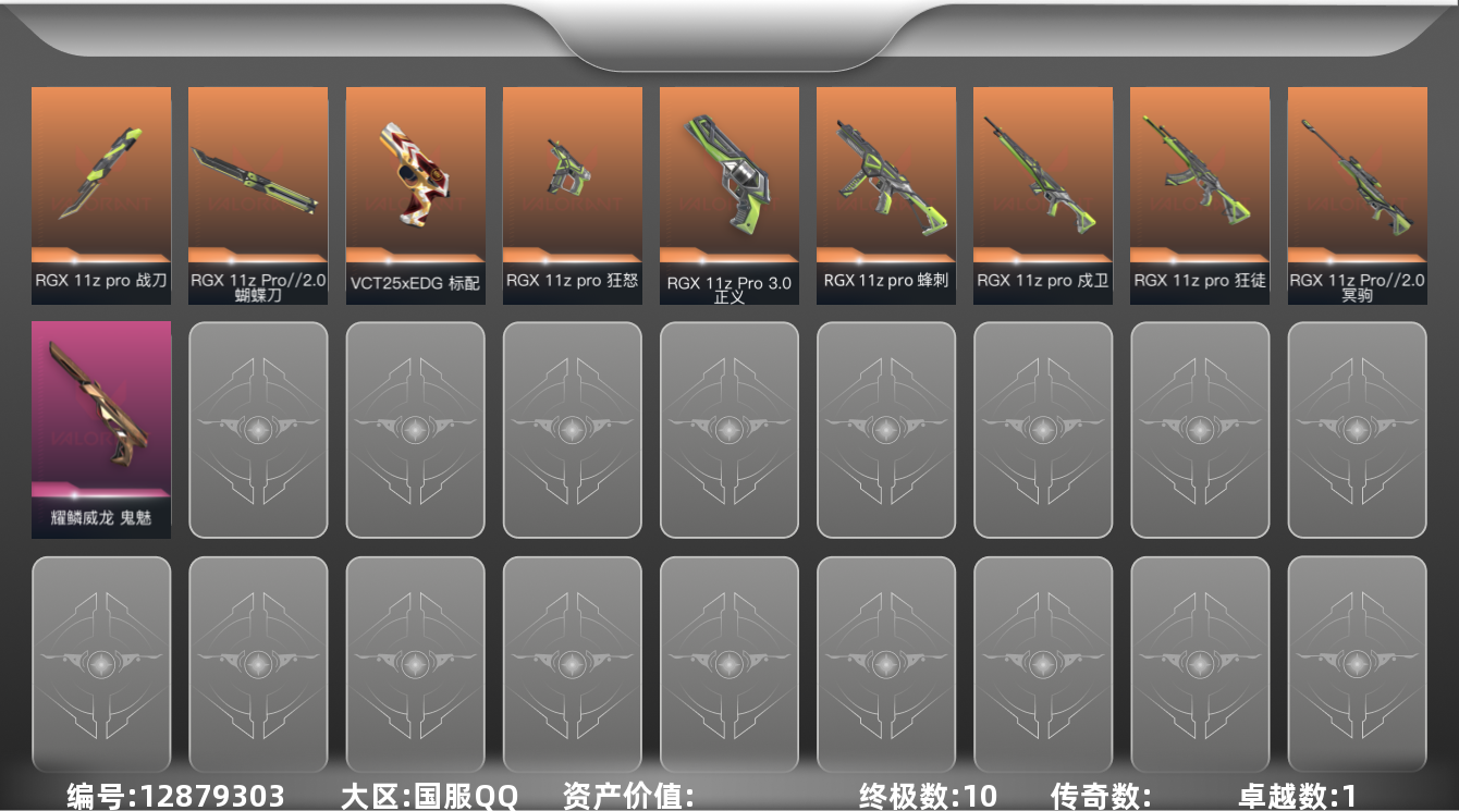 [12879303]【套装】:RGX 11z Pro套装 【英雄】:炼狱,暮蝶,壹决,捷风,不死鸟,贤者,猎枭,芮娜,尚勃勒 【近战 武器】:近战武器-RGX 11z Pro 战刀,近战武器-RGX 11z Pro//2.0 蝴蝶刀 【狂徒】:狂徒-RGX 11z Pro,狂徒-诡秘蛇影 【戍卫】:戍卫-RGX 11z Pro,戍卫-折光棱晶 【冥驹】:冥驹-RGX 11z Pro//2.0 【飞将】:飞将-末日之翼 【莽侠】:莽侠-诡秘蛇影 【奥丁】:奥丁-末日之翼 【判官】:判官-诡秘蛇影 【蜂刺】:蜂刺-RGX 11z Pro,蜂刺-折光棱晶 【标配】:标配-折光棱晶 【VCT手枪】:标配-VCT25 x EDG 【正义】:正义-RGX 11z Pro//3.0 【鬼魅】:鬼魅-耀鳞威龙 【狂怒】:狂怒-RGX 11z Pro 【短炮】:短炮-末日之翼 【卡面】:树懒大作战 卡面,无畏契约GO!第一卷:零 卡面,无垠星环 卡面,《双城之战》金克丝 卡面,代号红色 卡面,新兵报到 卡面,V契约 卡面,无畏契约 卡面 【喷漆】:别挡我吃球! 喷漆,买装还是存钱 喷漆,放下武器 喷漆,胜利属于无畏契约 喷漆,GLHF 喷漆,无畏契约 喷漆 【挂饰】:动力机箱 挂饰,VCT x EDG 挂饰,天外飞客 挂饰,无畏契约 纪念币 挂饰