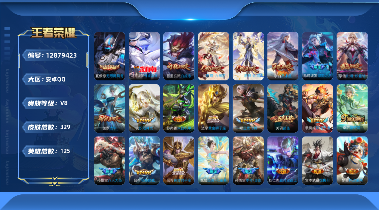 [12879423]安卓Q-V8-至尊星耀I段位-125英雄-329皮肤-1典藏-0珍品无双-0无双-1珍品传说-27传说-92史诗